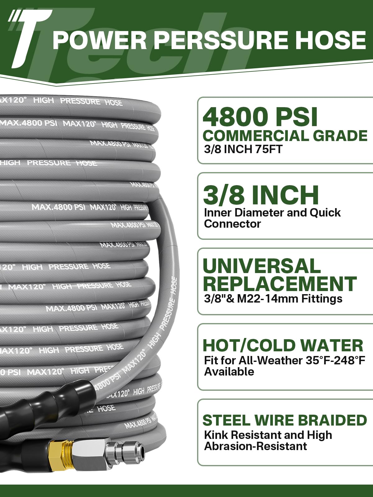 【Commercial Grade Pressure Washer Hose】3/8" power washer hose is made of high-quality synthetic rubber & tensile steel braid, MAX working pressure can reach 4800 PSI with 16000 PSI burst pressure, Withstands high temperatures up to 120℃ /248°F. designed for a commercial and industrial pressure washer for homework and business.