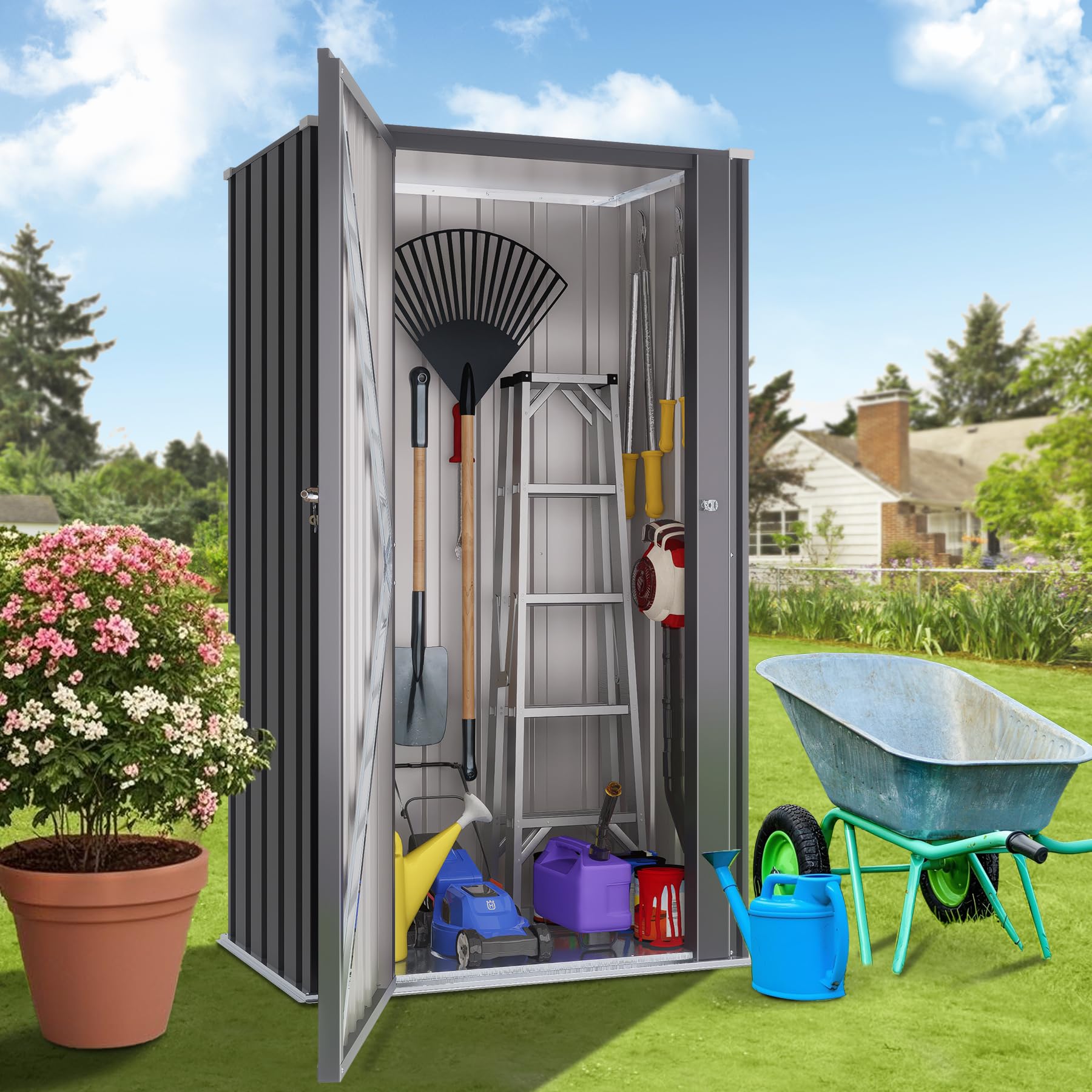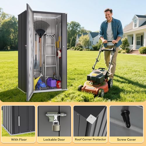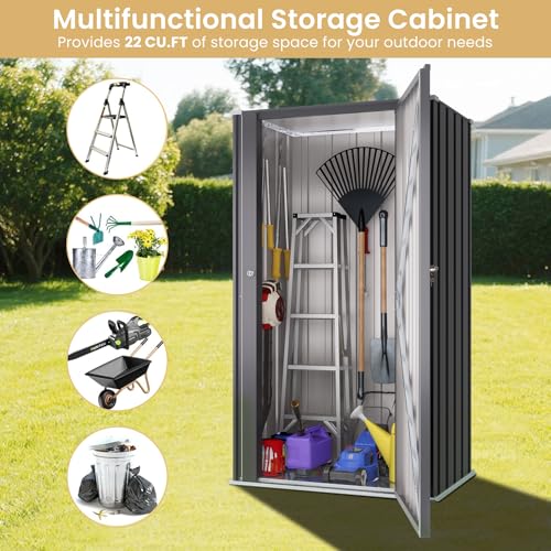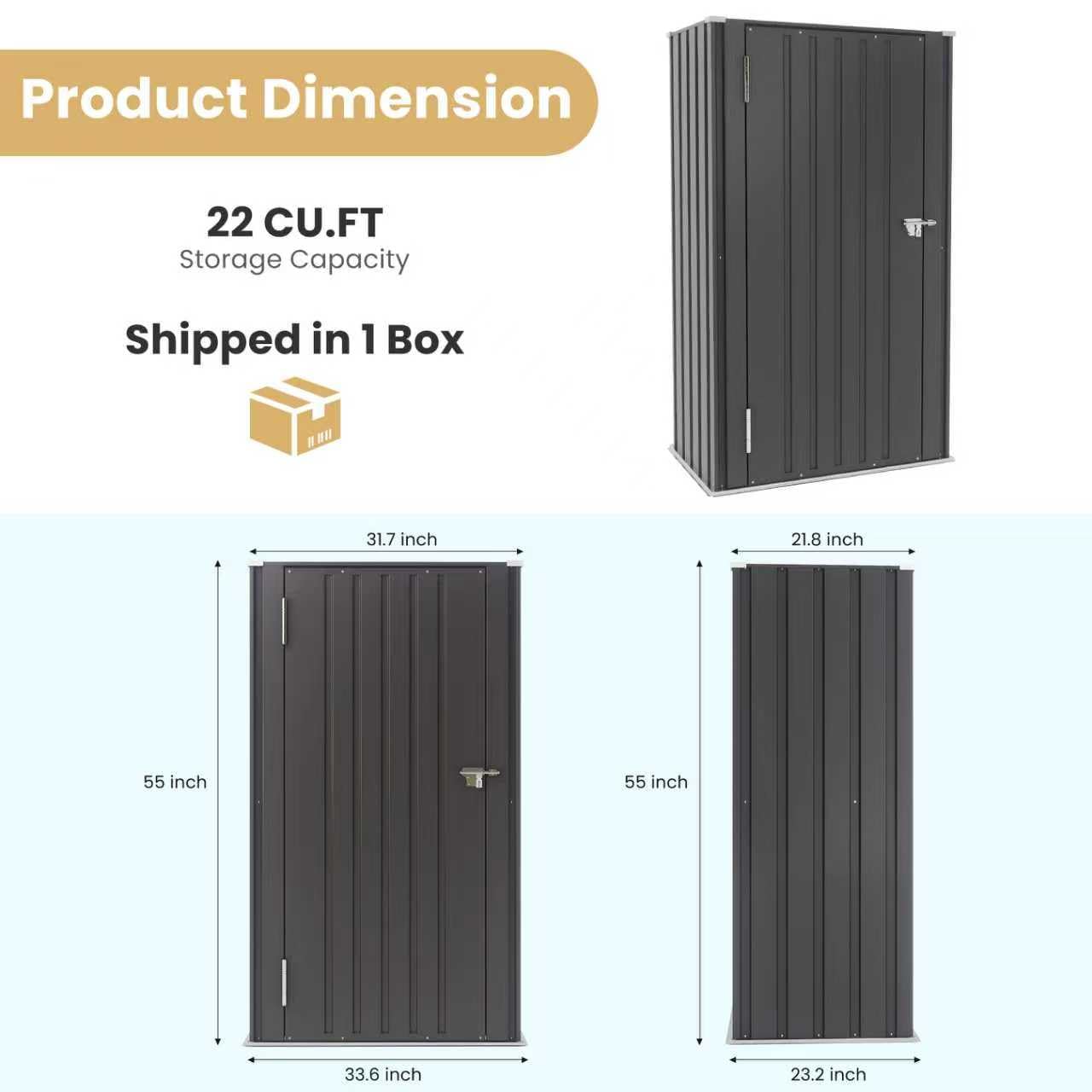 22 Cu.Ft of Secure Space – Indoors or Out, Built to Last! Feature: Greesum 55'' Metal Storage Shed, 22 Cuft Storaged Cabinet with Lockable Door, Functional Tool Organization Cabinets without Shelves, for Home, Backyard, Patio, Garage, Lawn, Black Specification: Material: Metal. Package Dimensions:58.27"(L) x 23.62"(W) x 2.76"(H) Package Weight:45.08 lbs Package includes: A tool kit A Metal Outdoor Storage Shed A manual of installation and usage Notice: There may be some differences between photos and items in term of color because the influence of lighting during the shooting or the settings of the computers’ display screen.