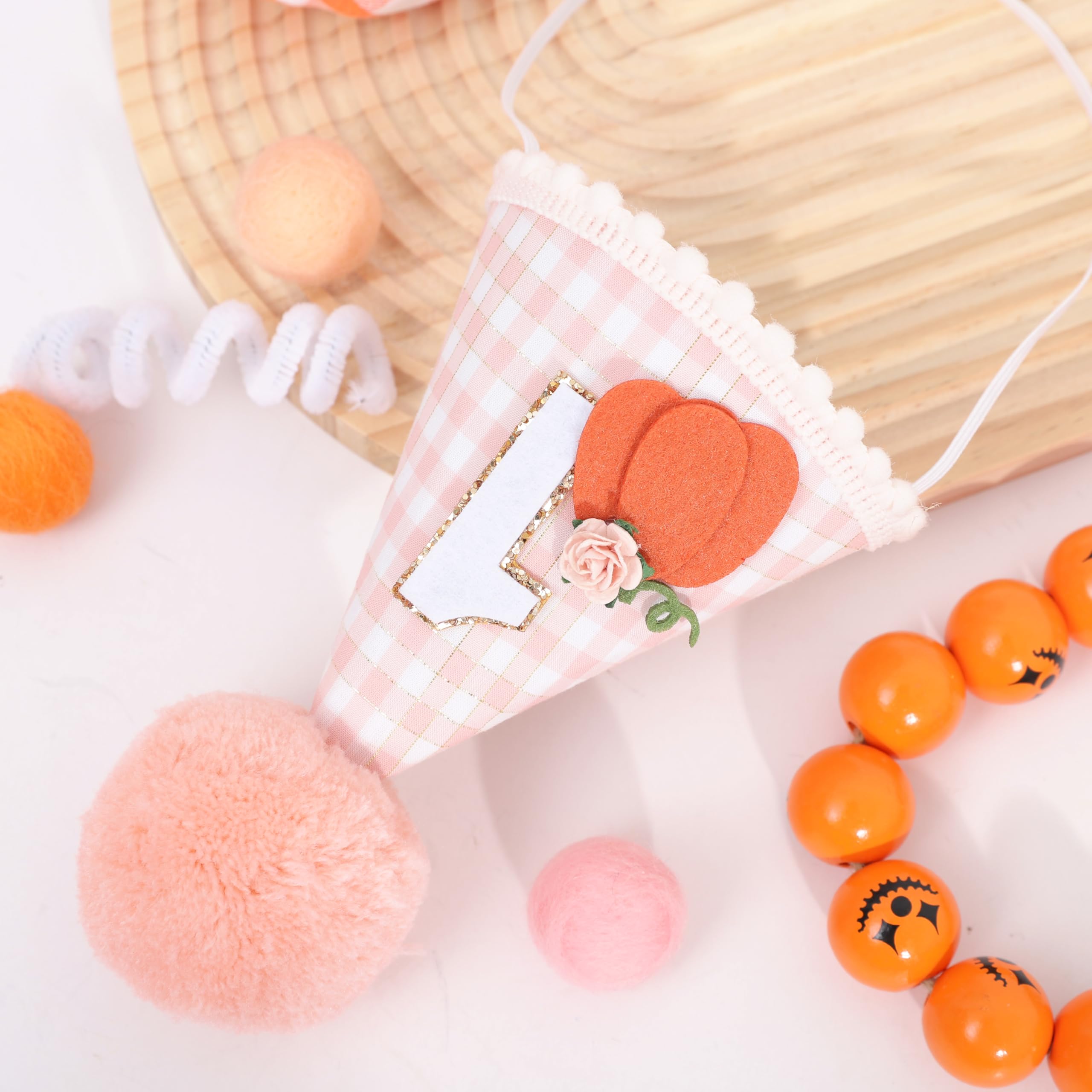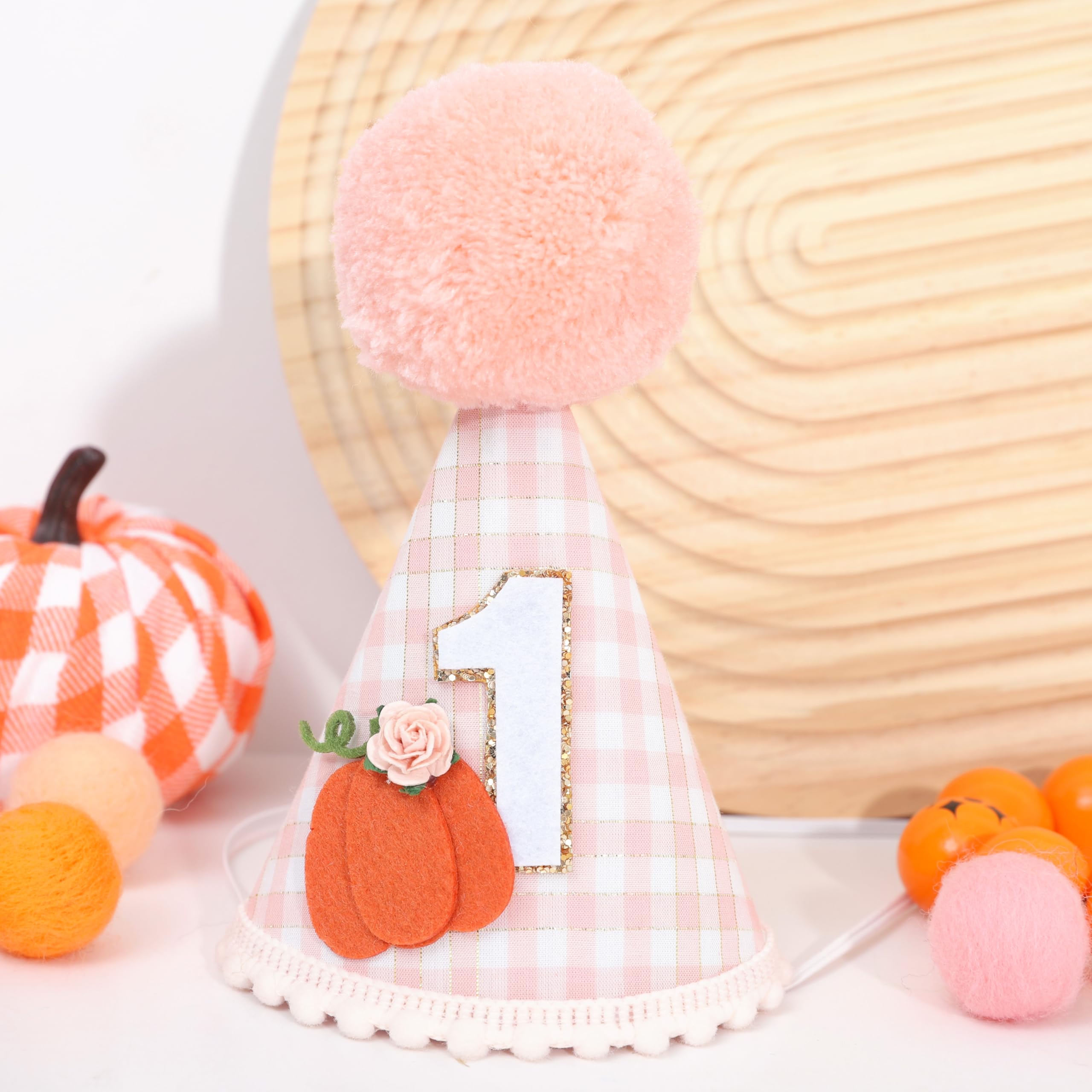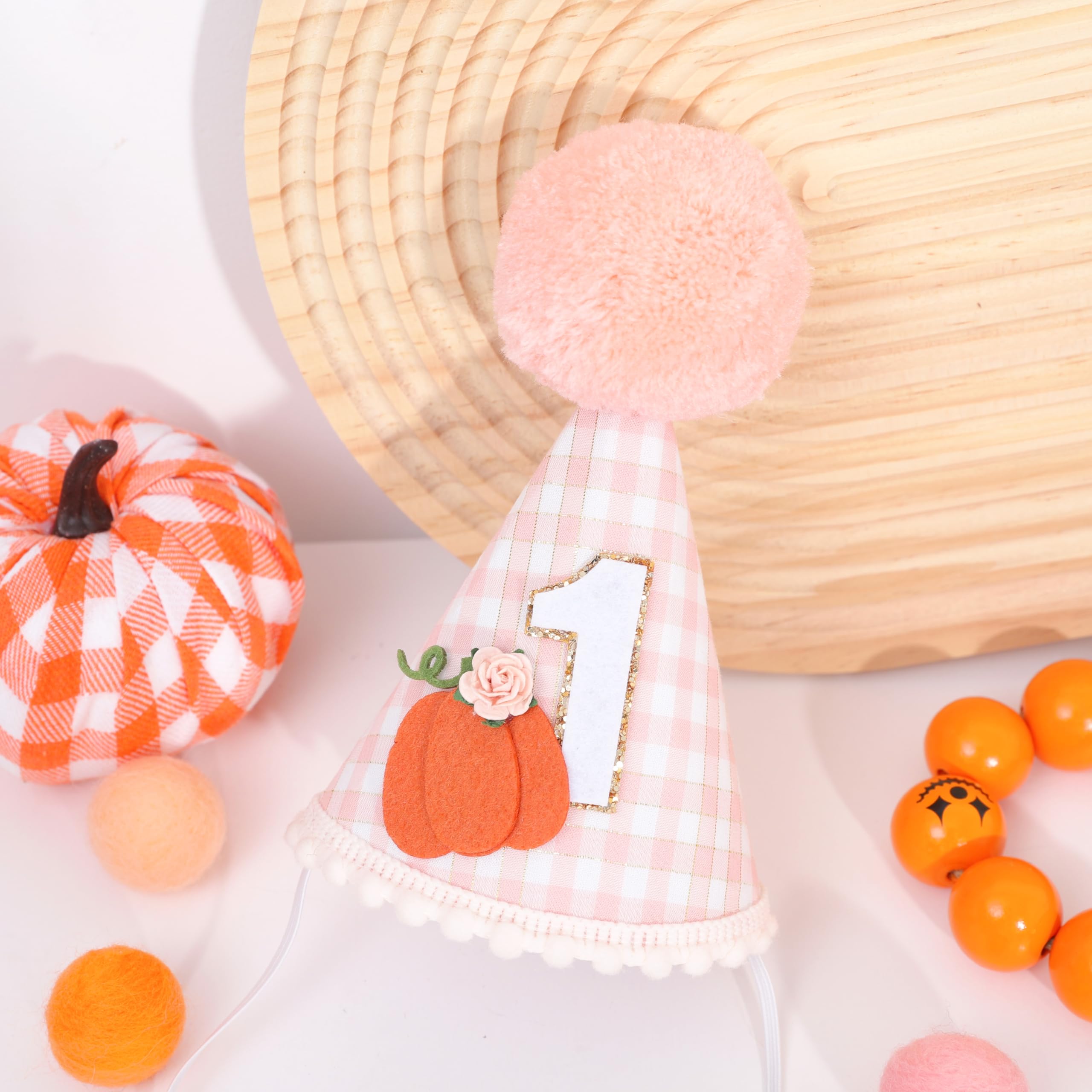 ADORABLE DESIGN: This 1st birthday hat features a cute pumpkin design with a pink orange and white checkered pattern, it will attract your little girl's attention, the soft, fluffy pom-pom on top adds an extra touch of charm