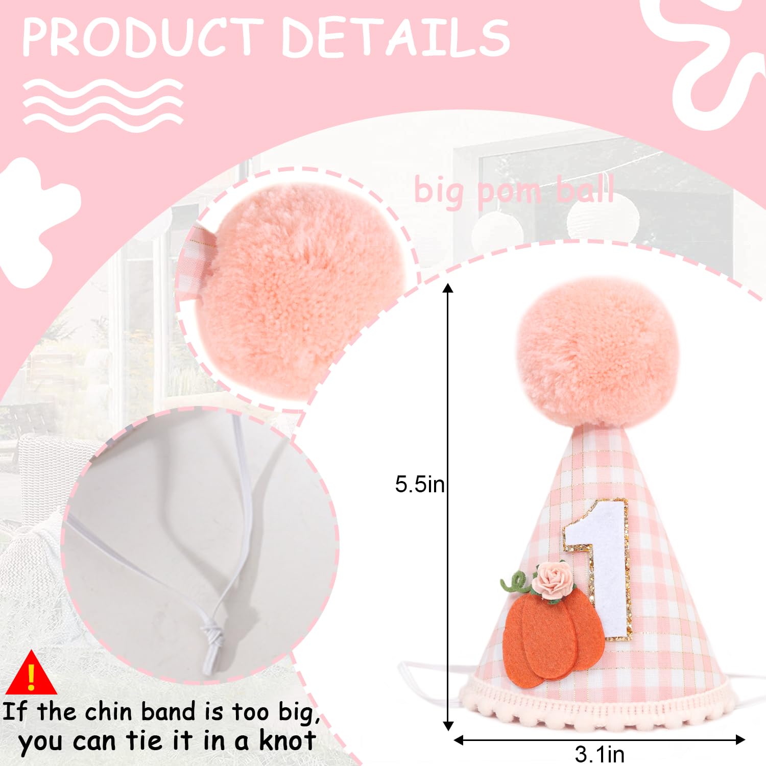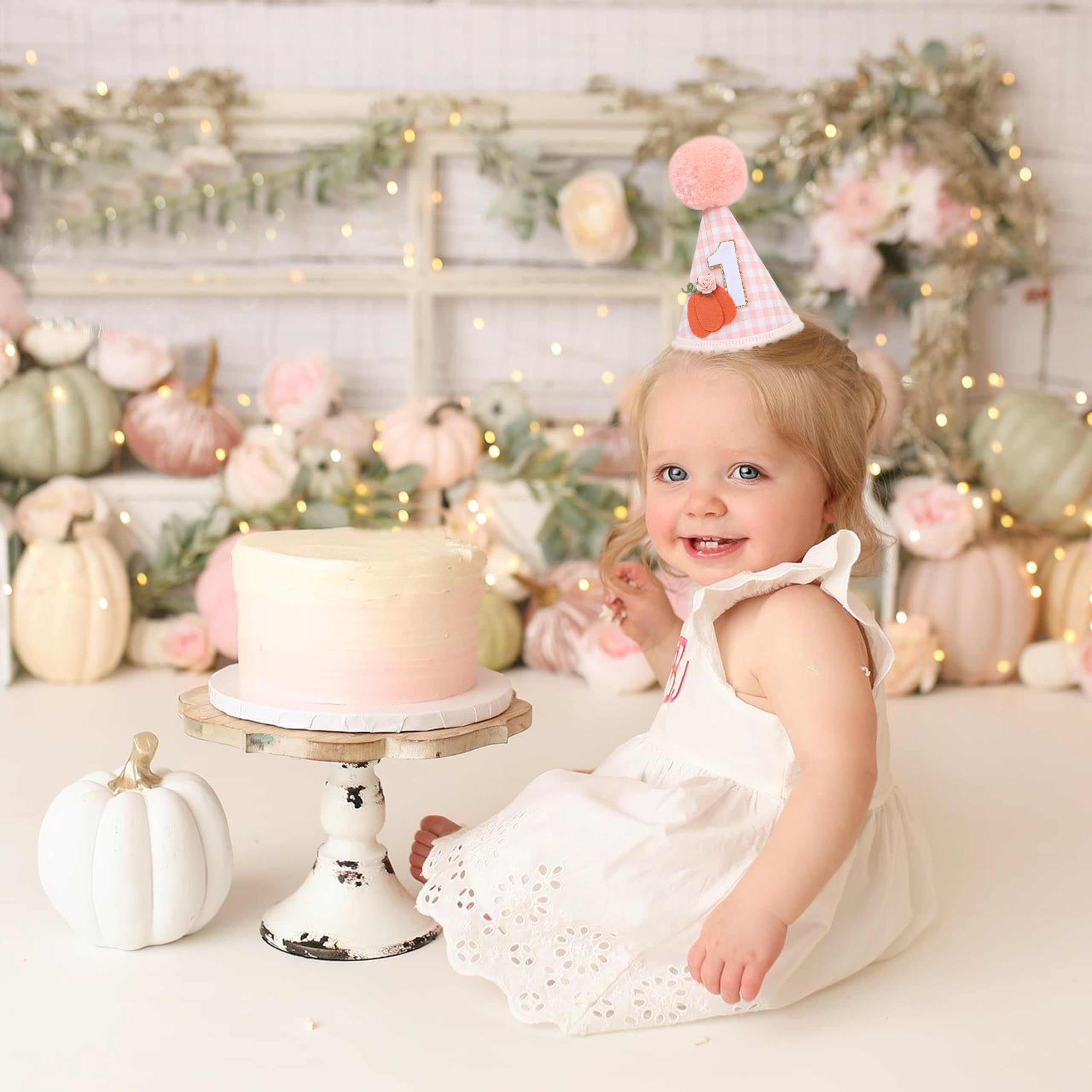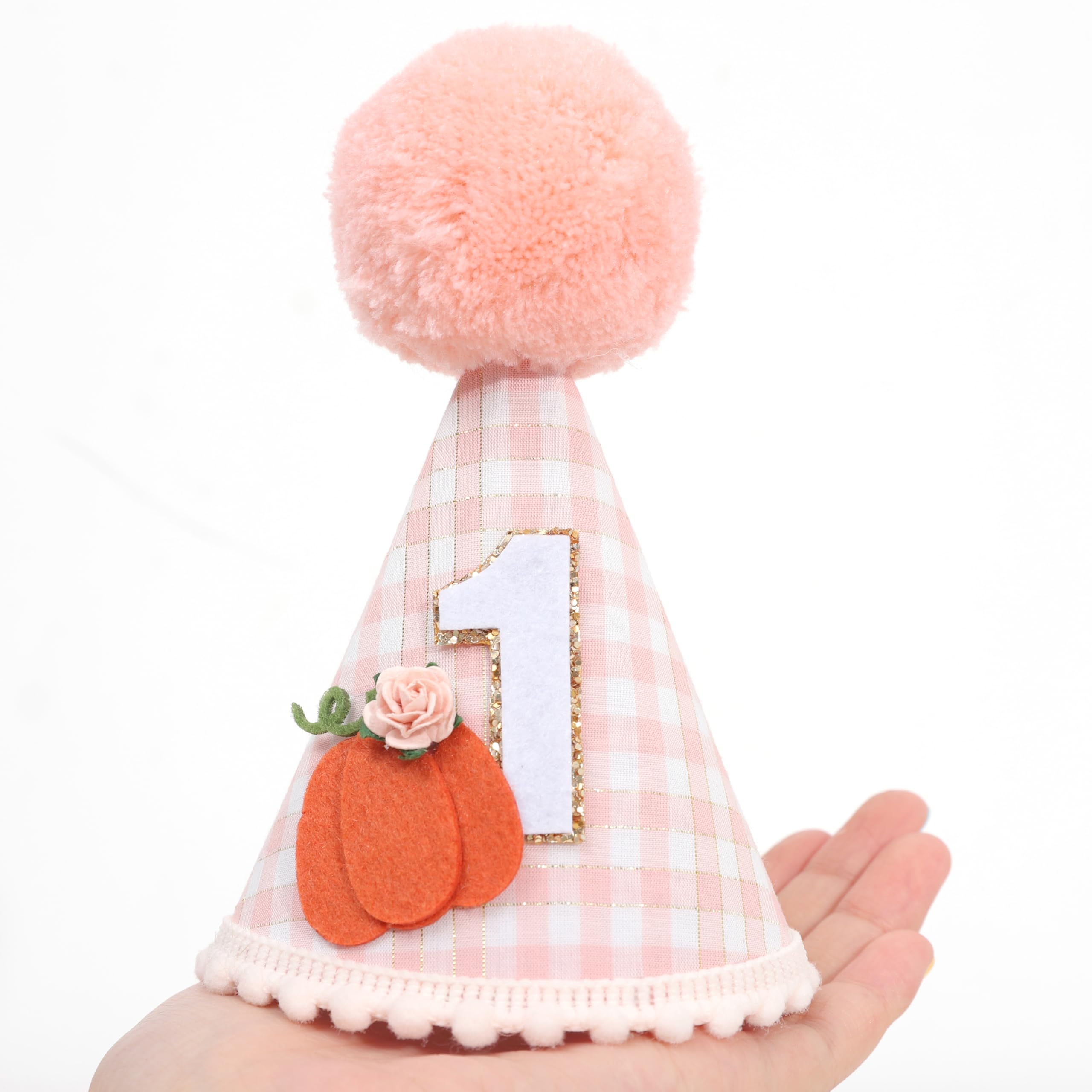 ADORABLE DESIGN: This 1st birthday hat features a cute pumpkin design with a pink orange and white checkered pattern, it will attract your little girl's attention, the soft, fluffy pom-pom on top adds an extra touch of charm