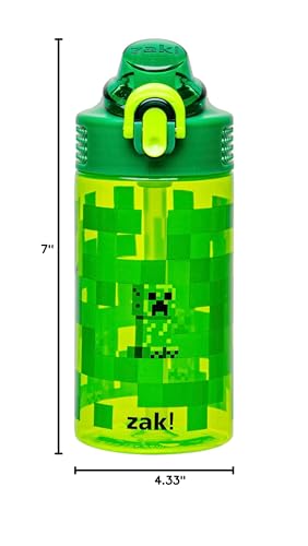 Let kids enjoy hydration with a fun water bottle by Zak Designs! Reusable and Durable Material: Reusable water bottles will last wash after wash—good news for you and the environment! The 16 oz water bottle is made of PP plastic, durable enough for kids to use every day and bring on any adventure. Leak-Proof Lid: The lid screws on securely and won't leak when the spout is closed, though water flows for easy drinking when the spout is open. The easy-open button has a flip-up lock to keep it from activating accidentally. On the Go: The water bottle has a built-in carrying loop on the lid for easy transportation, and with the spout cover to keep the spout clean and closed, it can be tossed into a bag for worry-free travel. Specifications: 16 oz capacity. Made of durable plastic. Dishwasher safe, do not microwave. Length: 4.33-inch, Width: 2.78-inch, Height: 7-inch. Character: Creeper (Minecraft).