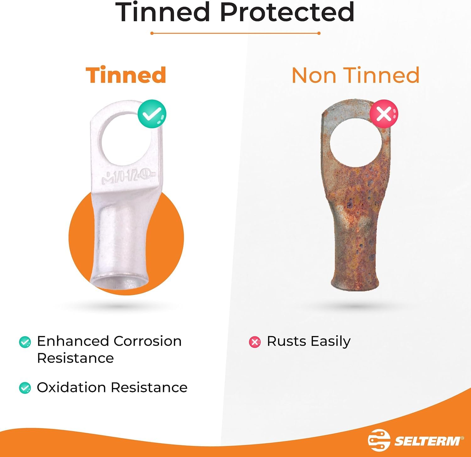 WIDE APPLICATIONS - Selterm tinned copper lugs wire connectors have a close end pad design, keeping electrical components, battery and wire cables safe and act as waterproof wire connectors which prevents solder from leaking during installation of lugs or while using as a heat shrink wire connectors for your battery in Marine, Golf Carts, RV's, Automotive and other outdoor equipment.