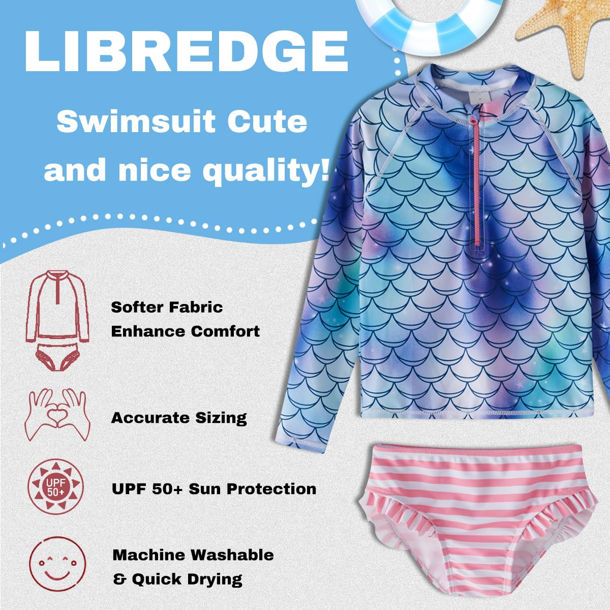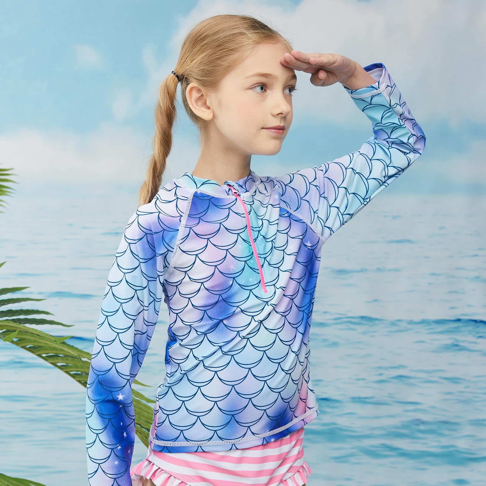 【2 Piece Girls Swimsuit Set】 Consists of long sleeve rash guard shirt and elastic waist swimming shorts.long sleeve shirts with half zip,make it easier to put on and take off the beachwear