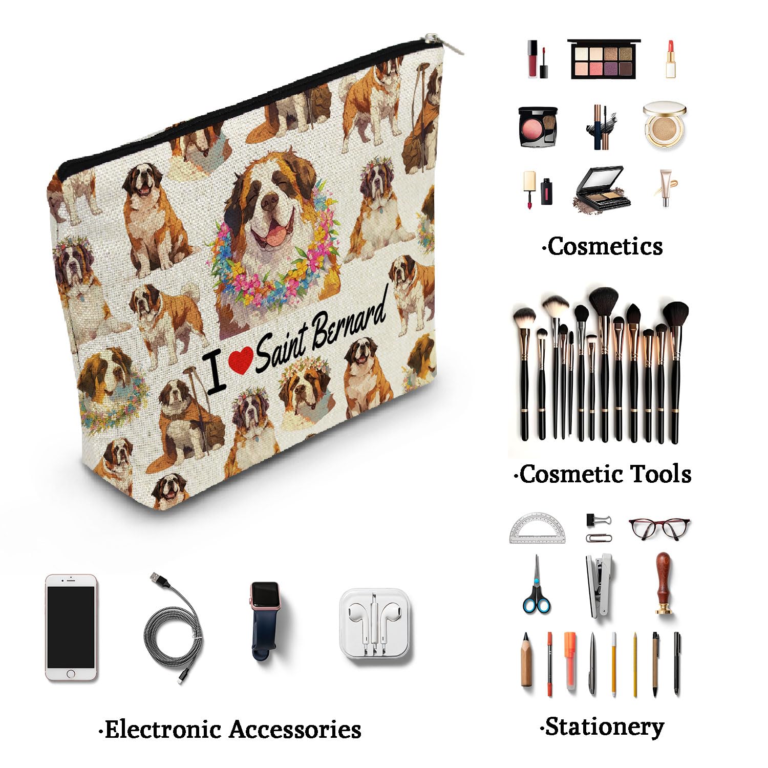 5.The Funny Saint Bernard Makeup Bag has plentiful usage scenarios. For example, you can take it as your toiletry organizer, stationery bag, coin purse, cellphone bag, medicine storage bag and so on. Different uses for you to find out!