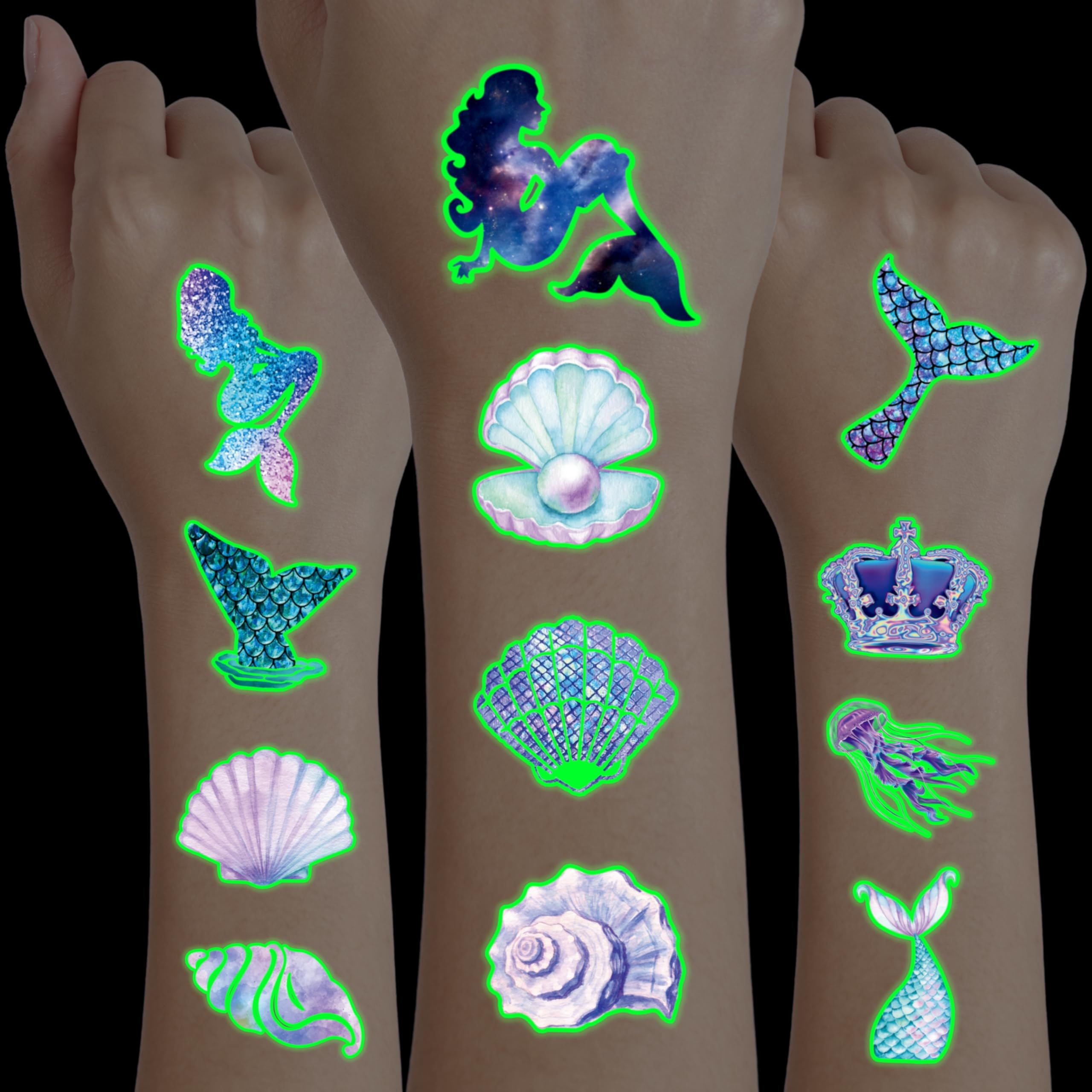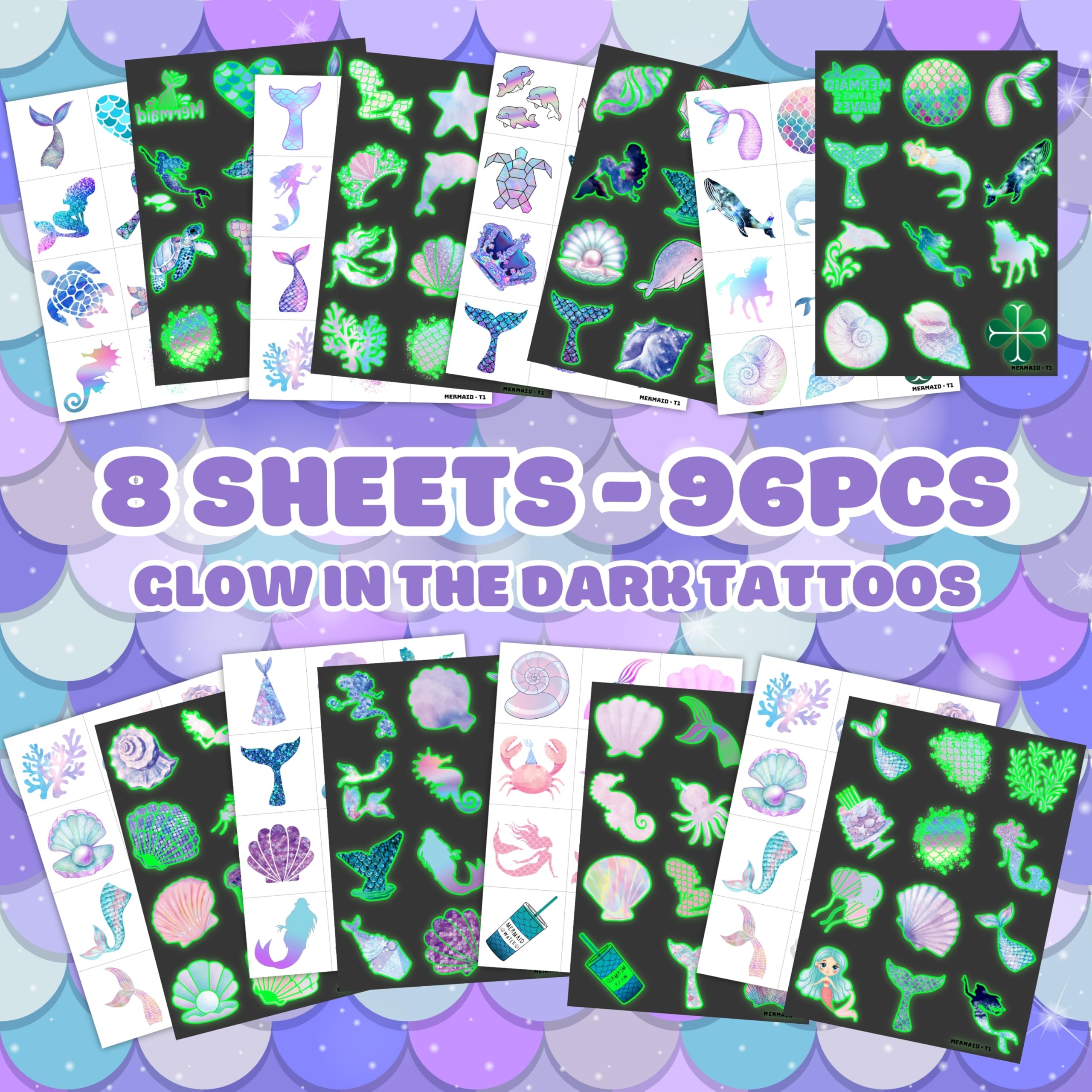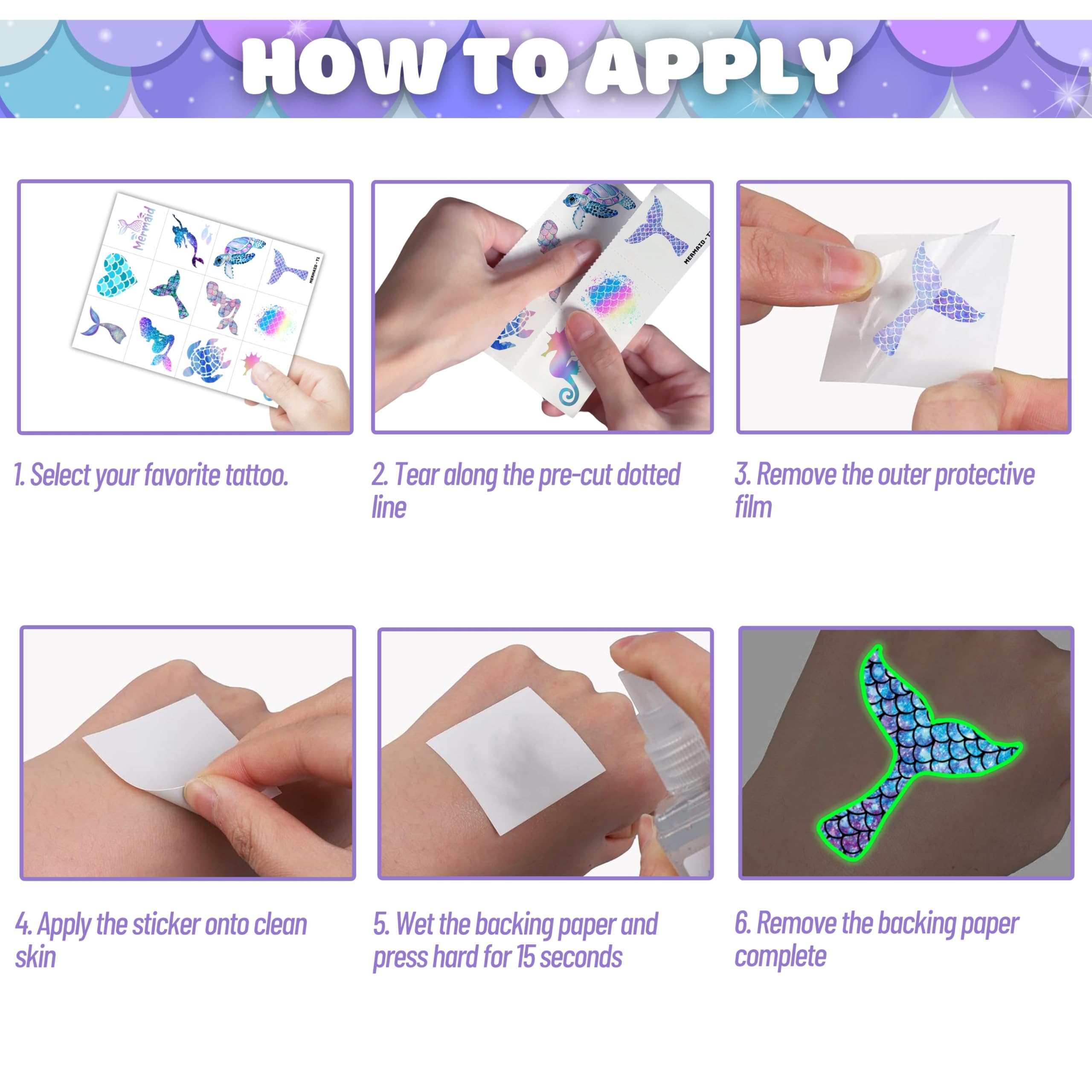 🎉【PERFECT PRE-CUT TATTOOS FOR THEMED MERMAID DECORATIONS】: Mermaid pre-cut temporary tattoo stickers include 8 sheets, featuring 96 adorable and unique designs. These tattoos are perfect for party favors, holiday-themed small gifts, and fun surprises. Each sheet measures 16 x 12 cm (6.3 x 4.7 inches)—a perfect size for kids! Thanks to the pre-cut perforated lines, you can easily tear them apart by hand—no scissors needed! 🎁【GREAT GIFT IDEAS FOR MERMAID PARTY SUPPLIES & DECORATIONS】: Add a magical touch to your child's birthday party with these Mermaid-themed pre-cut tattoos! Featuring under-the-sea elements, seashells, dolphins, sparkles, pink, purple, and little mermaids, these tattoos perfectly complement any mermaid party. They're a fun and thoughtful gift that kids will love! 🌍【SAFE AND ENVIRONMENTALLY CONSCIOUS】: Our pre-cut temporary tattoos are made from safe, non-toxic, and eco-friendly materials. Printed on high-quality, sustainable paper, they are completely safe for kids while also being environmentally friendly. 🥳【ADD A TOUCH OF FUN】: Looking for a unique gift? Our adorable and vibrant mermaid pre-cut tattoos can be applied to laptops, backpacks, desks, suitcases, books, water cups, and more! These playful designs will add a touch of magic to everyday items and make any occasion more special. 🌴【EASY TO USE & REMOVE - NO SCISSORS REQUIRED】: Each tattoo is pre-cut for convenience—simply tear it out by hand! To apply, place the tattoo on your skin, wet it thoroughly with water, and wait 20-30 seconds. The backing paper will peel off effortlessly, leaving a smooth and vibrant tattoo. They can also be applied to clothes, glasses, or any smooth surface. To remove, simply use soap and water. 👍【PERFECT CUSTOMER SERVICE】: If you have any difficulties using our product, feel free to contact us. We’re committed to providing excellent support and ensuring you have a fantastic shopping experience. ⚠️ This product is not recommended for individuals with sensitive skin. We advise testing on a small patch of skin, such as the hand, before applying it to larger areas. If irritation occurs, discontinue use immediately.