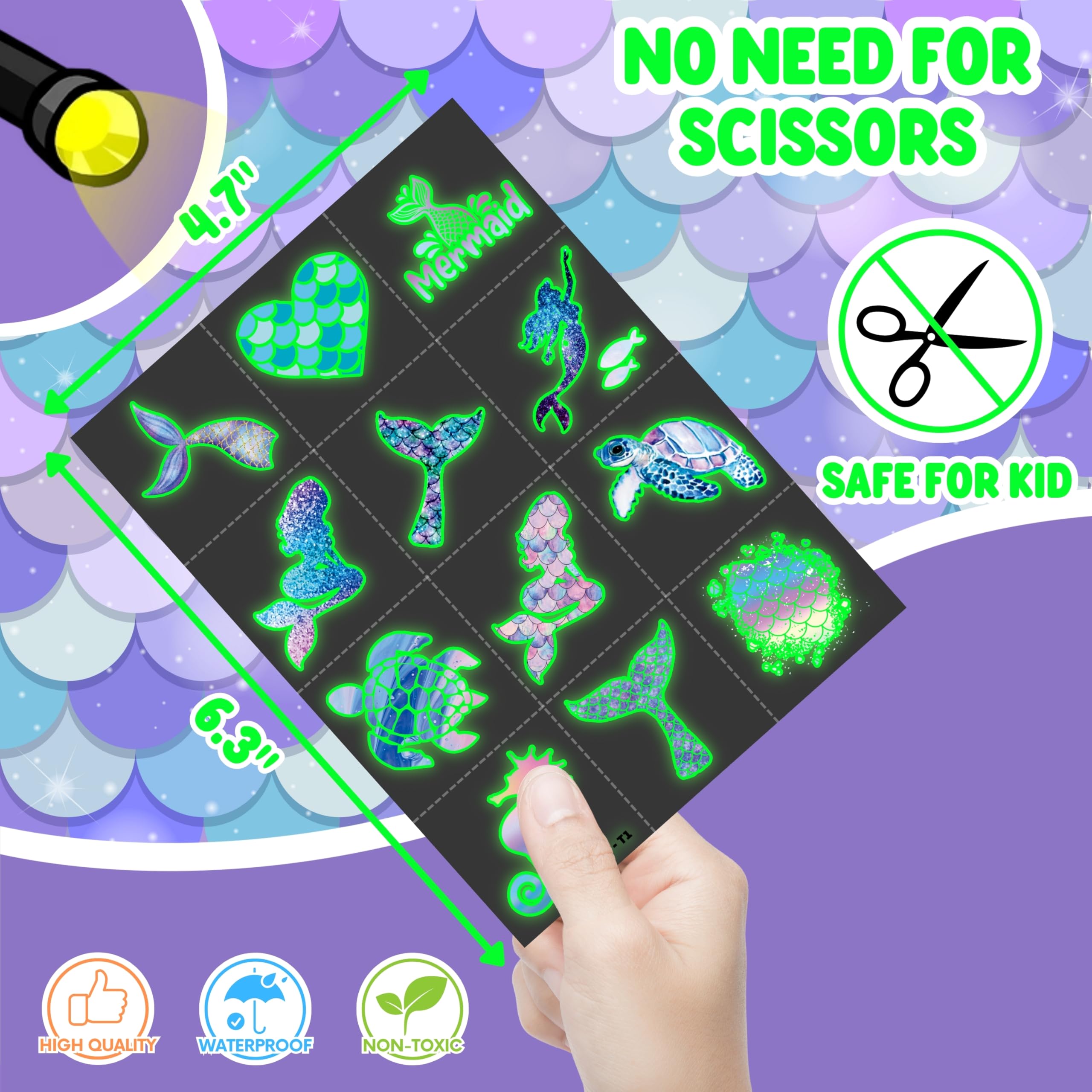 🎉【PERFECT PRE-CUT TATTOOS FOR THEMED MERMAID DECORATIONS】: Mermaid pre-cut temporary tattoo stickers include 8 sheets, featuring 96 adorable and unique designs. These tattoos are perfect for party favors, holiday-themed small gifts, and fun surprises. Each sheet measures 16 x 12 cm (6.3 x 4.7 inches)—a perfect size for kids! Thanks to the pre-cut perforated lines, you can easily tear them apart by hand—no scissors needed!