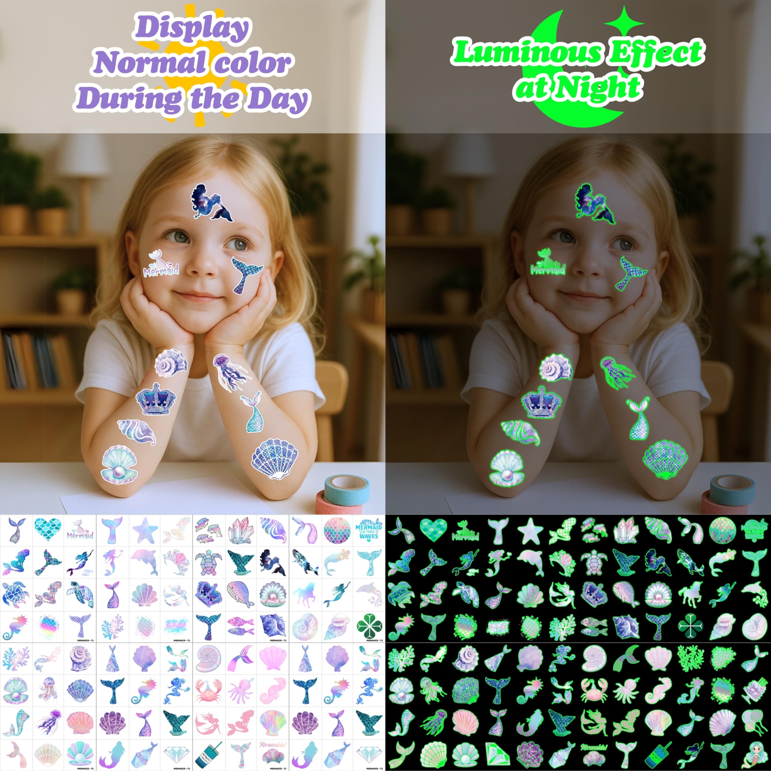 🎁【GREAT GIFT IDEAS FOR MERMAID PARTY SUPPLIES & DECORATIONS】: Add a magical touch to your child's birthday party with these Mermaid-themed pre-cut tattoos! Featuring under-the-sea elements, seashells, dolphins, sparkles, pink, purple, and little mermaids, these tattoos perfectly complement any mermaid party. They're a fun and thoughtful gift that kids will love!