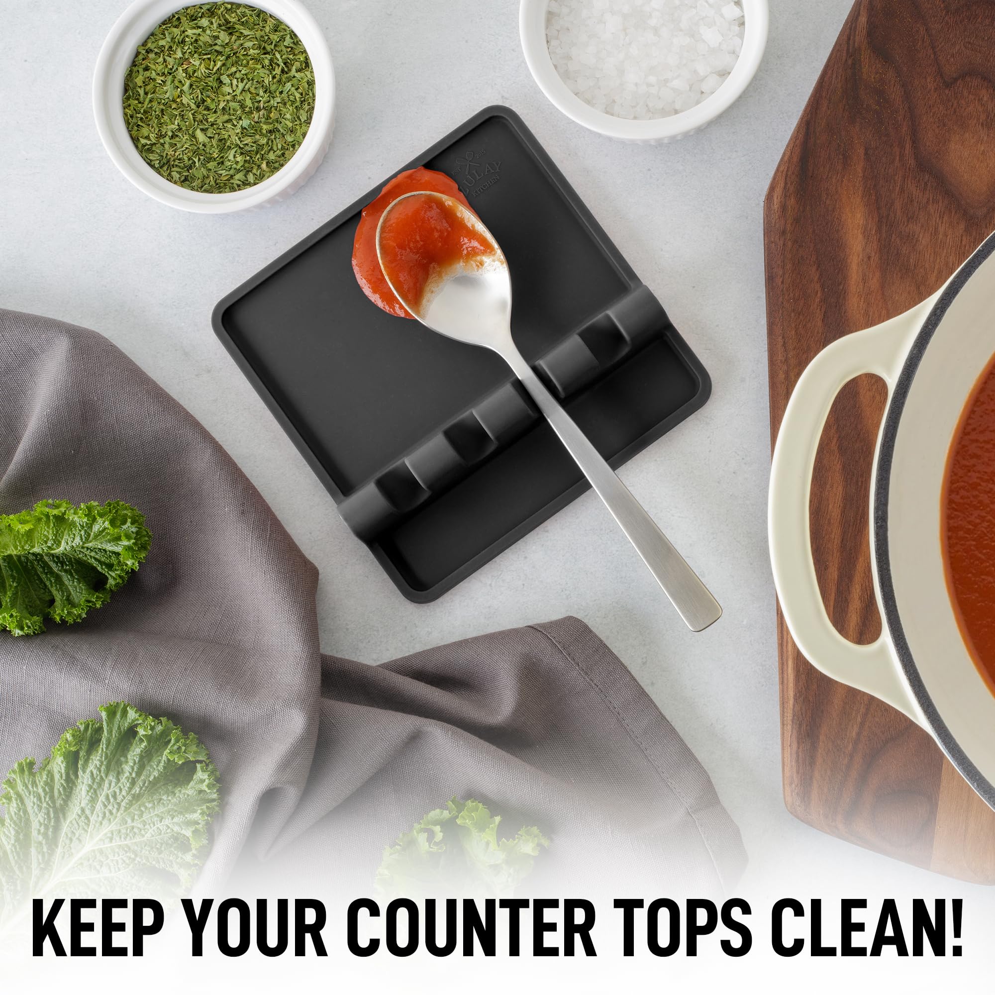 KEEP YOUR COUNTERTOPS CLEAN: Are you tired of random oil and sauce drips all over stovetops and kitchen counters while cooking? Say no more! Our spoon rest has raised edges to catch all the drips, making it a great addition to your kitchen gadgets for keeping counters and stoves splatter-free. Revolutionize your cooking, baking, or grilling experience with this beautifully designed square spoon holder.