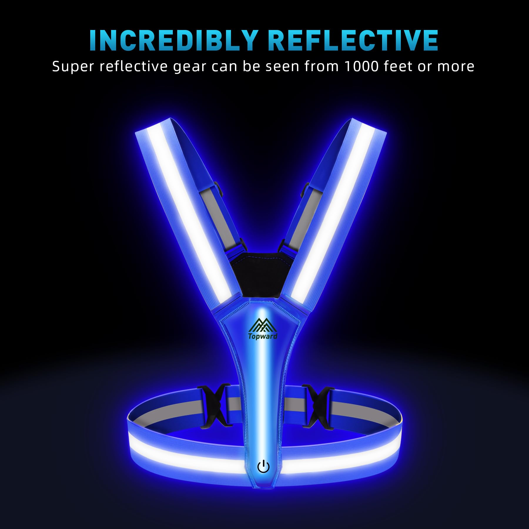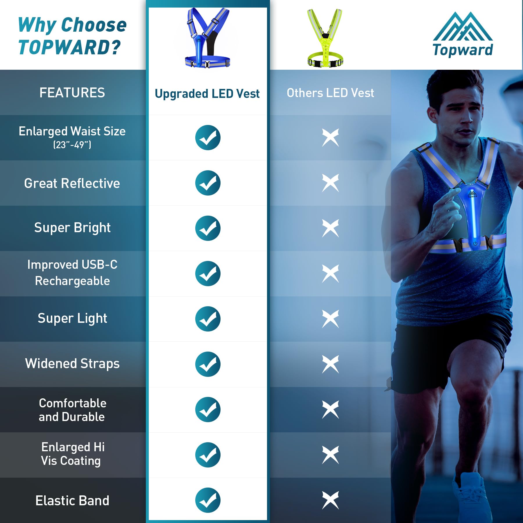 BE SEEN FROM A LONG DISTANCE - Topward LED Reflective Vest is an upgraded, new generation safety vest with LED flash lights both in front and back; Keep you safe for running, (dog)walking, riding, skiing and motorcycle, etc.
