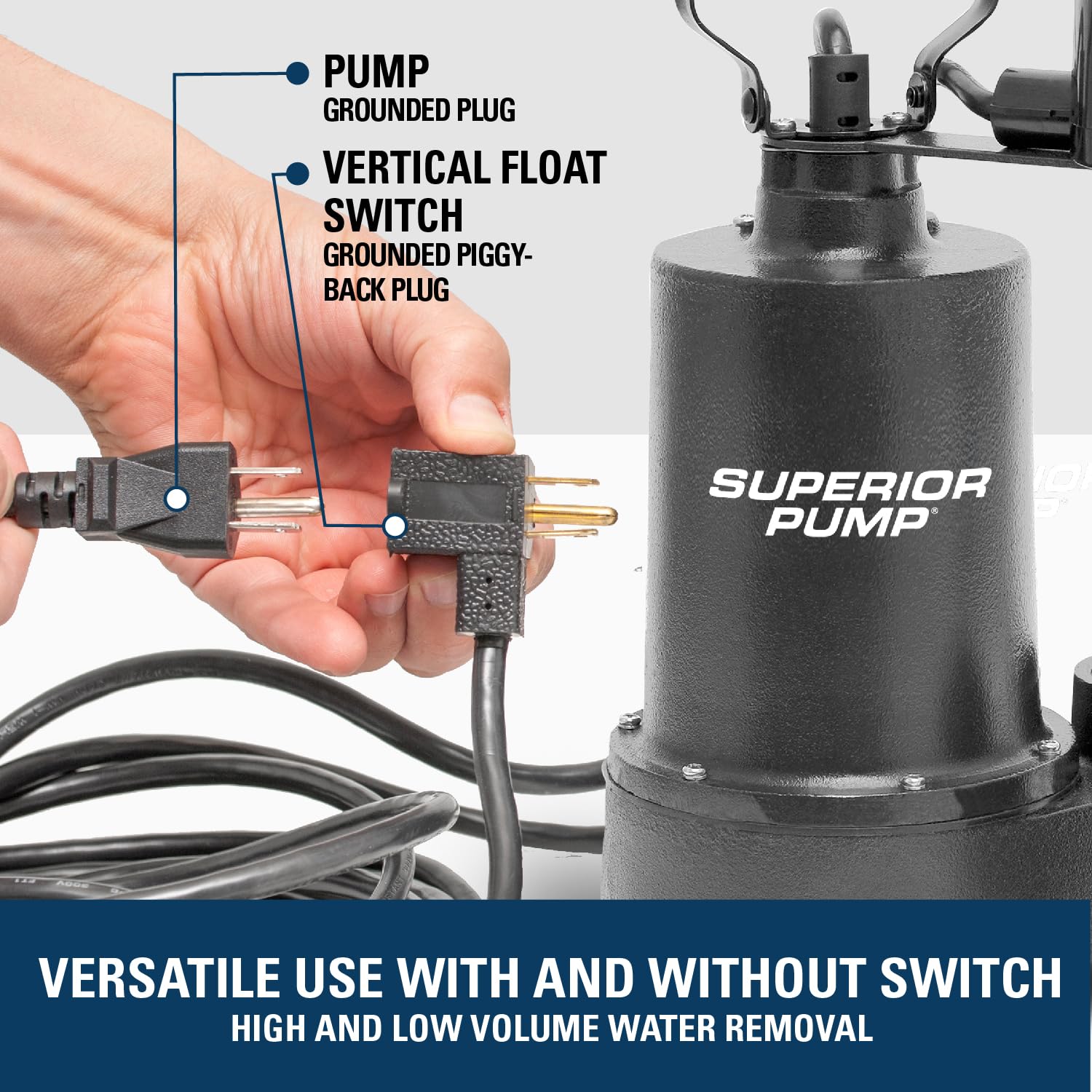 Superior Pump 92053 1/2 HP Cast Iron Sump Pump with Vertical Switch, plus 1-1/2-Inch Rubber Boot Check Valve. Superior Pump builds pumps that are truly Built to Last and are 100 percent factory tested. Superior Pump uses quality components including solid copper motor windings, heavy duty stainless steel jacketed shaft seals, double O-ring seals on motor plate, and electronically controlled split capacitors. Superior Pump model 92541, 1/2 HP cast iron submersible sump pump with tethered float switch, will move water up to 3300 gallons per hour. Upgraded durable stainless steel impeller for improved performance. Equipped with suction screen to filter out large debris and handles up to 3/8-inch solids with ease. This pump is UL/CUL listed and CSA certified and backed by a 3 year warranty.