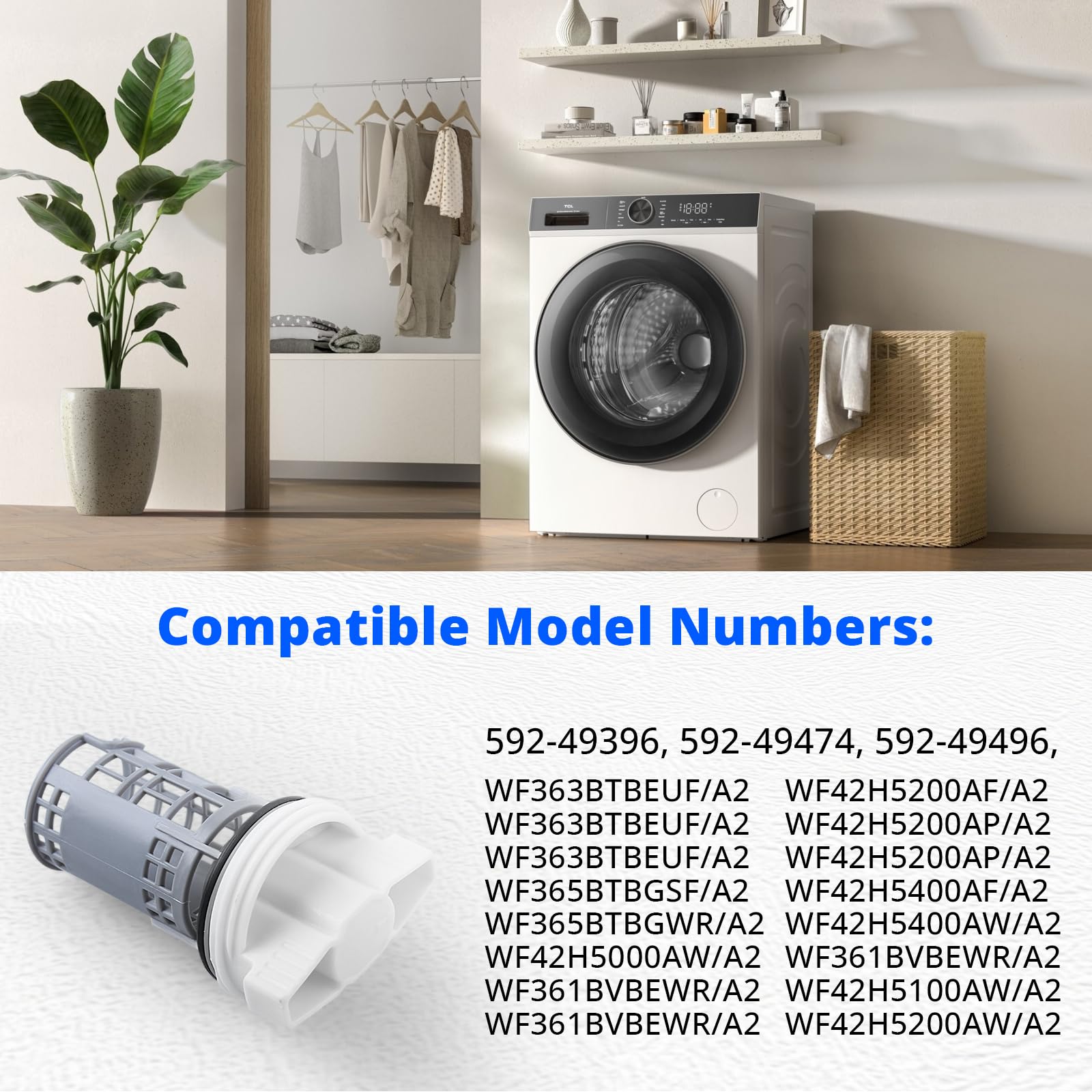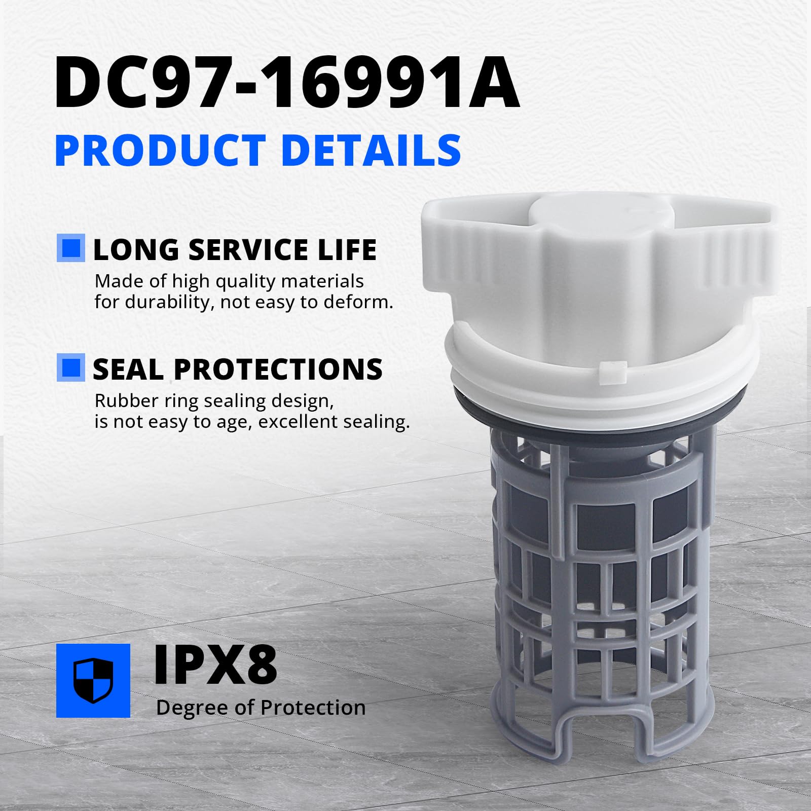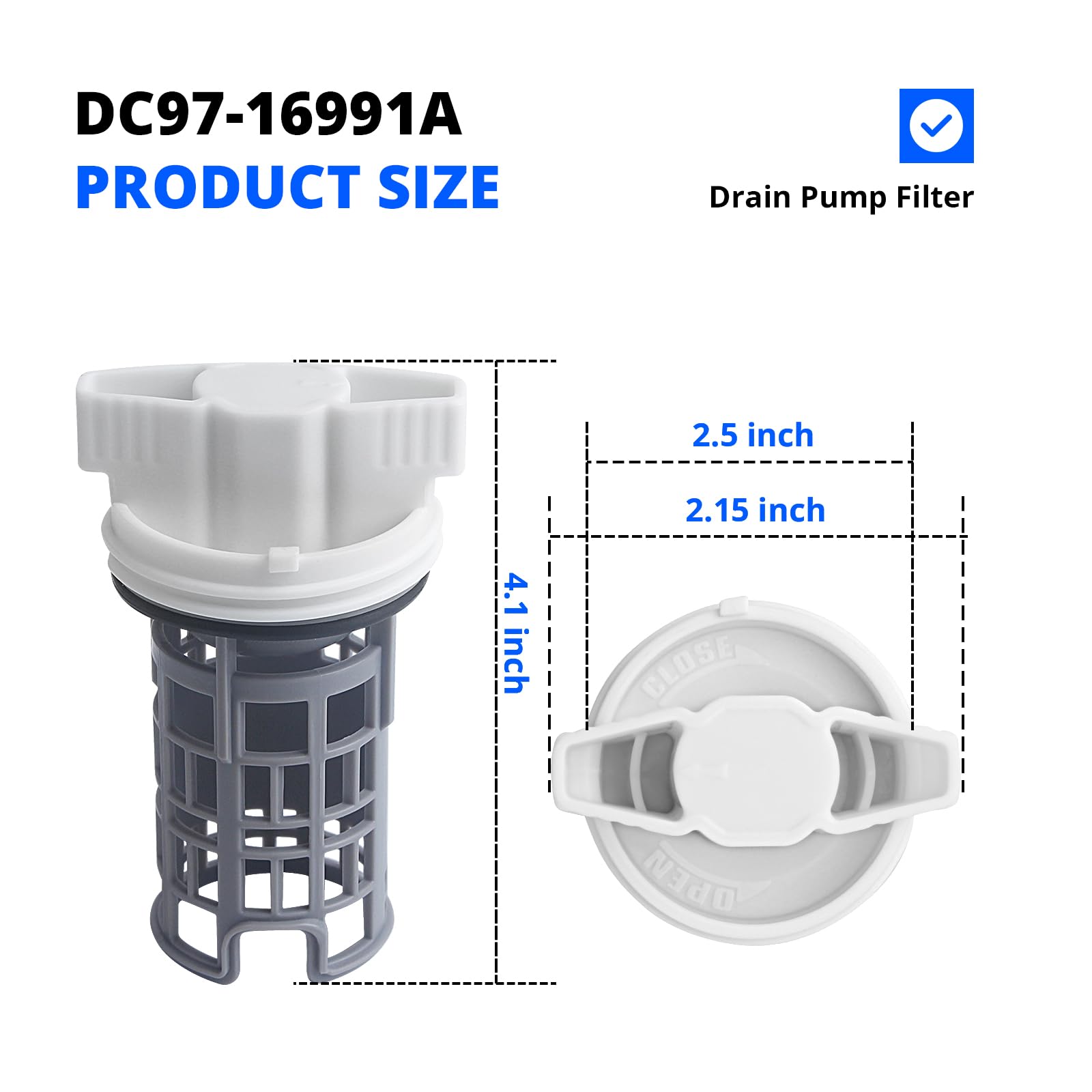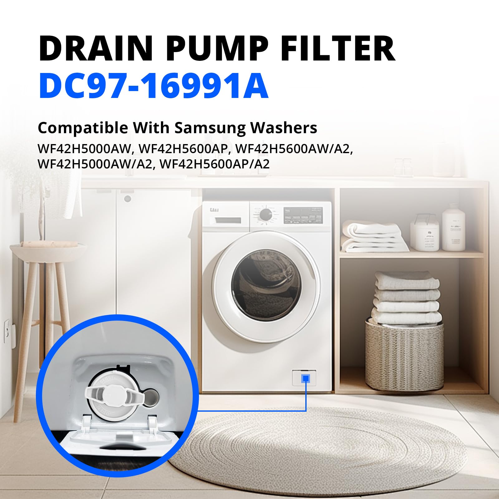 Compatibility: The DC97-16991A Drain Pump Filter compatible with Samsung Washer WF42H5000AW, WF42H5000AW/A2, WF42H5600AP, WF42H5600AW/A2, WF42H5600AP/A2, WF42H5100AW/A2, WF42H5200AF/A2, WF42H5200AP/A2, WF42H5200AW/A2, WF42H5400AF/A2, WF42H5400AW/A2, WF42H5700AG/A2, WF435ATGJRA/A2, WF455ARGSWR/A2, WF511ABR/XAA, WF511ABWX/AA, WF520ABP/XAA, etc