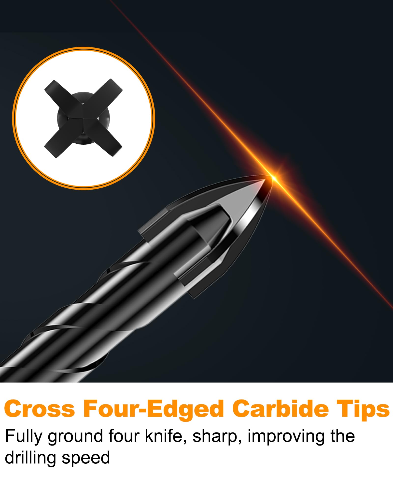 WONDERFUL DESIGN; Cross shaped tip design reduces resistance and makes faster speed; Hexagonal handle makes the drill tighter and safer to use. When you pick up our concrete drill bit and pass through the tiles, it seems to feel unimpeded. You will be amazed at the wonderful design!