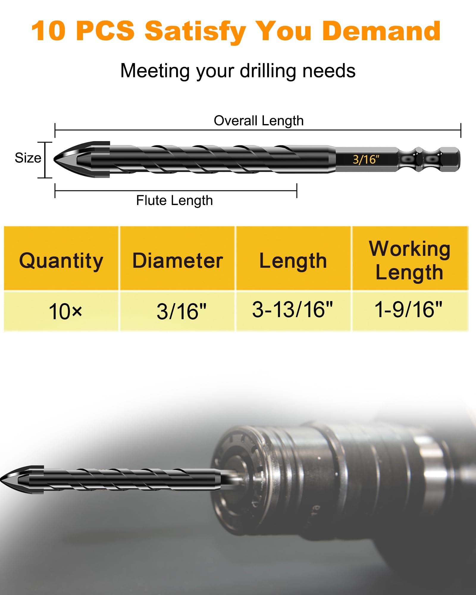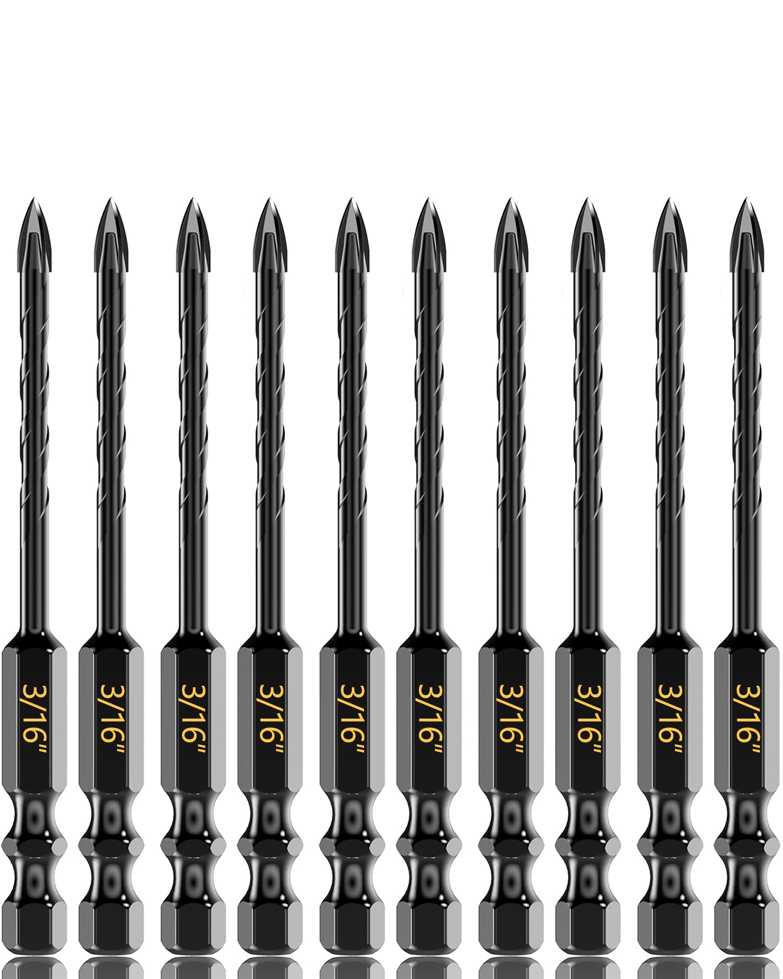 Masonry Drill Bit Set 3/16" (10PCS) - Cement Drill Bit, Professional Concrete Drill Bit Set for Glass/Brick/Cement/Tile/Etc, Industrial Strength Carbide Cross Drill Bit Tip, by TITGGI