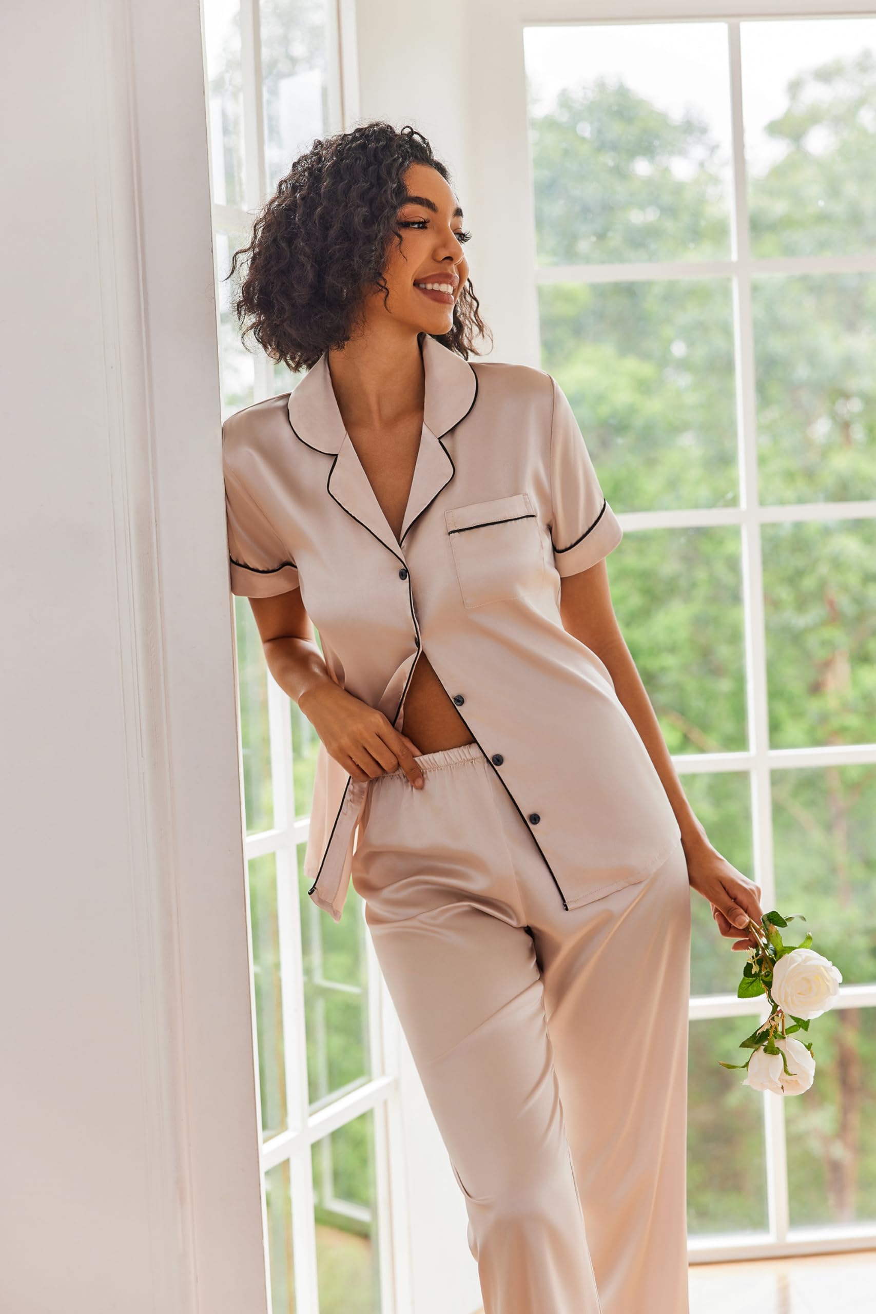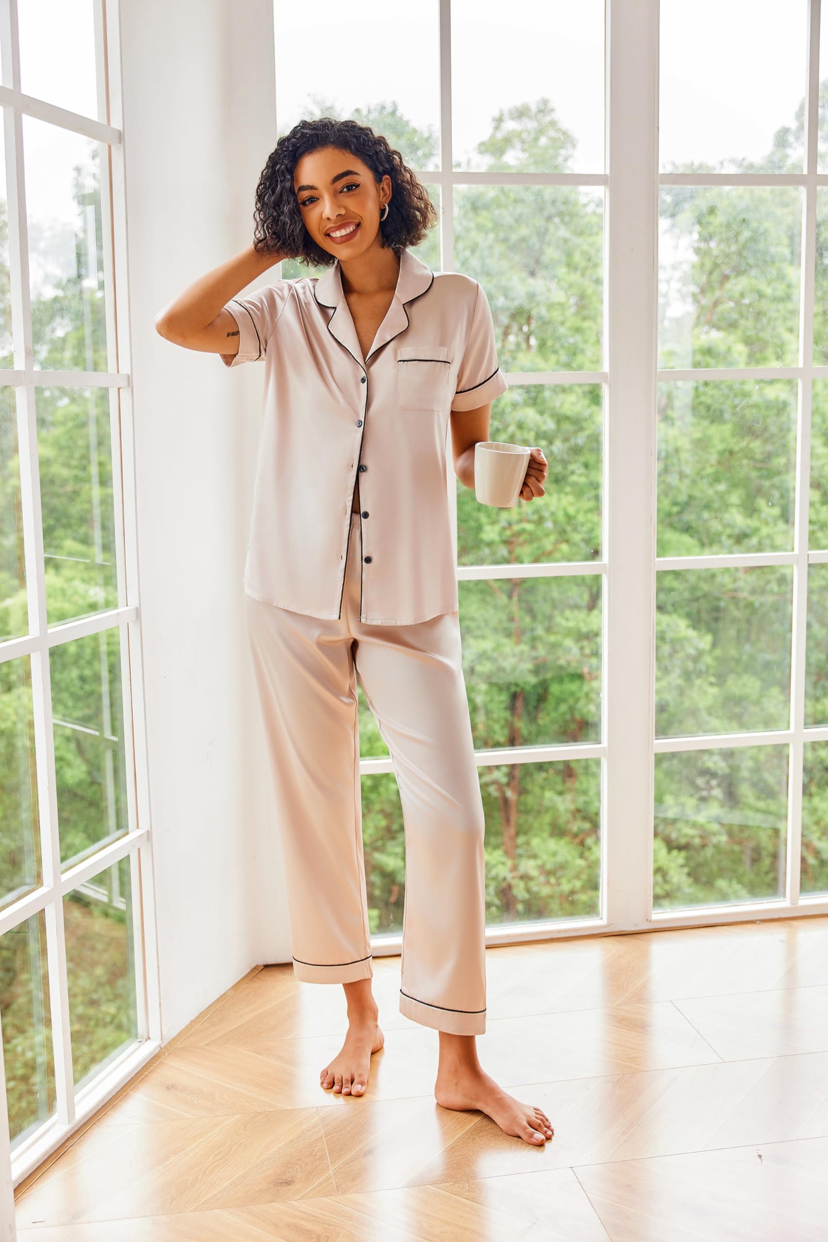 Soft Satin Pajama Set: Made of premium 95% Polyester, 5% Spandex silk satin, the pajama set for women is lightweight, breathable and skin-friendly, just like wrapped in a cloud, helping you have a sound sleep.