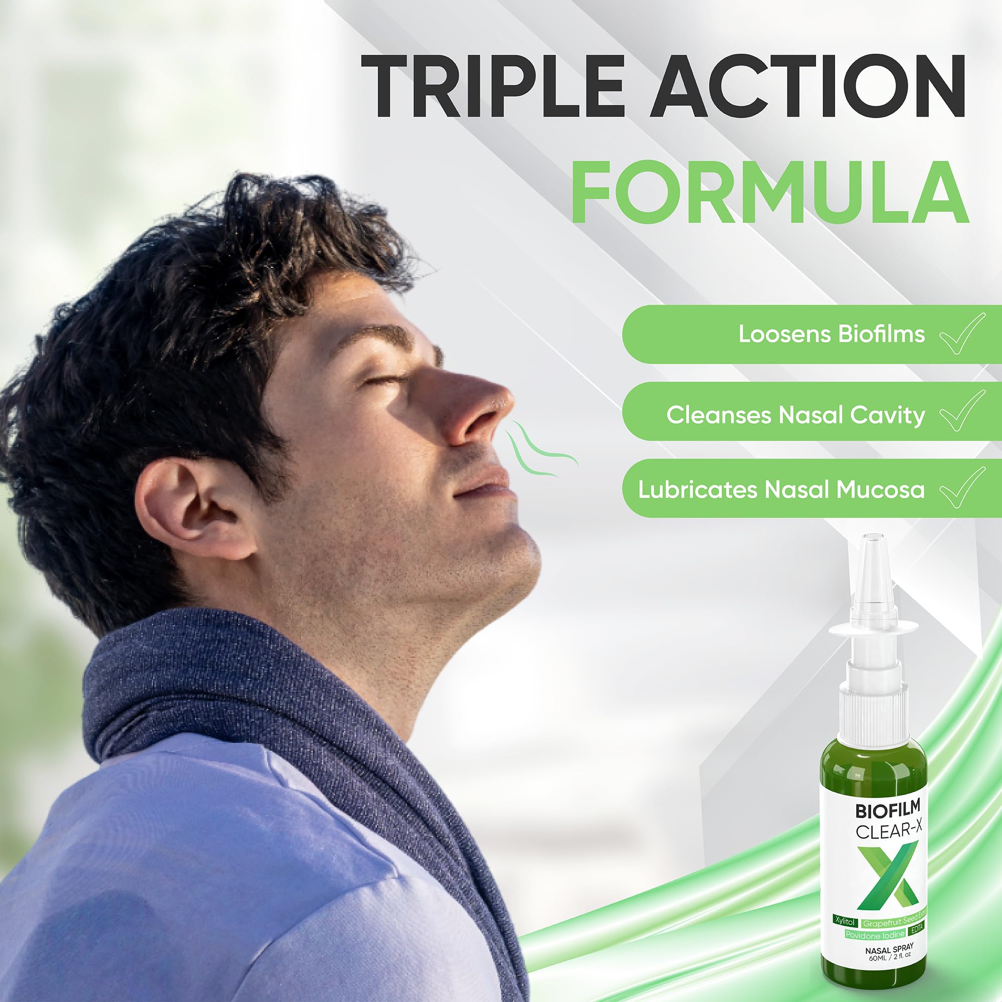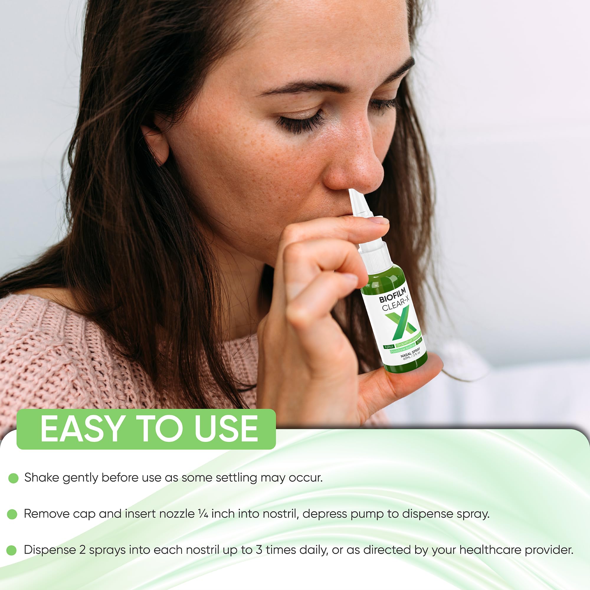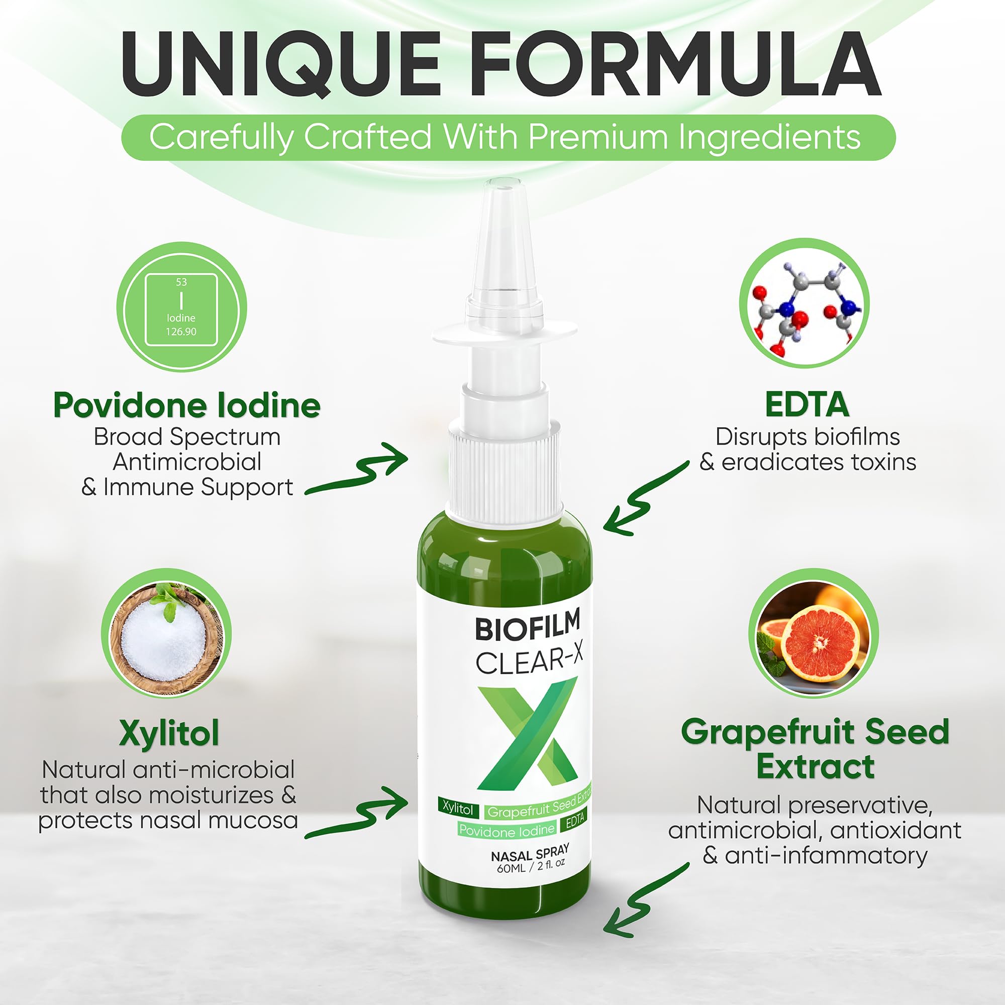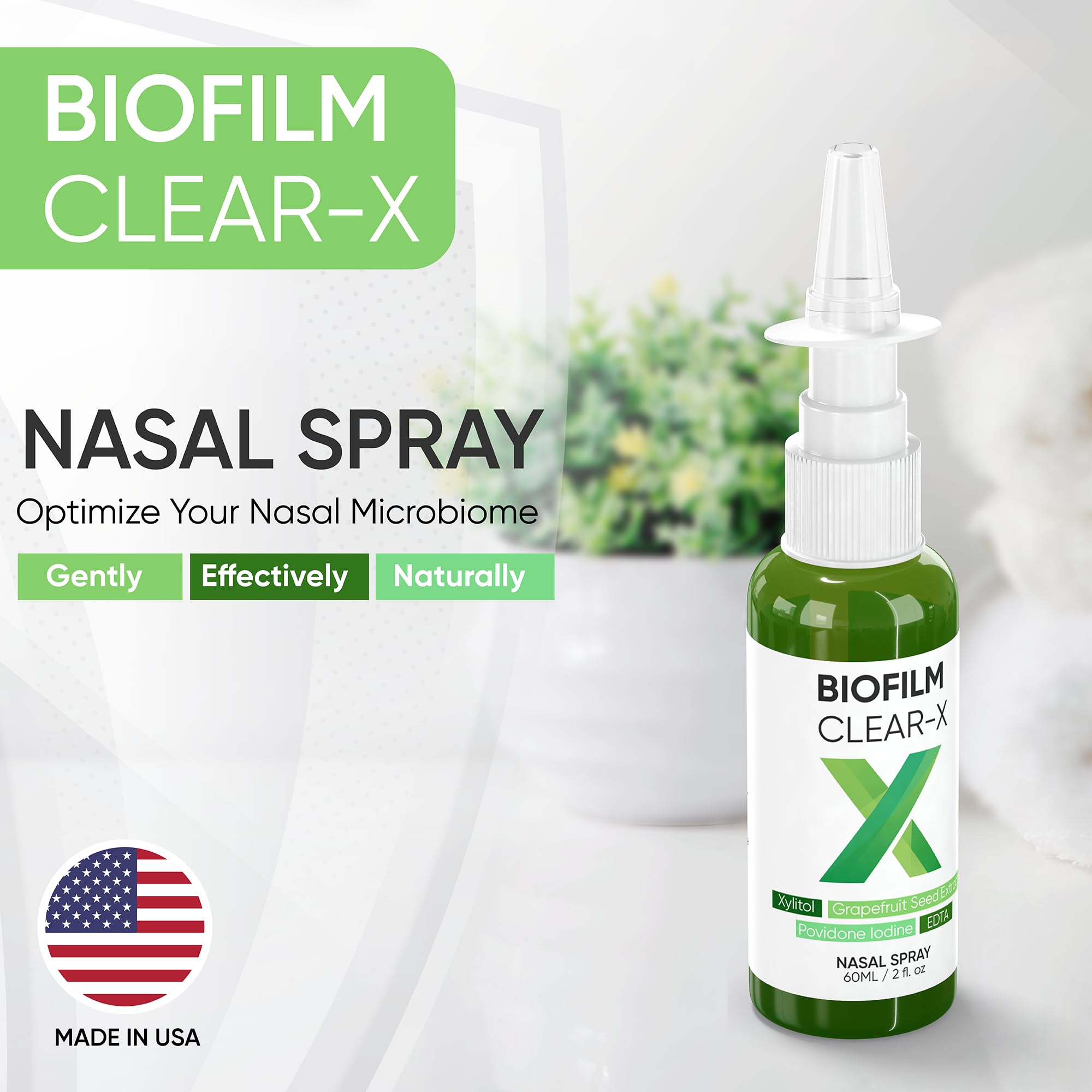 BioFilm Clear X is a daily nasal cleansing spray designed to support natural sinus hygiene. The formula combines EDTA and xylitol, two ingredients that work together to help weaken the structure of stubborn nasal biofilms. Once the biofilm barrier is disrupted, it becomes easier for the body to rinse away unwanted particles and maintain a cleaner nasal environment. Grapefruit Seed Extract provides additional natural cleansing support for overall purity and freshness. The spray is gentle, non habit forming, and free from medicated decongestants, steroids, alcohol, and drying agents. It is suitable for regular use as part of a daily sinus routine. BioFilm Clear X is manufactured in a cGMP certified facility in the United States for quality and consistency. Each 60 ml bottle delivers up to 500 sprays, providing excellent value and convenience.