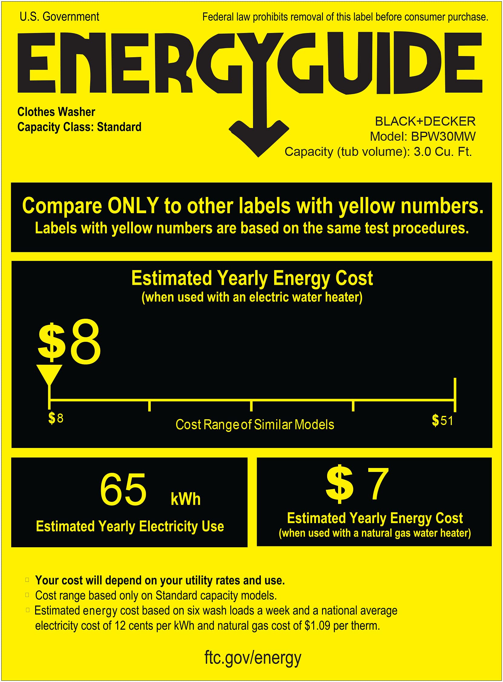 When it comes to washing machines, this outstanding BLACK+DECKER portable washer (23.7” x 24.8” x 39.4”) is your ultimate solution to immaculately clean clothing for household use. There are 8 cycles to choose from with this fantastic 3.0 cu. ft. washer, which include Normal, Heavy, Delicate, Quick, Bulky, and Spin Only. Choose between three water level choices for small, medium, and large loads as well as cold, warm, and hot temperatures. Inside this small washer (99.2 lbs.), you’ll find an incredible stainless steel tub that’s rust and corrosion-resistant with a quiet close top loading transparent lid. Because this unit is an impeller washer, it’s perfect for lingerie and delicates as it doesn’t have an agitator to cause entanglement problems. Also, you can use for soiled baby clothing and diapers, but must run them separately from other loads. You can also easily wash baby clothing and diapers, as well as lingerie without entanglement problems common with agitator washers. Place anywhere in your home or area with 2 rollers, 2 side handles, and 1 adjustable leveling leg. This unit comes with a drain hose and quick connect sink adaptor. Temporarily connect to a single faucet or for more permanent installation. Also included are auto shutoff safety features, Delayed Start up to 24 hours, and Child Lock protection. Get the high quality washing you deserve to live out your day with our amazing BLACK+DECKER portable washing machine. Reinforced packaging is included for total customer satisfaction.