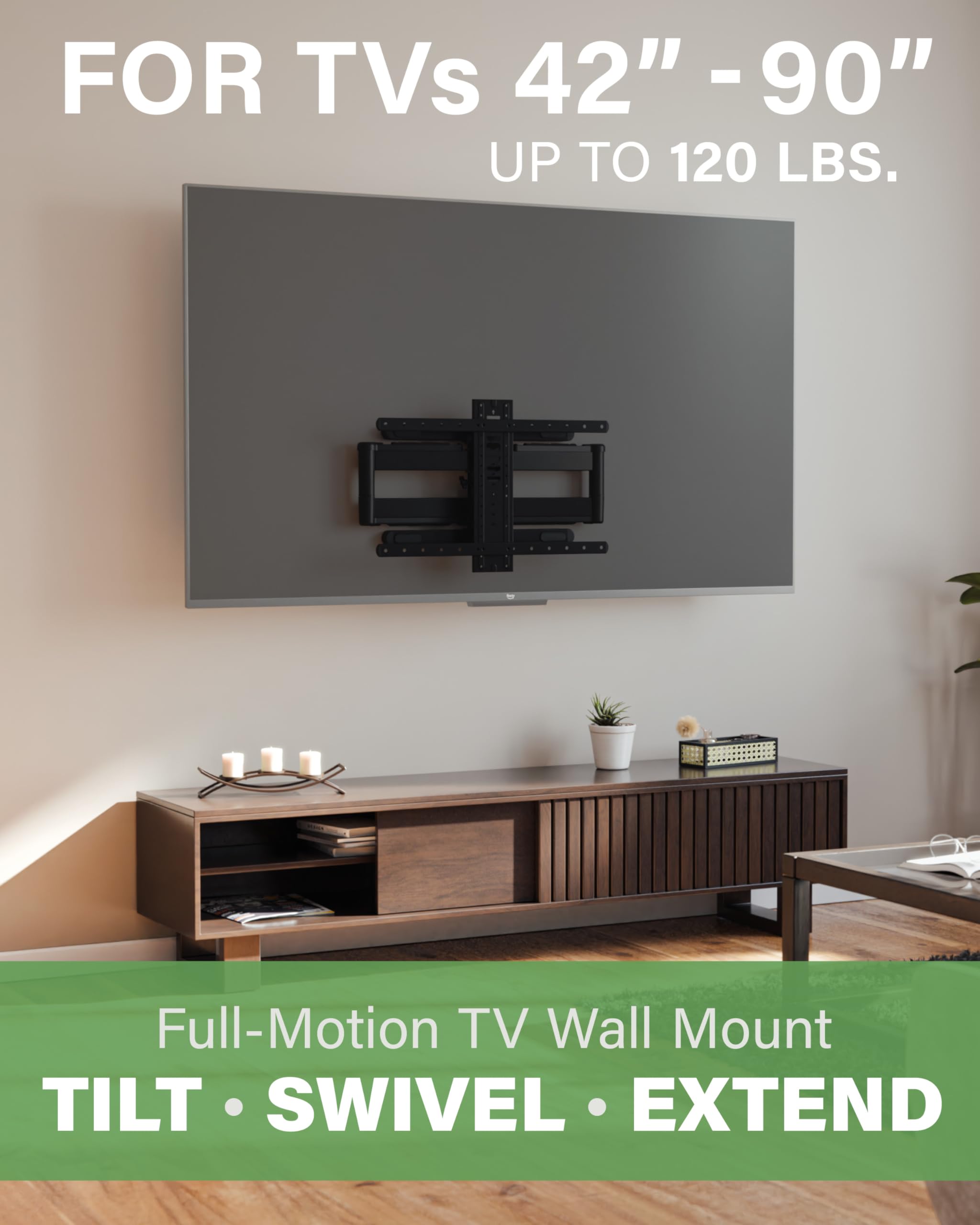 Dual articulating arms extend out 24" from the wall, holding TV’s 42” to 90” and up to 120 lbs.