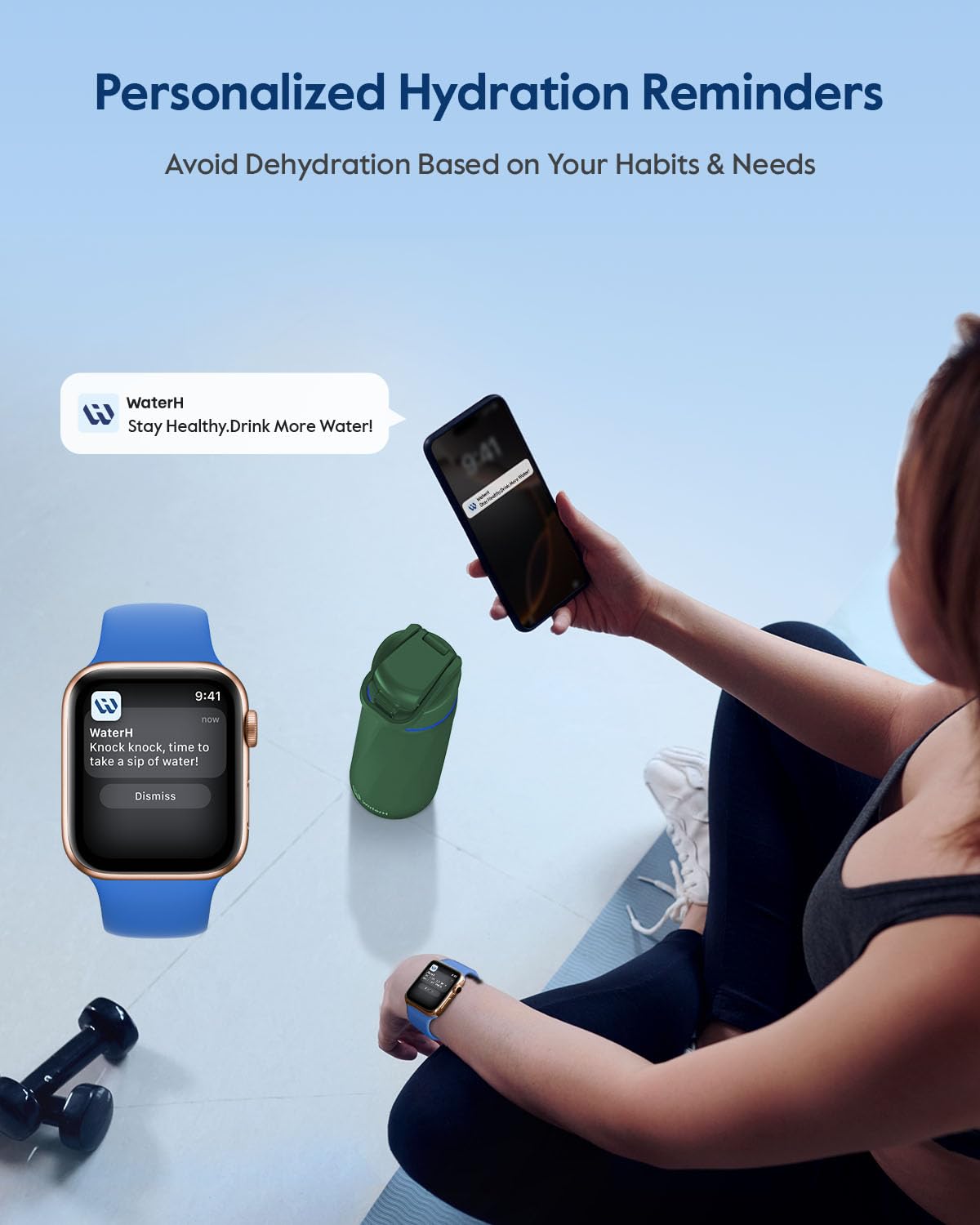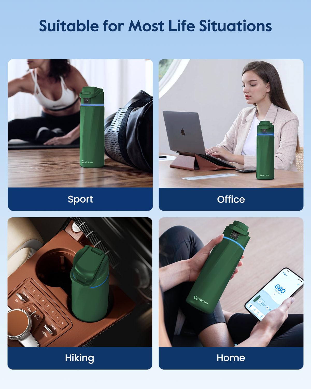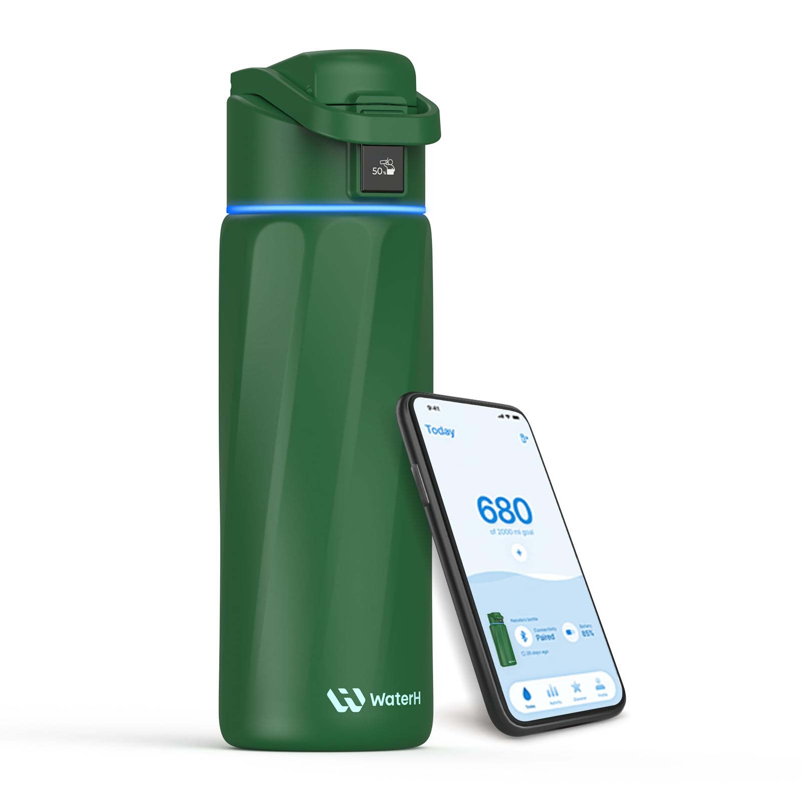 GOAL REMINDER: Our WaterH Smart Bottle is a game-changer with built-in hydration reminders and tracking. The halo on the lid, LED display and notifications on your phone or smartwatch help you avoid the side effects of dehydration such as dizziness, increased blood pressure and fatigue that come with forgetting to drink water. It also helps you reach your health goals and develop a lasting hydration habit.
