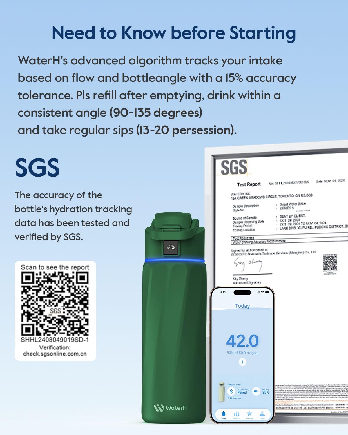 Tips for Using a Water Tracker: The WaterH 24-ounce (about 797 ml) water bottle uses an advanced artificial intelligence algorithm to track your water intake based on flow rate and bottle angle. It has passed the SGS test with an accuracy error of only about 15%. Follow the correct usage method to make your smart life easier: please refill water after use, maintain a constant drinking angle (90-135 degrees), and drink water regularly in small sips (13-20 sips each time).