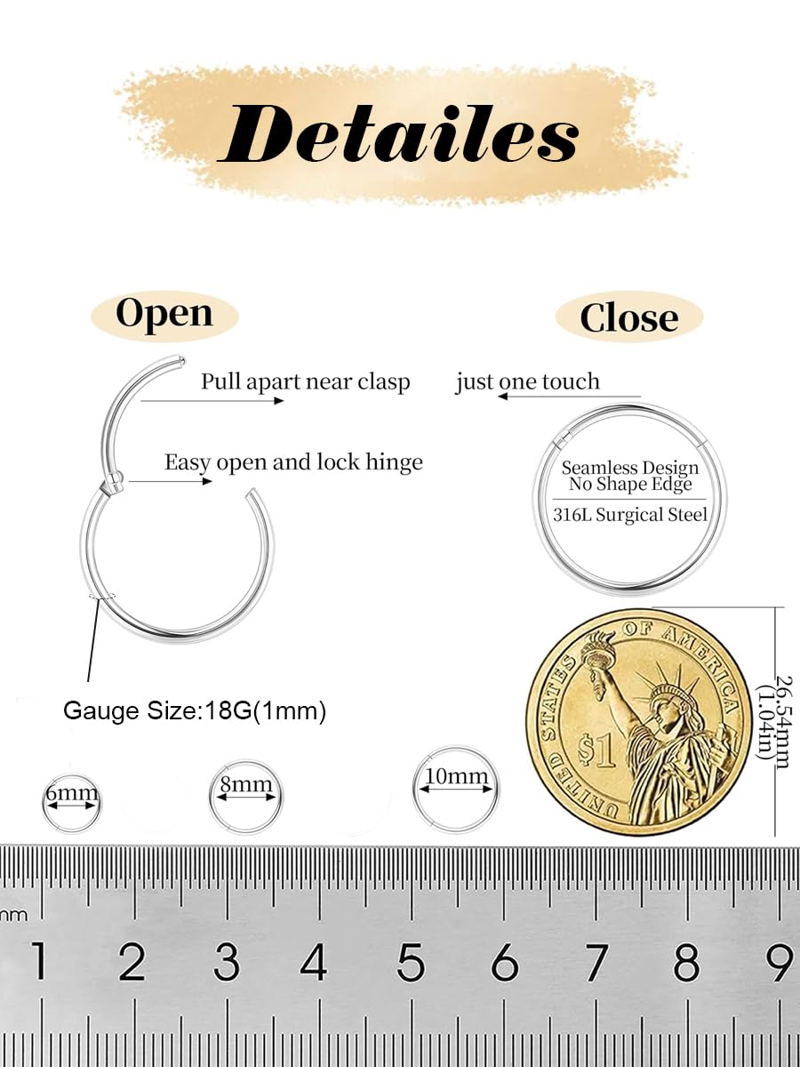 ✅ Set of 3 Silver Nose Hoops – Multiple Sizes:Includes 3 silver nose rings in 18gauge (1.0mm) thickness with inner diameters of 6mm, 8mm, and 10mm to fit different piercing needs.