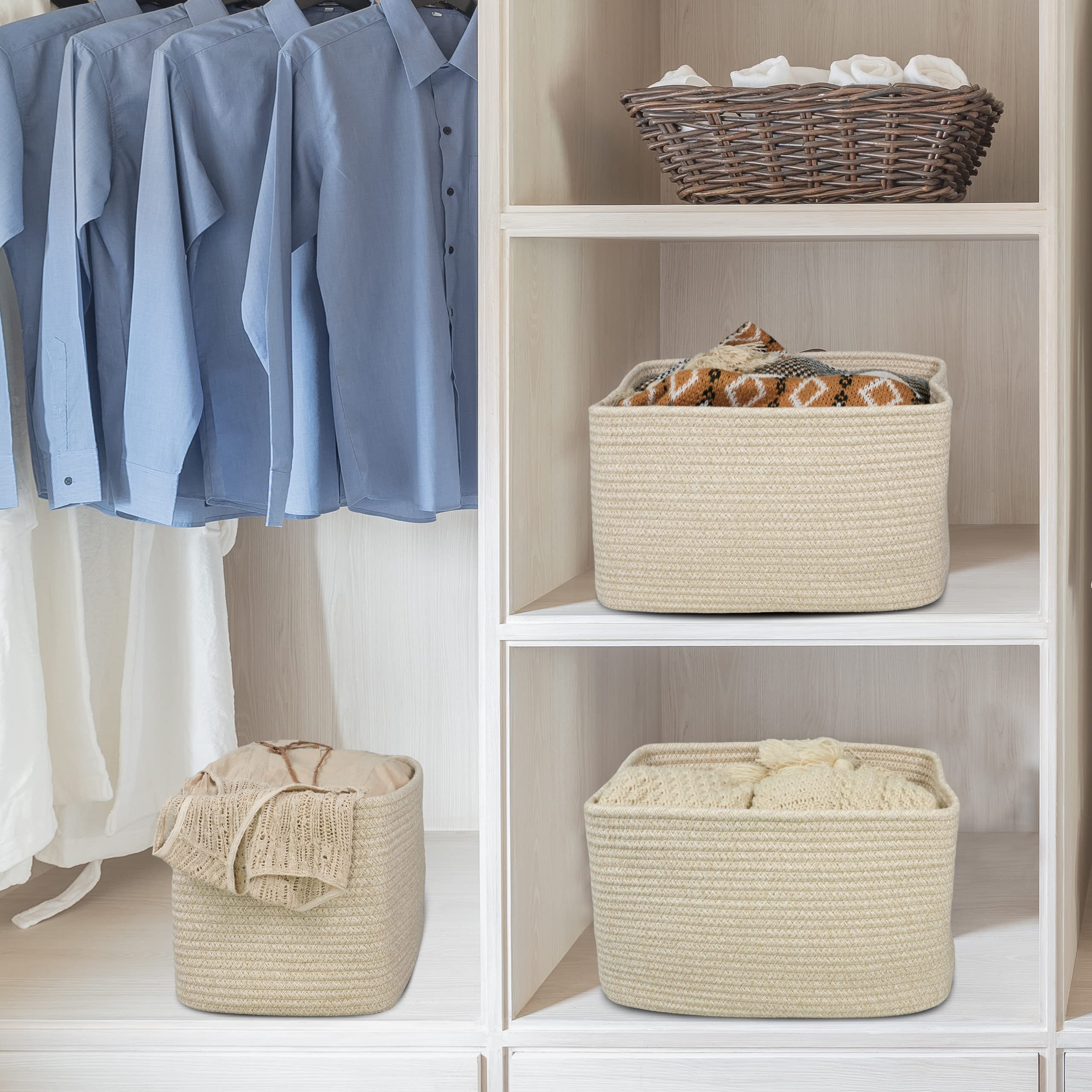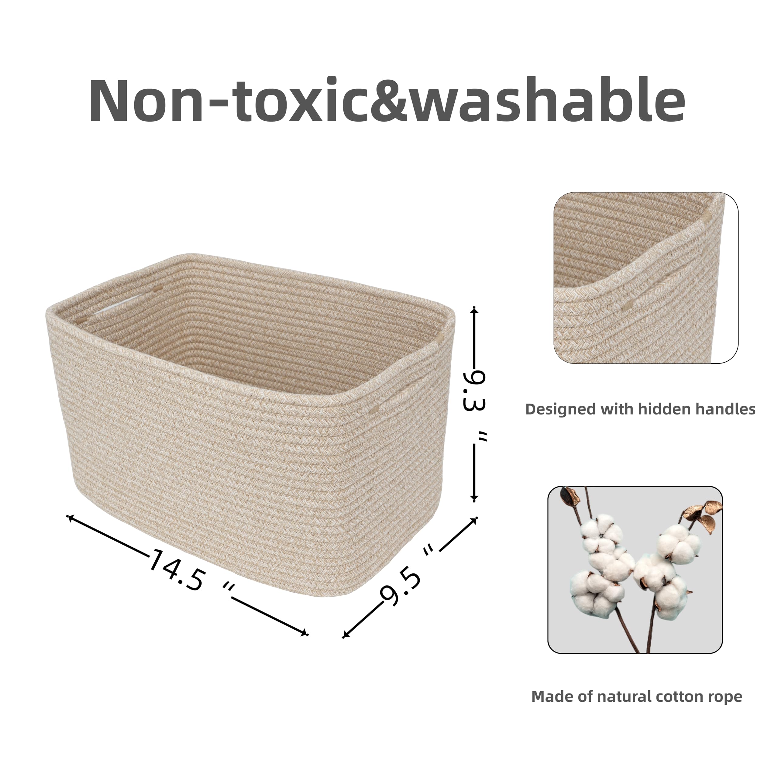 1, Medium to Large rectangle woven basket for storage: Our rope basket with handles size is 14.5”X9.5”X9.3”. Designed as home storage basket for organizing. Could use as toy basket, pet basket, book basket, towel basket, clothes basket, nursery basket, wicker basket for storage and more. Perfect as storage basket for shelves or closet storage bins to store household items.