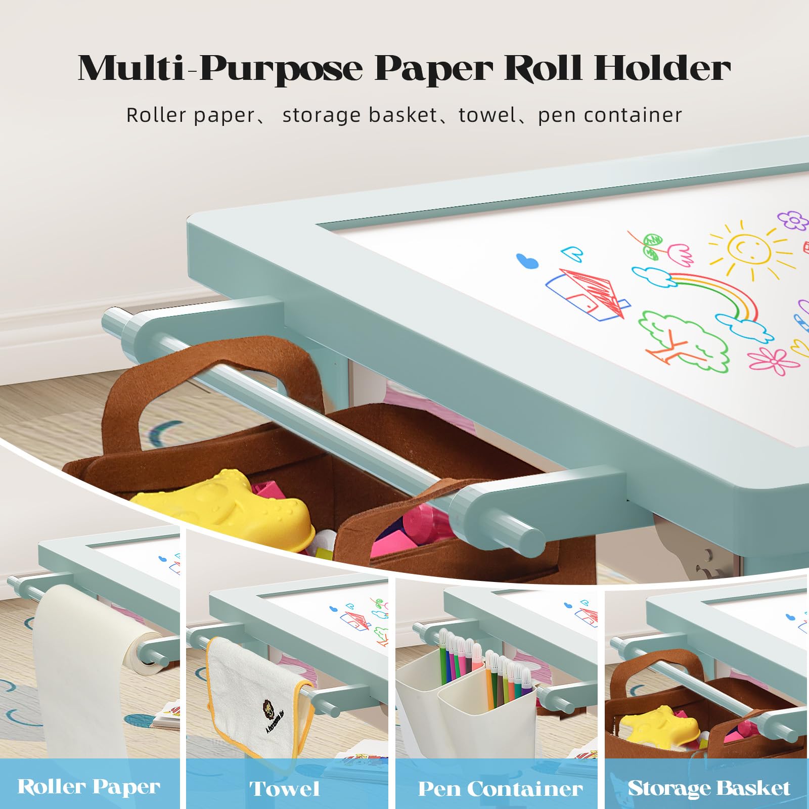 【Convenient Foldable Storage Bins & Paper Roller – Easy Organization】 The table features 3 foldable storage bins, perfect for storing sand, water, toys, or craft supplies. A built-in paper roller (paper not included) can be used for art projects or mounted with paper rolls. The roller can also be used to hang accessories like towels or storage bags, making cleanup and organization a breeze