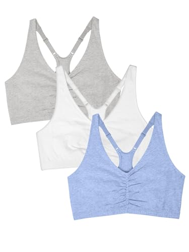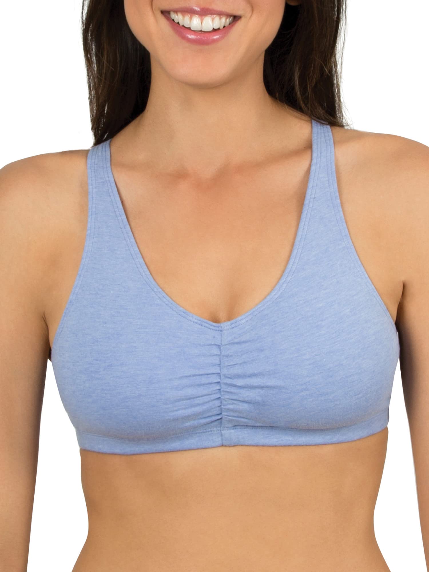 Description The bras you can count on, the classic Fruit of the Loom Women’s Shirred Front Racerback Sports Bras will have you looking and feeling your best. The sports bra is designed with soft, stretch cotton that gives the most breathable and flexible fit and is constructed with an elastic bottom band to lend you support along the way. Full coverage, shirred front helps with shaping and 2-ply construction comfortably hugs the natural figure while offering modesty without padding. This cotton sports bra has a racerback design that gives plenty of room to move and adjustable straps for best fit. Comfy when you need it most and great for low-impact activities, it’s a bra you’ll be reaching for the most and can be layered underneath tank tops, shirts and sweaters. An active lifestyle requires a brand that can give support and comfort. Fruit of the Loom has been one of America’ s most trusted brands for over 200 years. Our Unconditional Guarantee insures that you get the best product every time or your money back. We promise to deliver quality undergarments at an affordable price…always. Start everyday happy with Fruit of the Loom.
