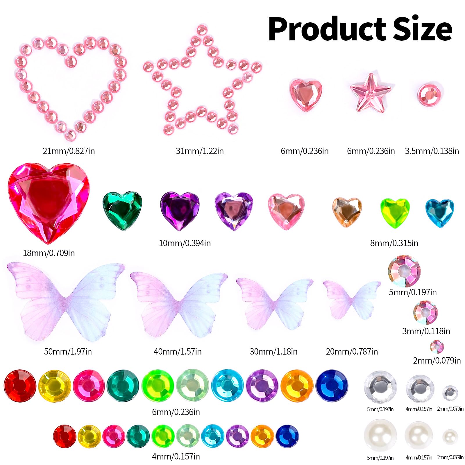 Sparkle Face Gems for Makeup--Elevate your look effortlessly with 4 sheets of meticulously crafted adhesive gems—1 sheets of dazzling rhinestones and pearls (3mm, 4mm, 5mm, 6mm sizes), 1 sheet of pink heart and star gems, and 1 sheet of butterfly-shaped face jewels, 1 sheet of mulit size colorful heart gems