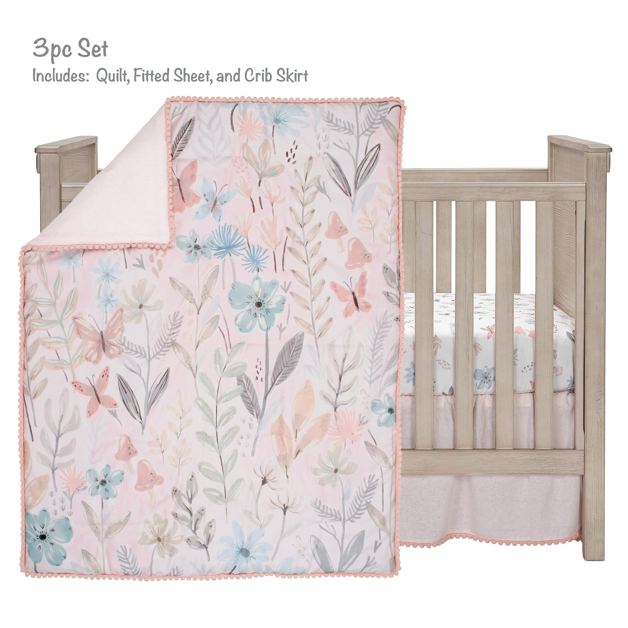 3-piece crib bedding set includes one quilt, one breathable 100% cotton fitted crib sheet, and one crib skirt