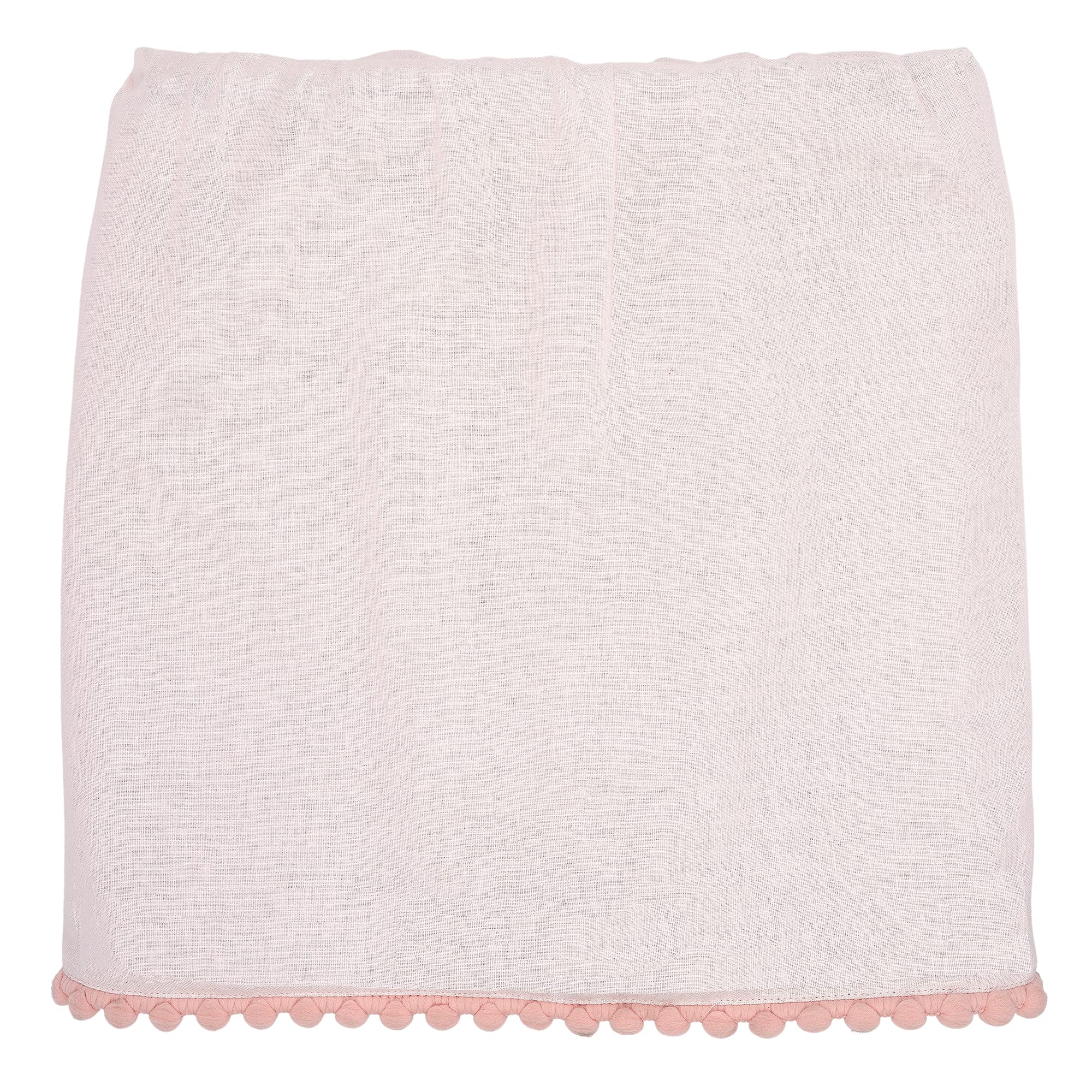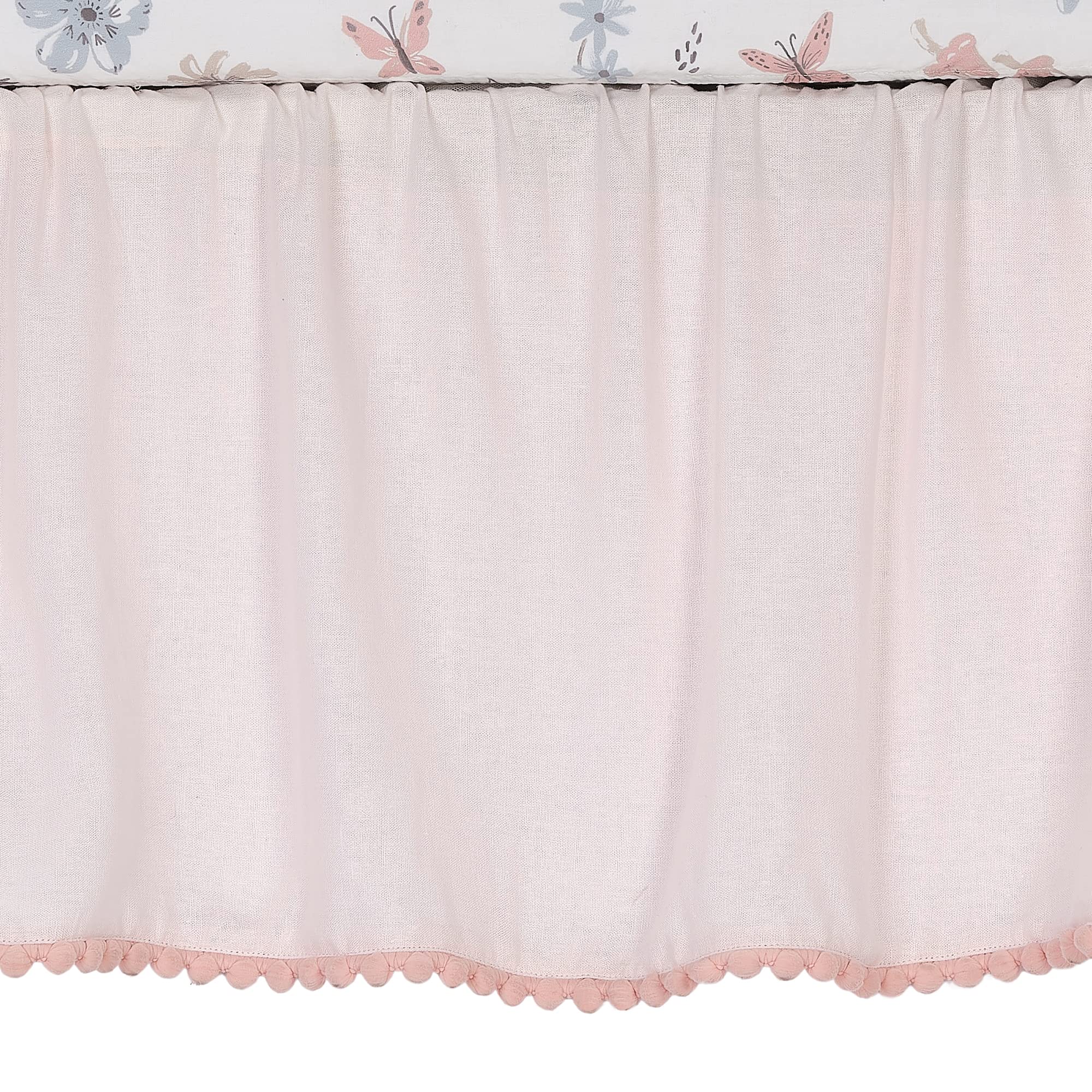 Pretty pom pom trim decorates the linen quilt and crib skirt