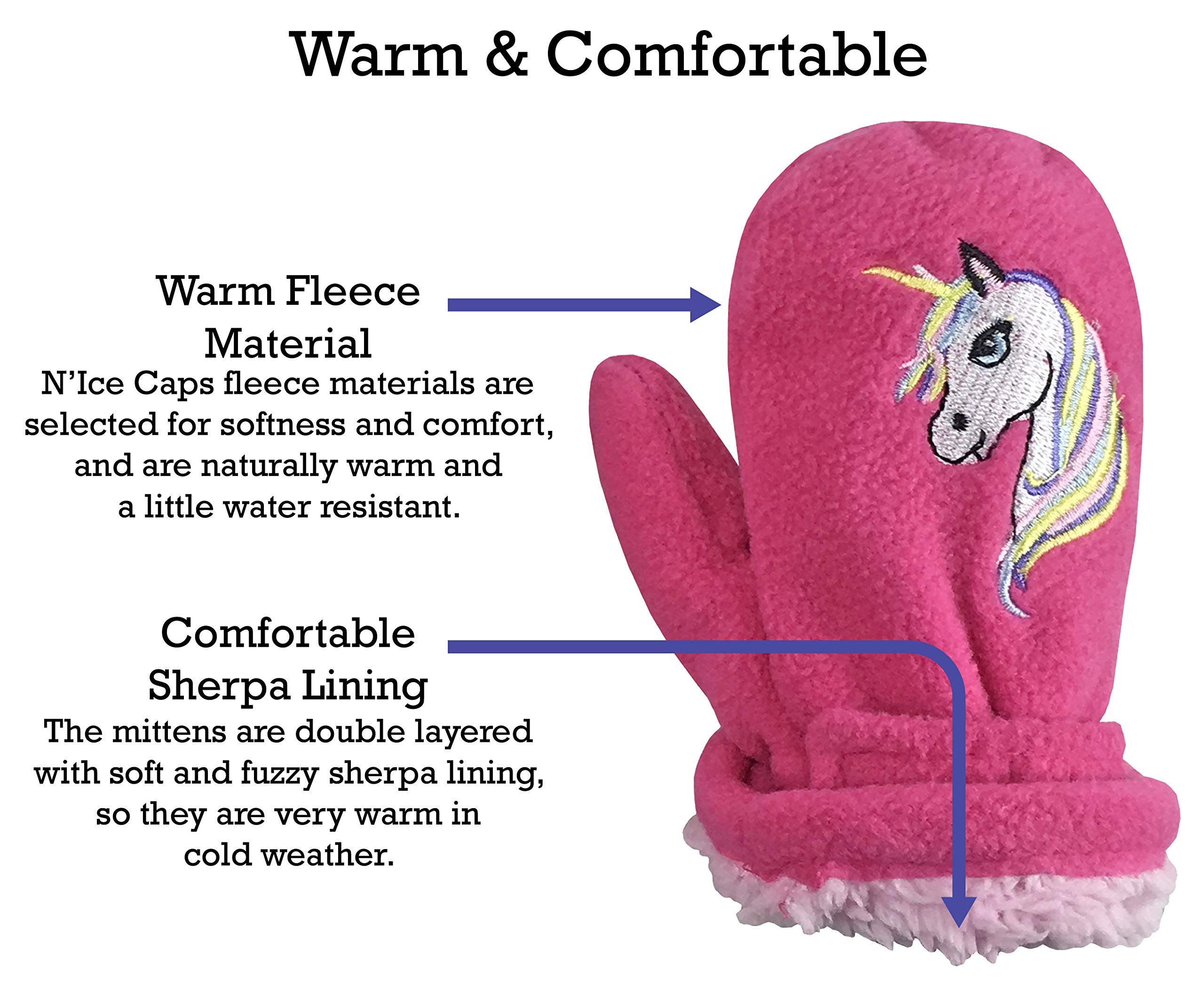 WARM AND COMFORTABLE SHERPA LINING: N'Ice Caps kids fleece materials are selected for softness and comfort and are naturally warm and a little water resistant. The mittens are double layered with soft sherpa lining, so they are very warm in cold weather