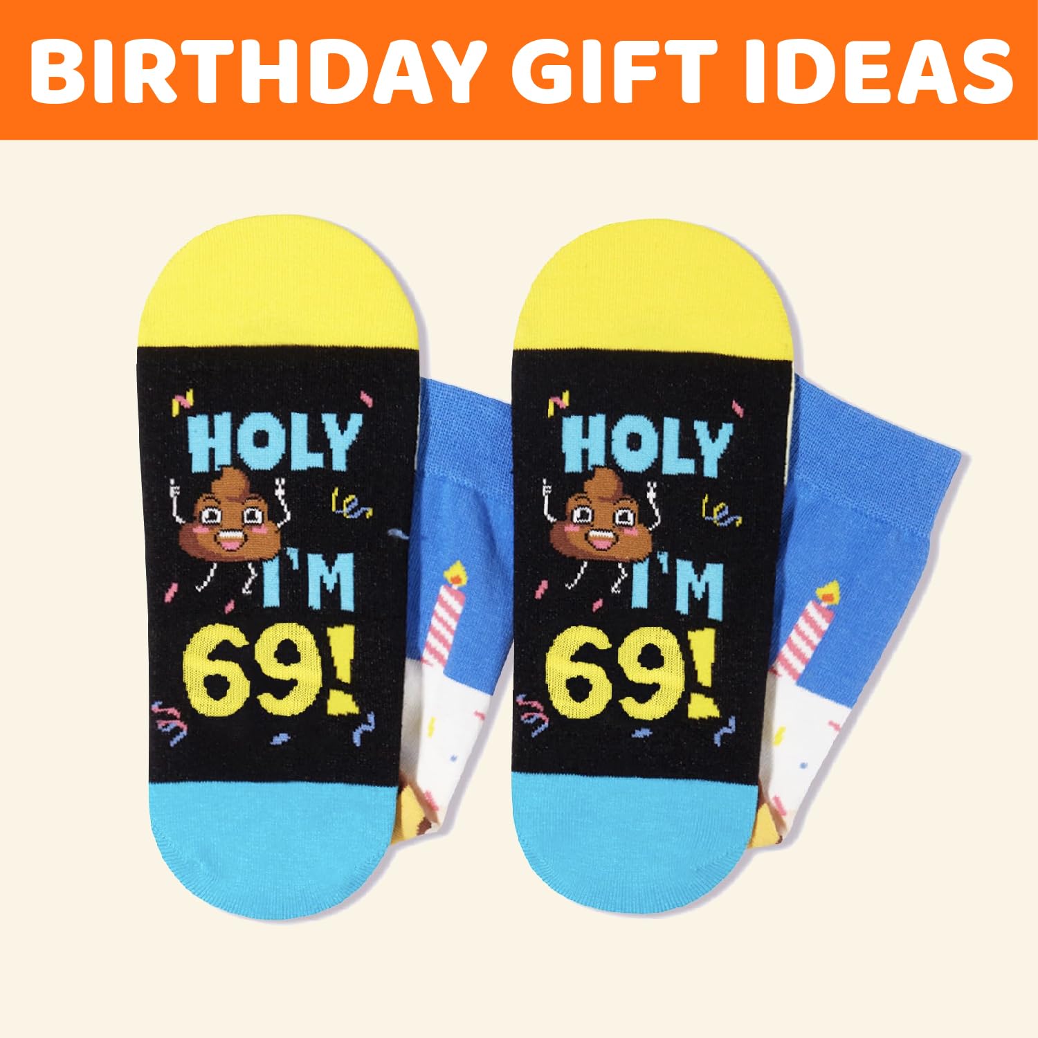 69TH BIRTHDAY GIFT IDEAS: These socks feature a cake and candle design on top, while the bottom is sewn with a fun message: "HOLY, I'M 69!". They are suitable for any holiday gifts, such as Birthday gifts, Christmas gifts, or White Elephant gifts.