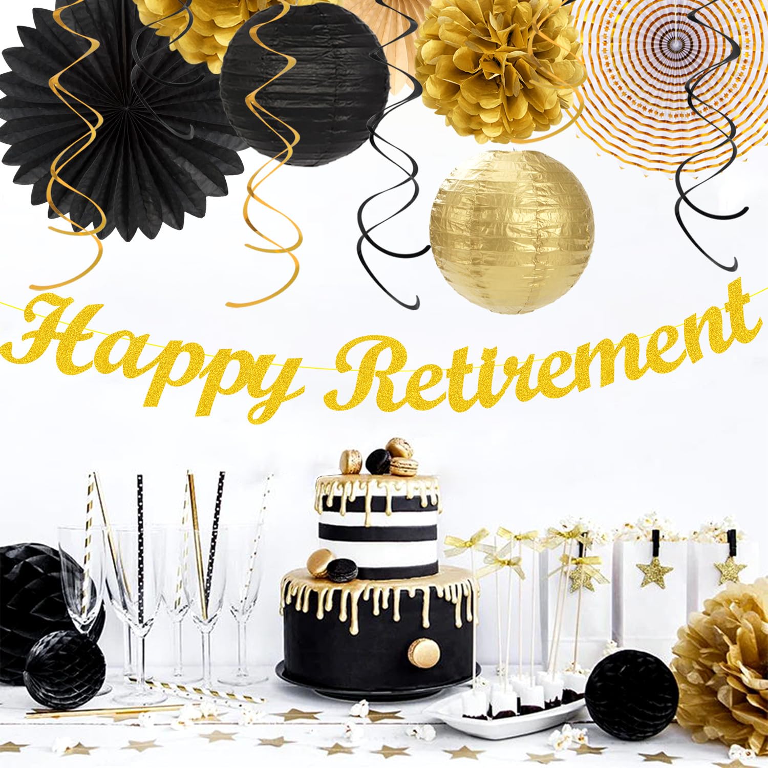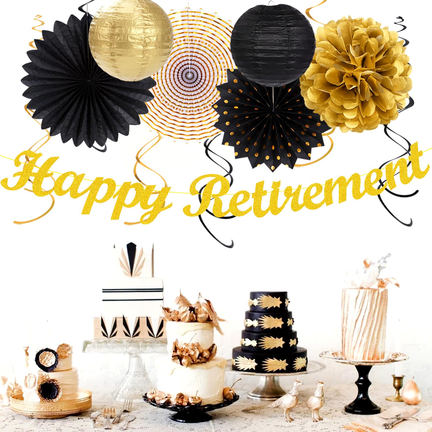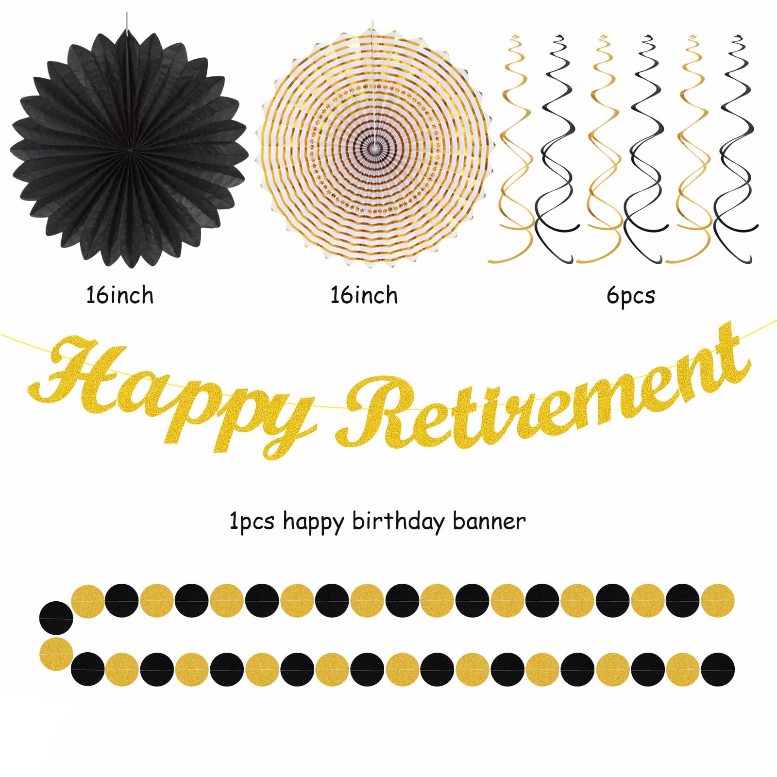 【Black Gold Retirement kits】This kits include 1pcs happy retirement banner, 1pcs circle dots paper banner, 4pcs tissue pom poms: 3pcs 10" and 1pcs 12" , 3pcs 8inch paper honeycom ball, 2pcs 8inch paper lantern, 4pcs 12inch paper flower fan, 6pcs Paper swirls hanging streamers