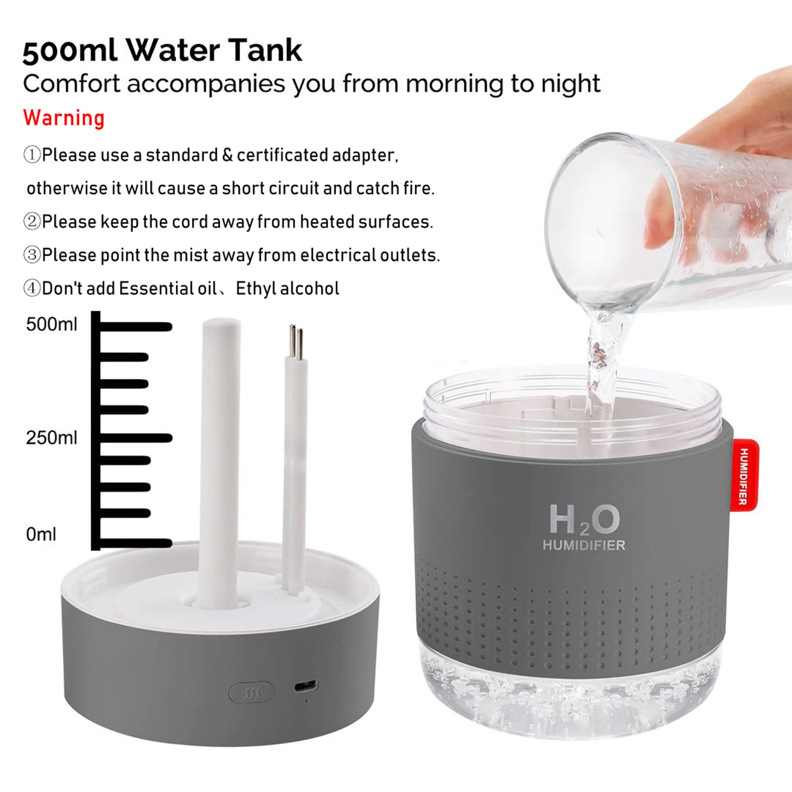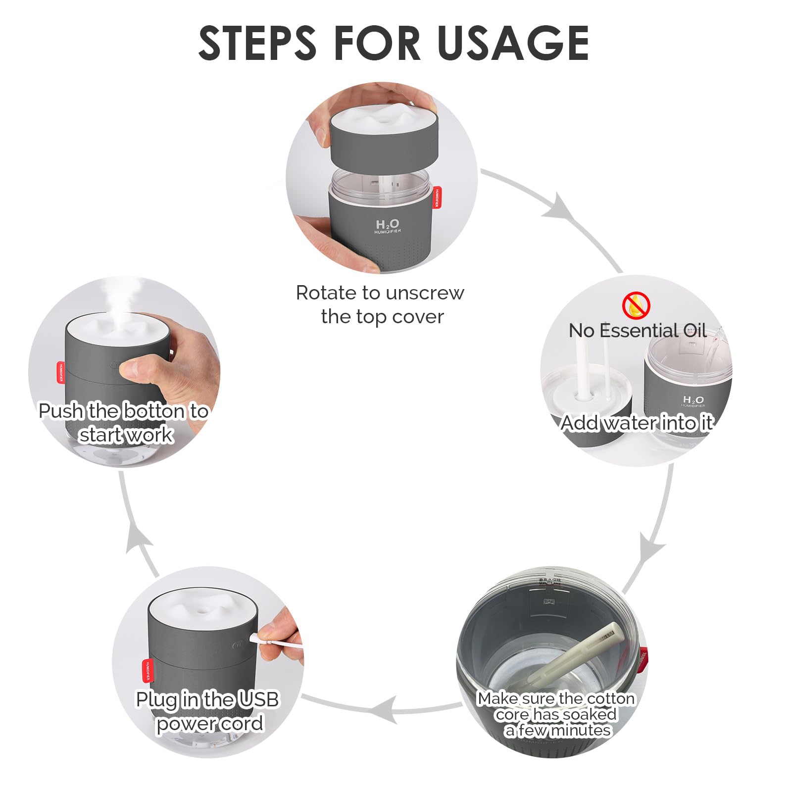 【TWO MIST MODES】This mini humidifier has two modes. When you press the button first time, it will continuously spray for 6 hours. When you press again and it will intermittently spray (stop 2 seconds) for 12 hours. 500ml large capacity produces longer mist.