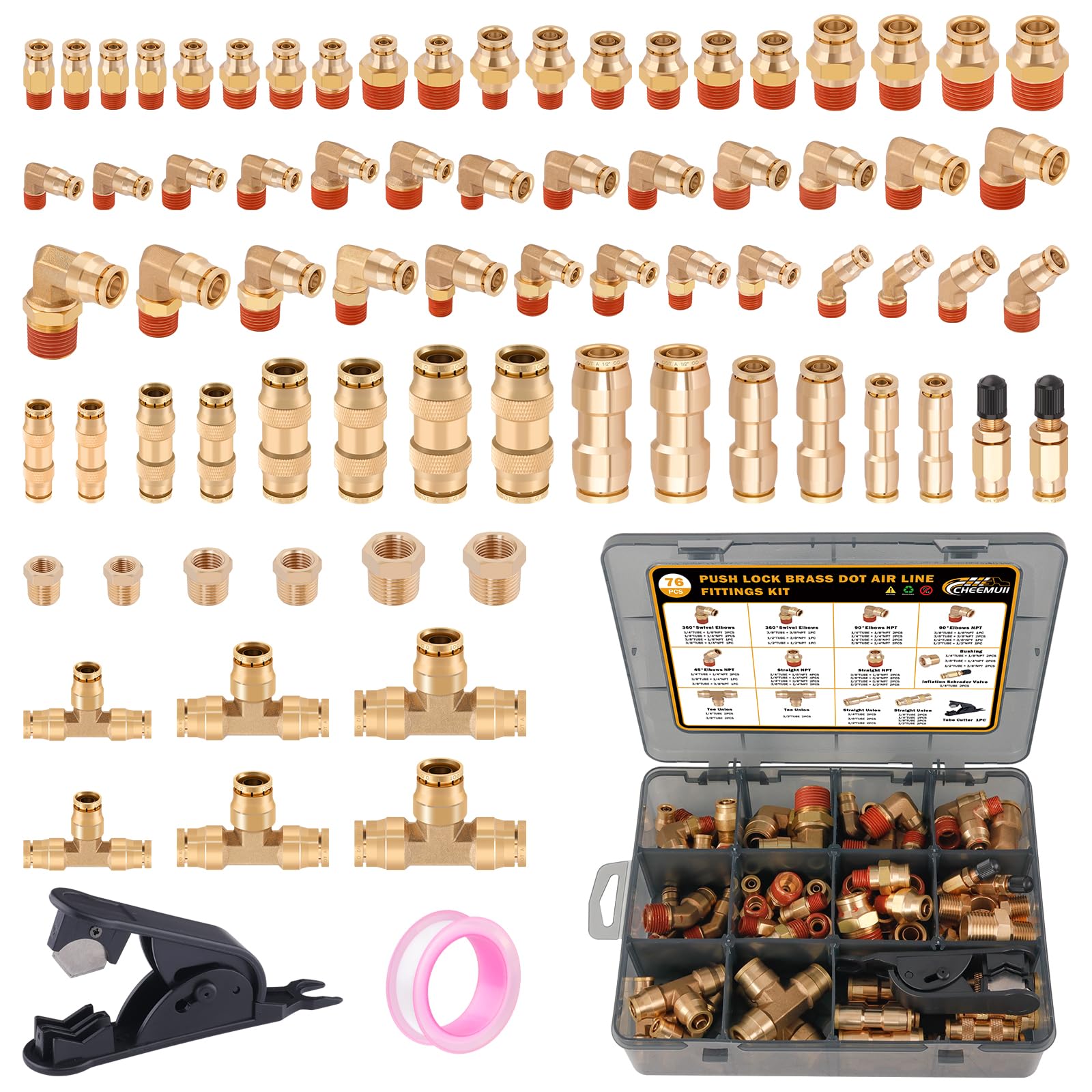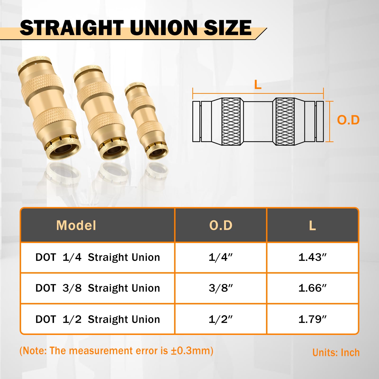23 PCS PACKAGE: The 23 pcs DOT air brake fittings kit includes: 8 pcs 1/4 inch straight union DOT fittings, 8 pcs 3/8 inch straight union DOT fittings, 6 pcs 1/2 inch straight union DOT fittings, 1 pc tube cutter. DOT quick connect fitting assortment types: 1/4", 3/8", 1/2"