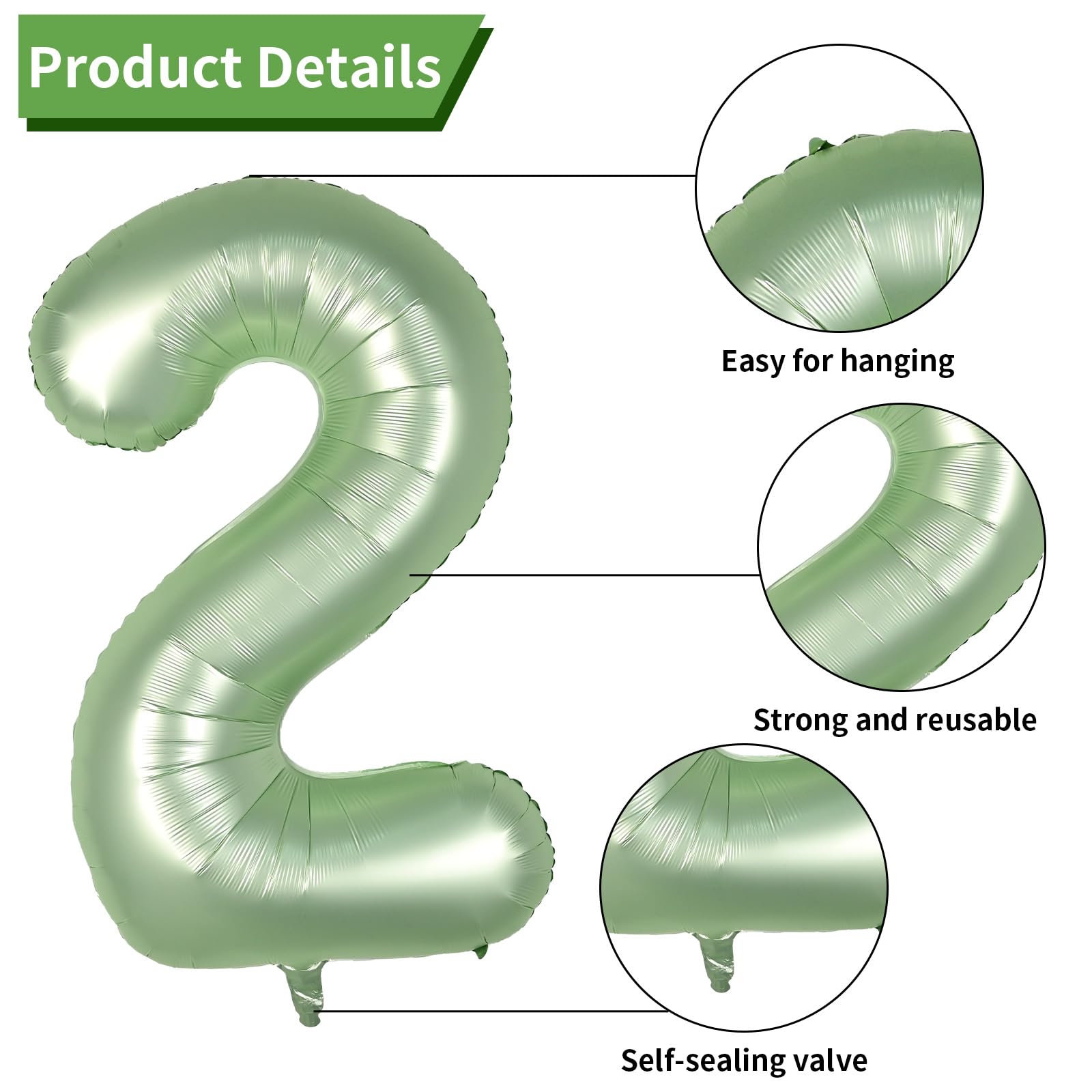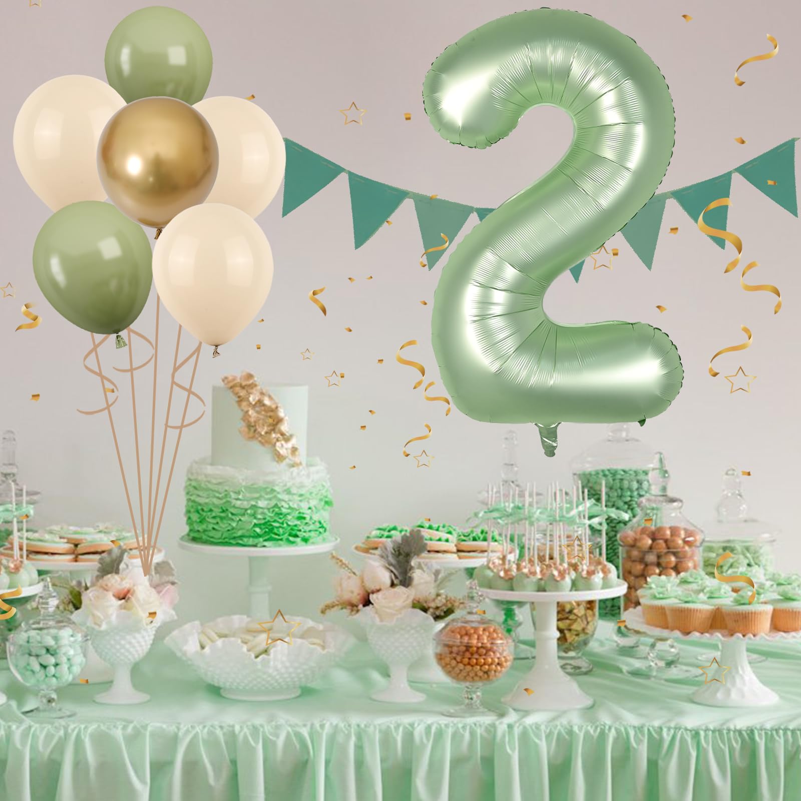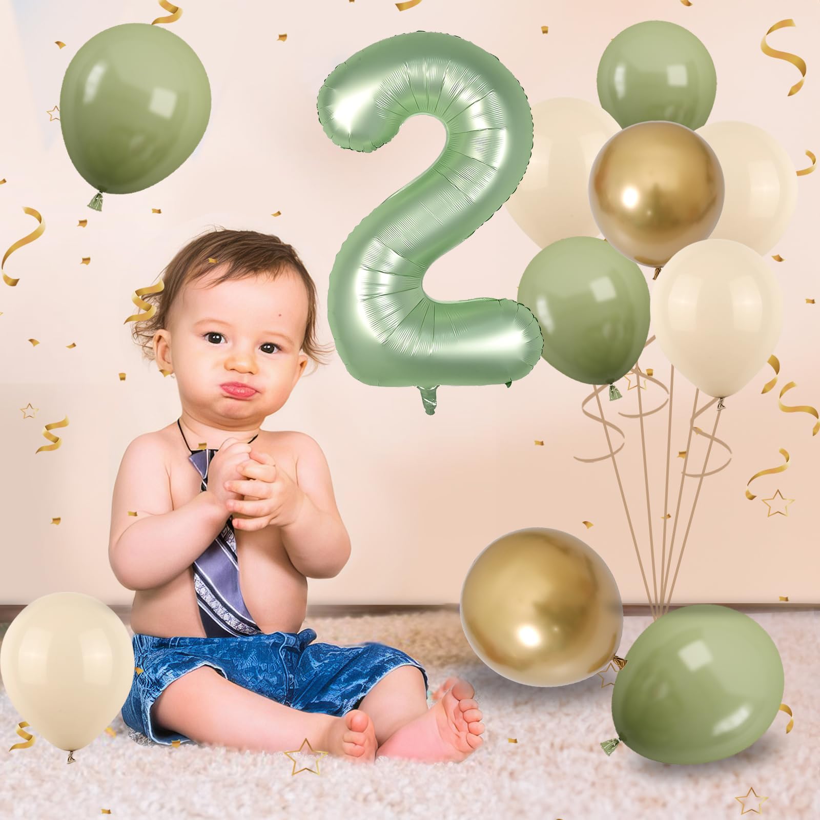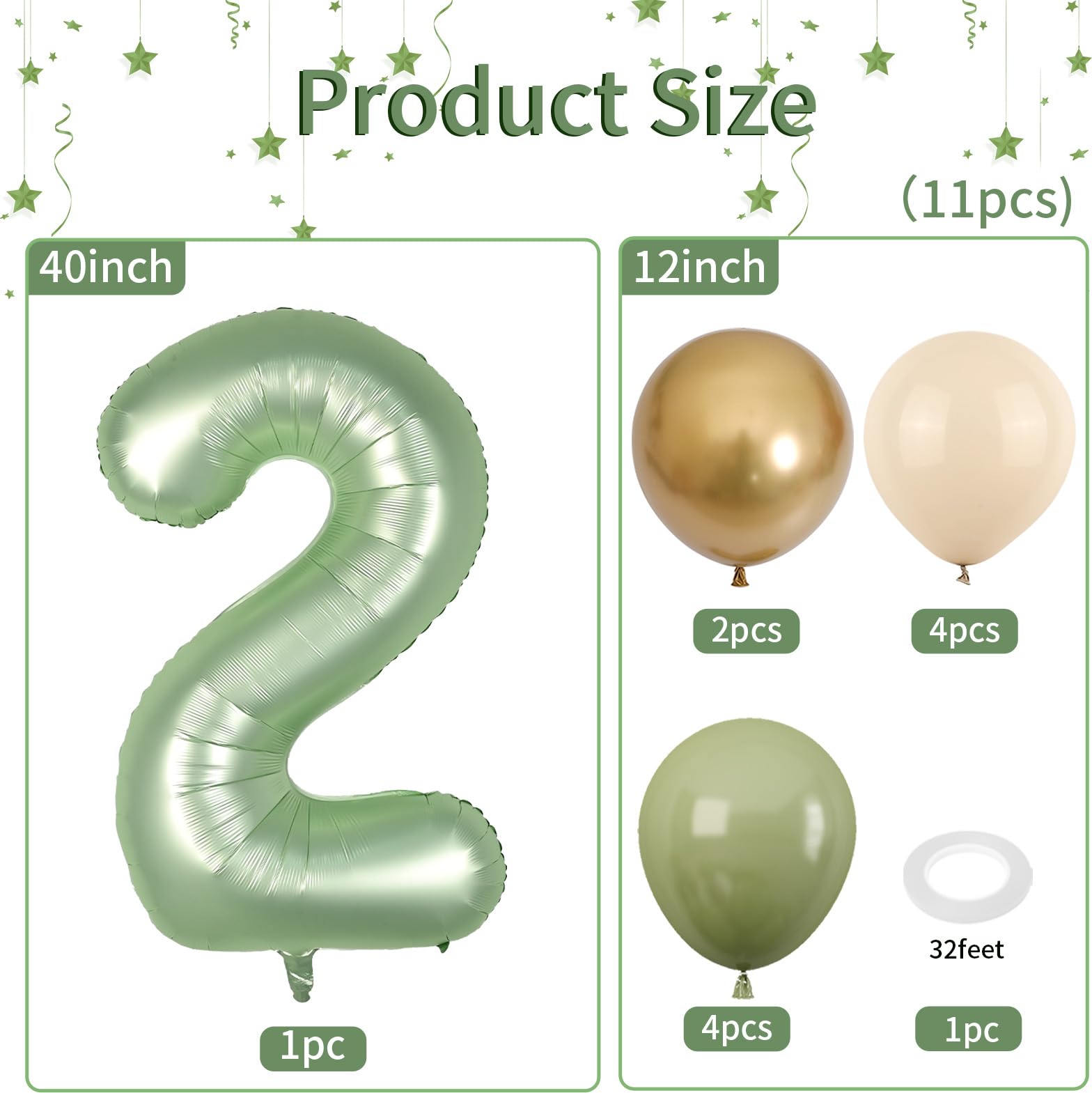 Product Contents: This 2nd birthday balloons set includes a 40 inch sage green number balloon, 4 pcs 12 inch sand white balloons, 4 pcs 12 inch sage green balloons, 2 pcs 12 inch metallic gold balloons, and 1 pc 32 feet of white ribbon