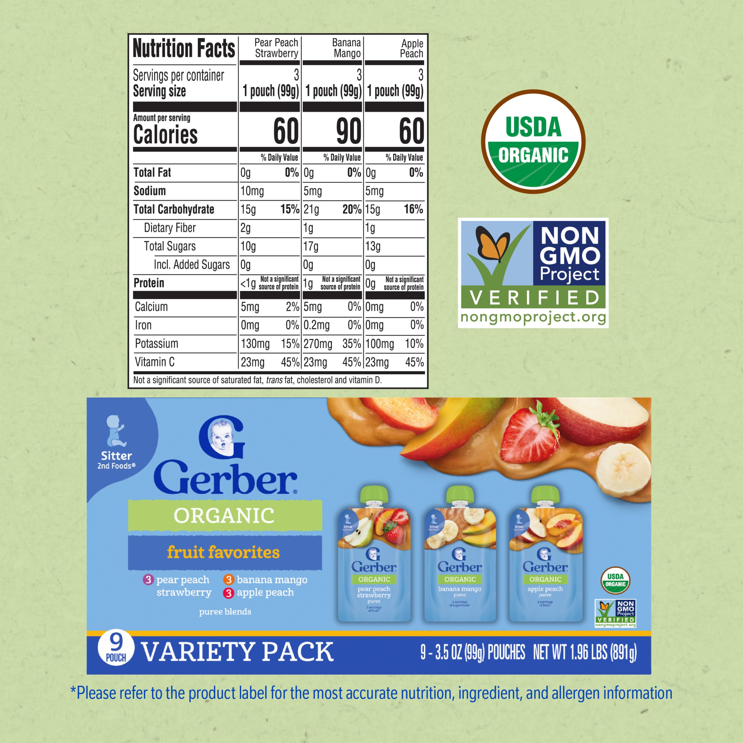Our Gerber Organic Fruit Favorites Puree Pouches Variety Pack is crafted with wholesome ingredients and strict quality standards just for babies, making them a premium choice for your little one. These stage 2 Gerber baby food pouches are designed for babies who are 6 months + and are ready to explore new textures and flavors, making them a great addition to your baby's diet. Gerber baby food understands the importance of providing wholesome food as your baby grows and develops, thatβs why these purees are made with real fruits. These organic baby food fruit pouches are Non-GMO Projected Verified and are an ideal choice for parents who seek quality in their baby's diet.