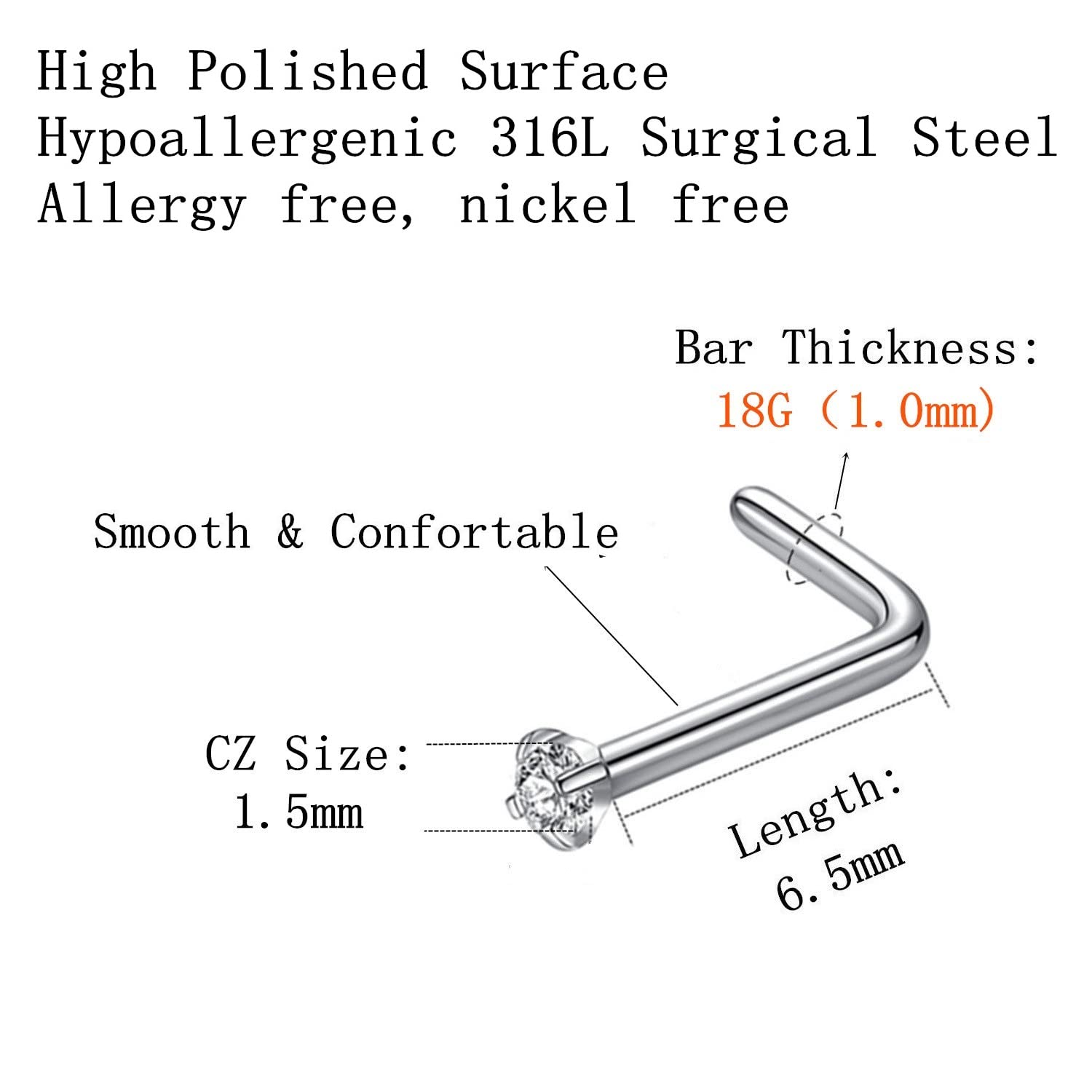 Quantity: 6pcs 1.5mm CZ nose stud. This L shaped nose studs for women size: Bar thickness: 18 gauge (1.0mm), Pin Length:6.5mm, Prong set cubic zirconia: 1.5mm, These stones a very bright and prong set by hand for accuracy.