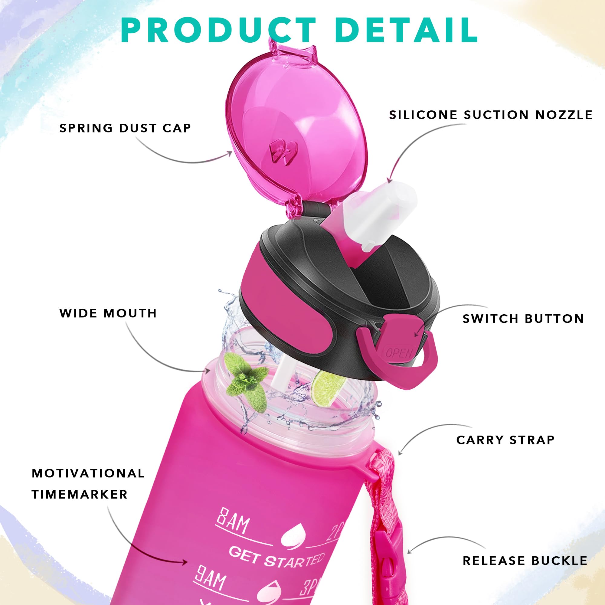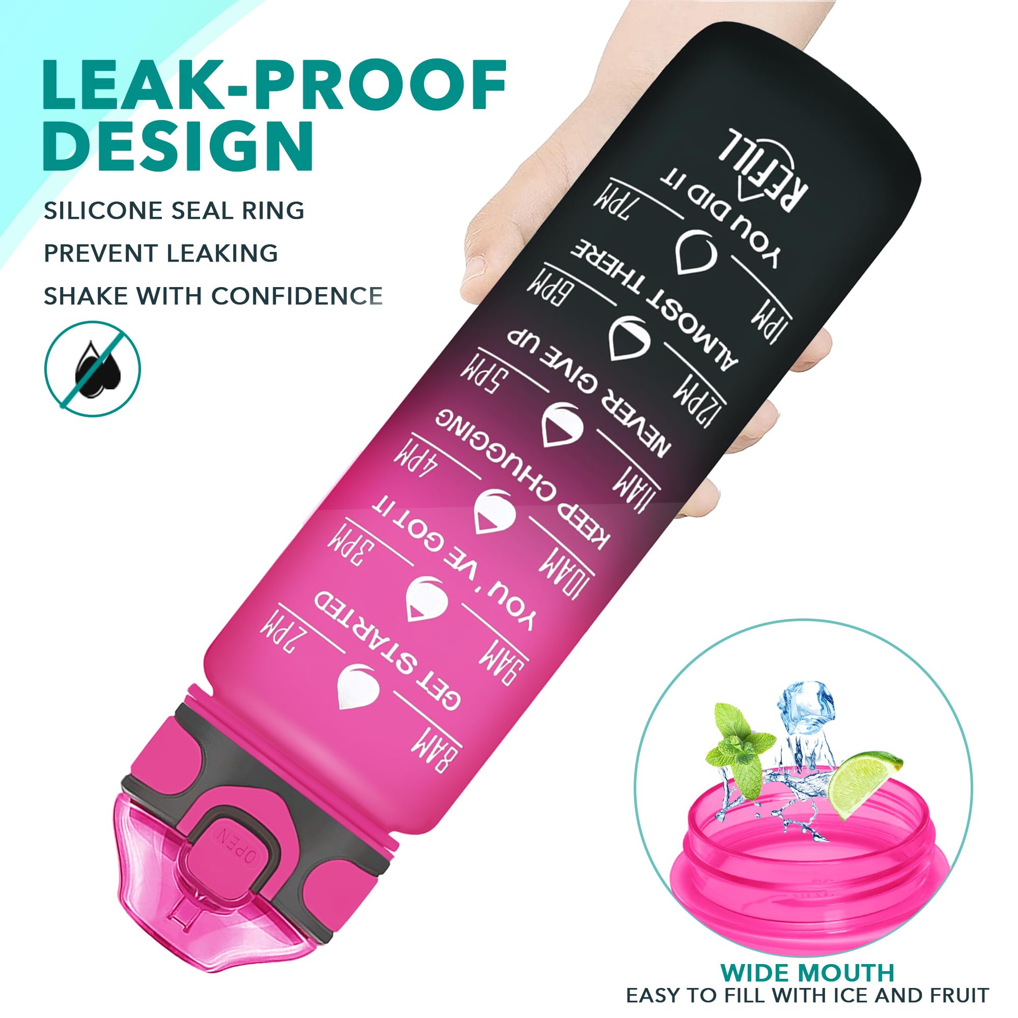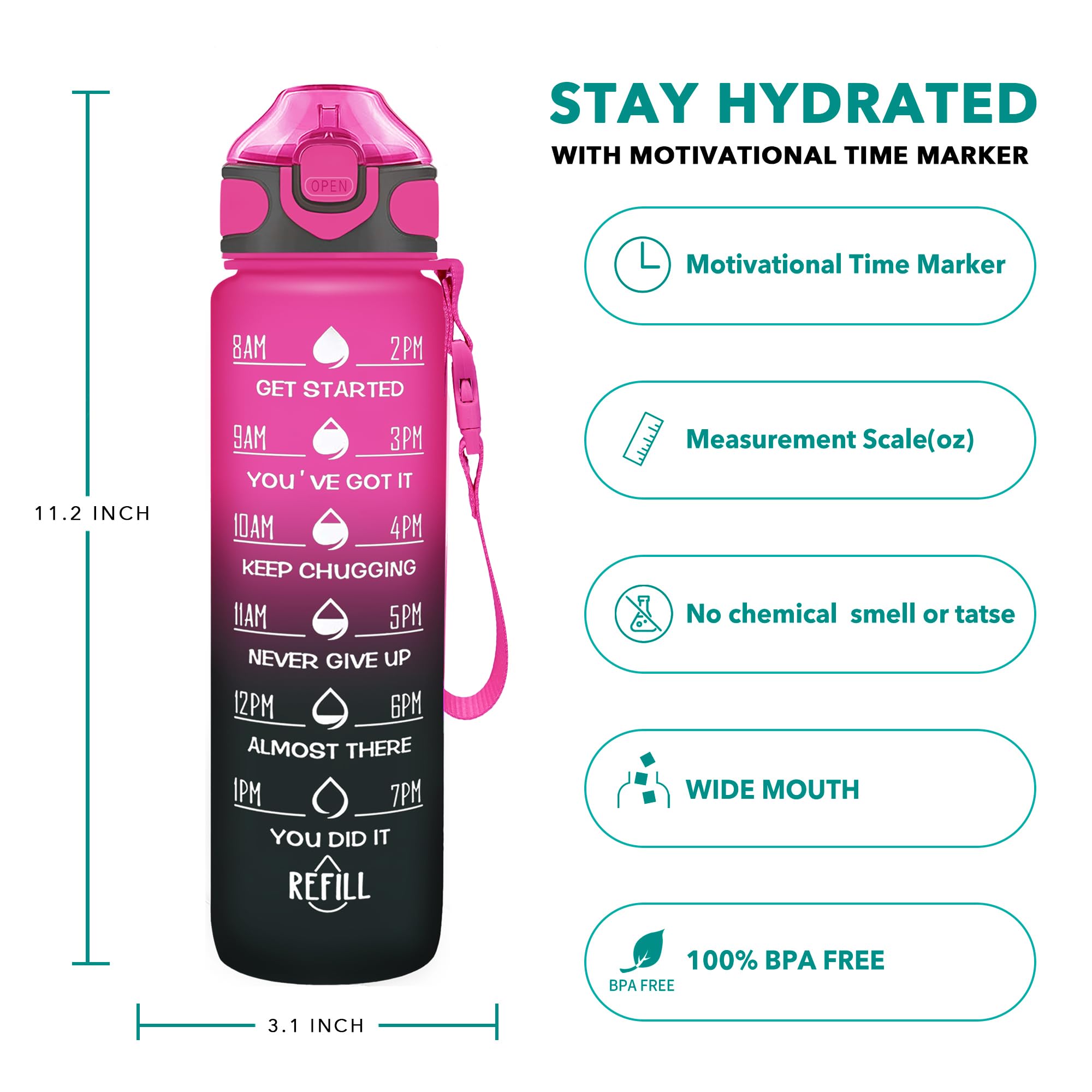 【Motivational Quote & Time Marker】32 oz water bottle with unique inspiration quote and time marker, reminding you to stay hydrated. The capacity marker helps you tracking daily water intake. A silicone straw makes you enjoy spill-proof sipping without effort. A necessary have for people of different occupations such as athletes and white-collar workers.