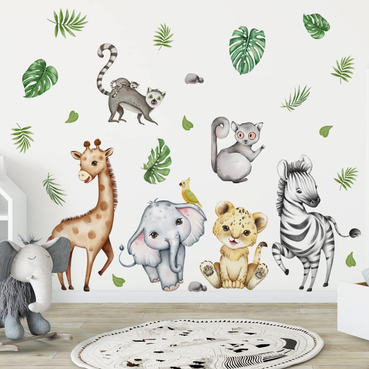 Watercolor Jungle Animal Decals - Forest Safari Elephant Tiger Giraffe Stickers for Baby Nursery, Playroom, Bedroom, Classroom, Kindergarten Wall Decor