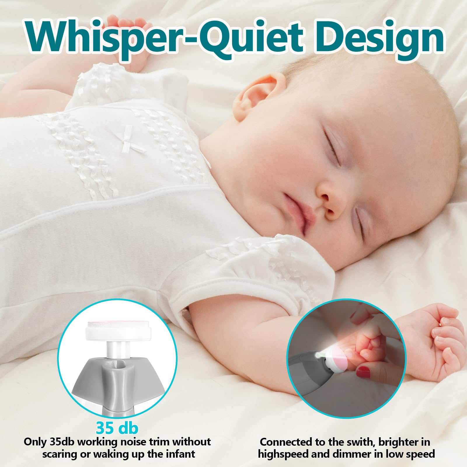 Low Noise – The Baby electric nail trimmer is equipped with a whisper-quiet design. Only 35dB operating sound. You can file nails even as the baby sleeps, without causing any disturbance. You can use it in the dark at night.