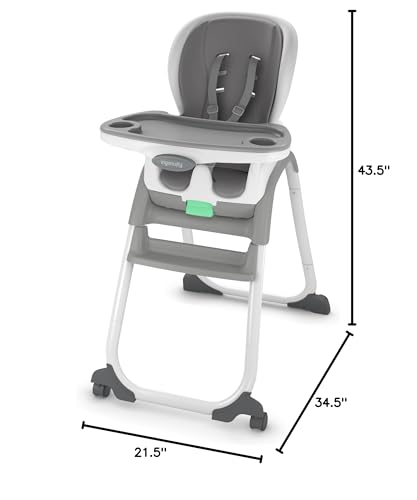 Easy to clean features such as the dishwasher-safe main tray and mini tray; harness and straps are machine washable; full high chair assembled dimensions 43.5" x 34.5" x 21.5" with 2 wheels for easy mobility