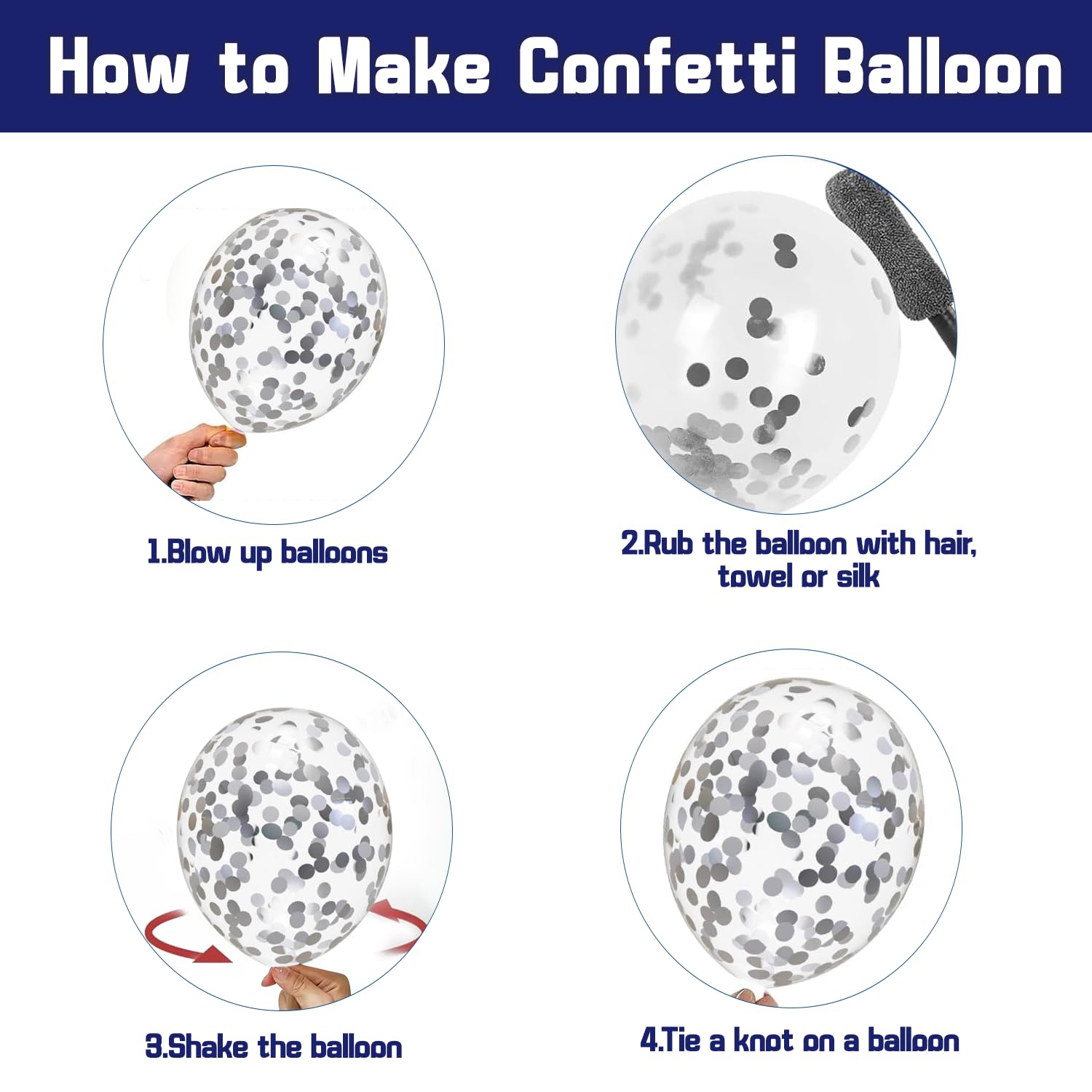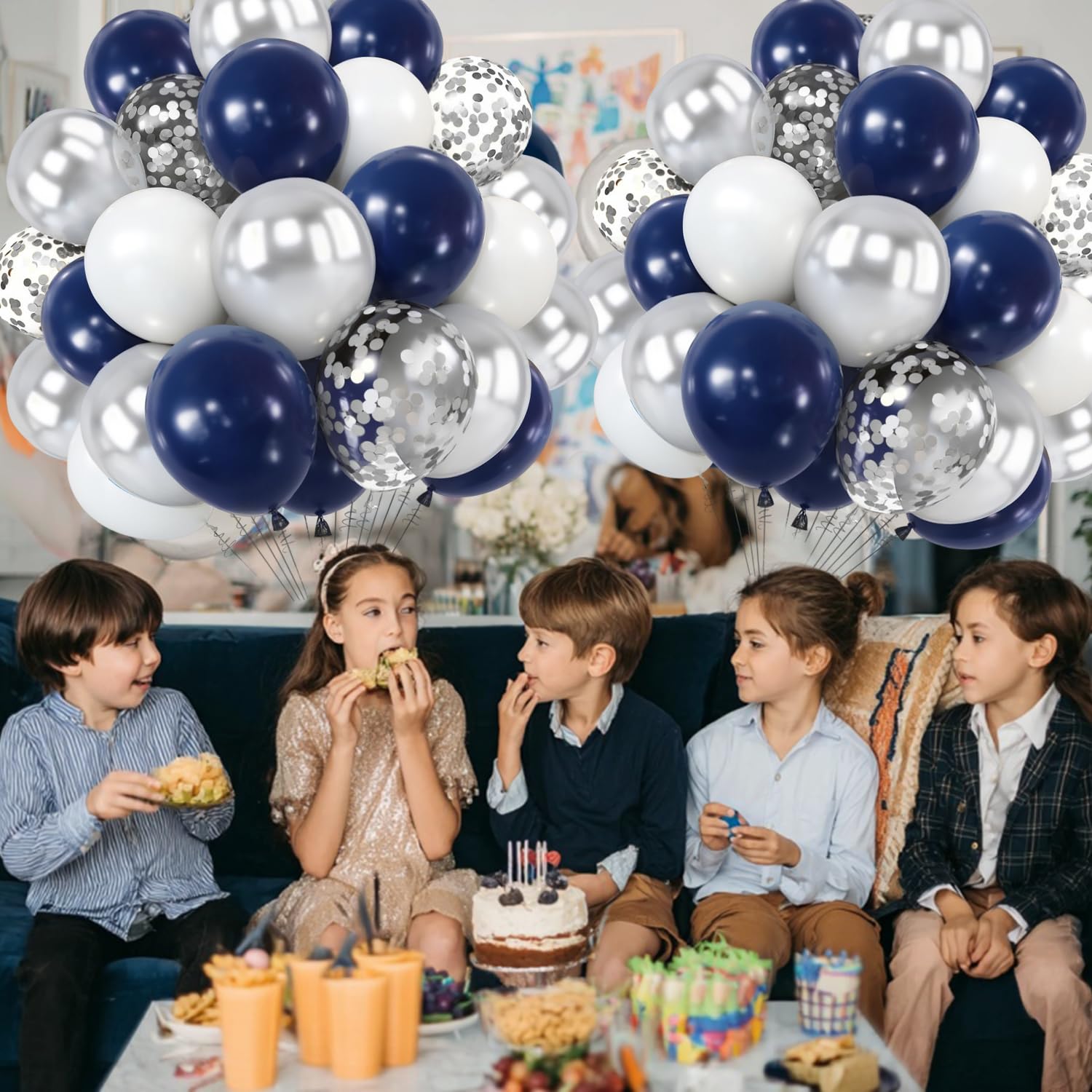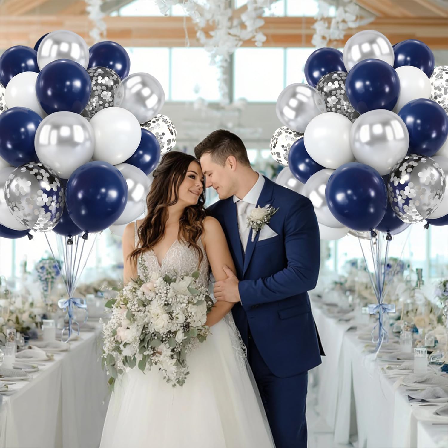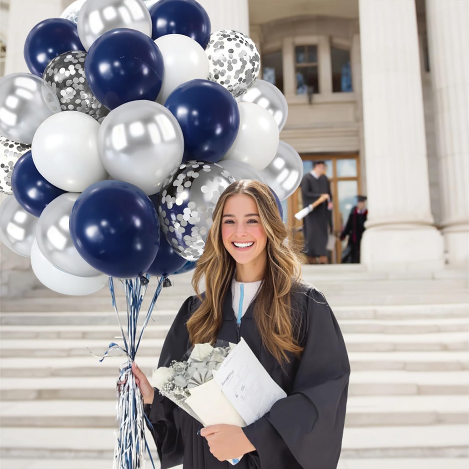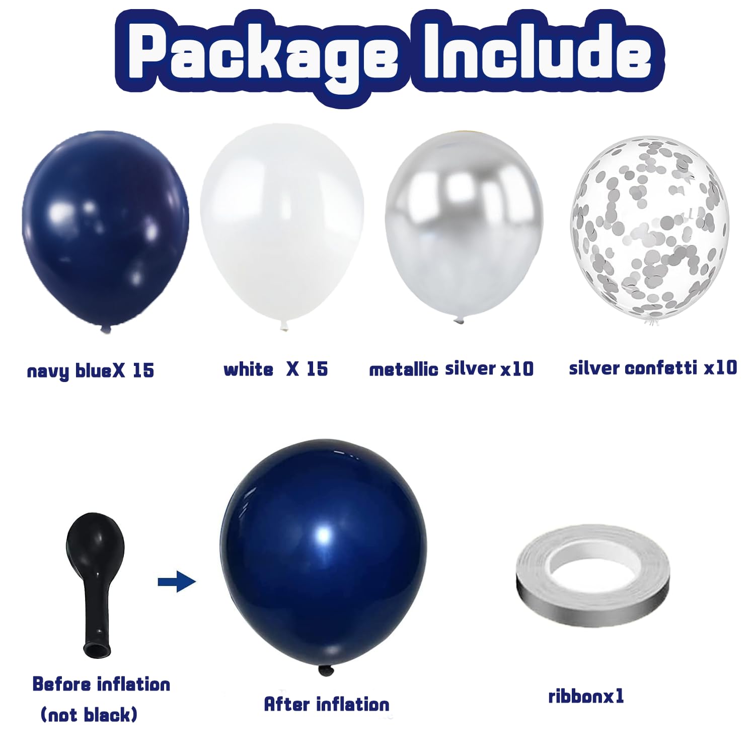 Blue Silver Balloons: 50pcs 12 inch navy blue white silver balloon kit includes: 15pcs navy blue balloons, 15pcs white balloons,10pcs metallic silver balloons, 10pcs silver confetti balloons and11 roll of silver ribbon.Blue and silver balloons will add color and unique charm to your party