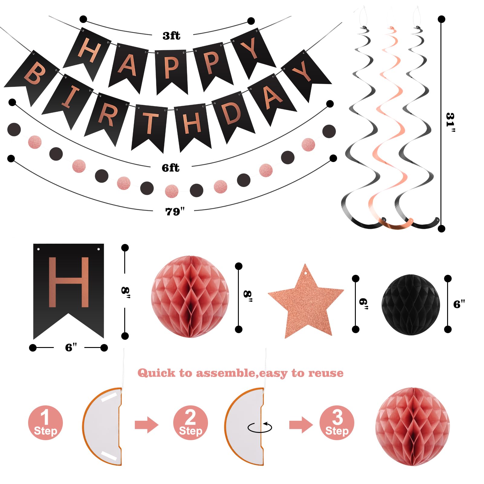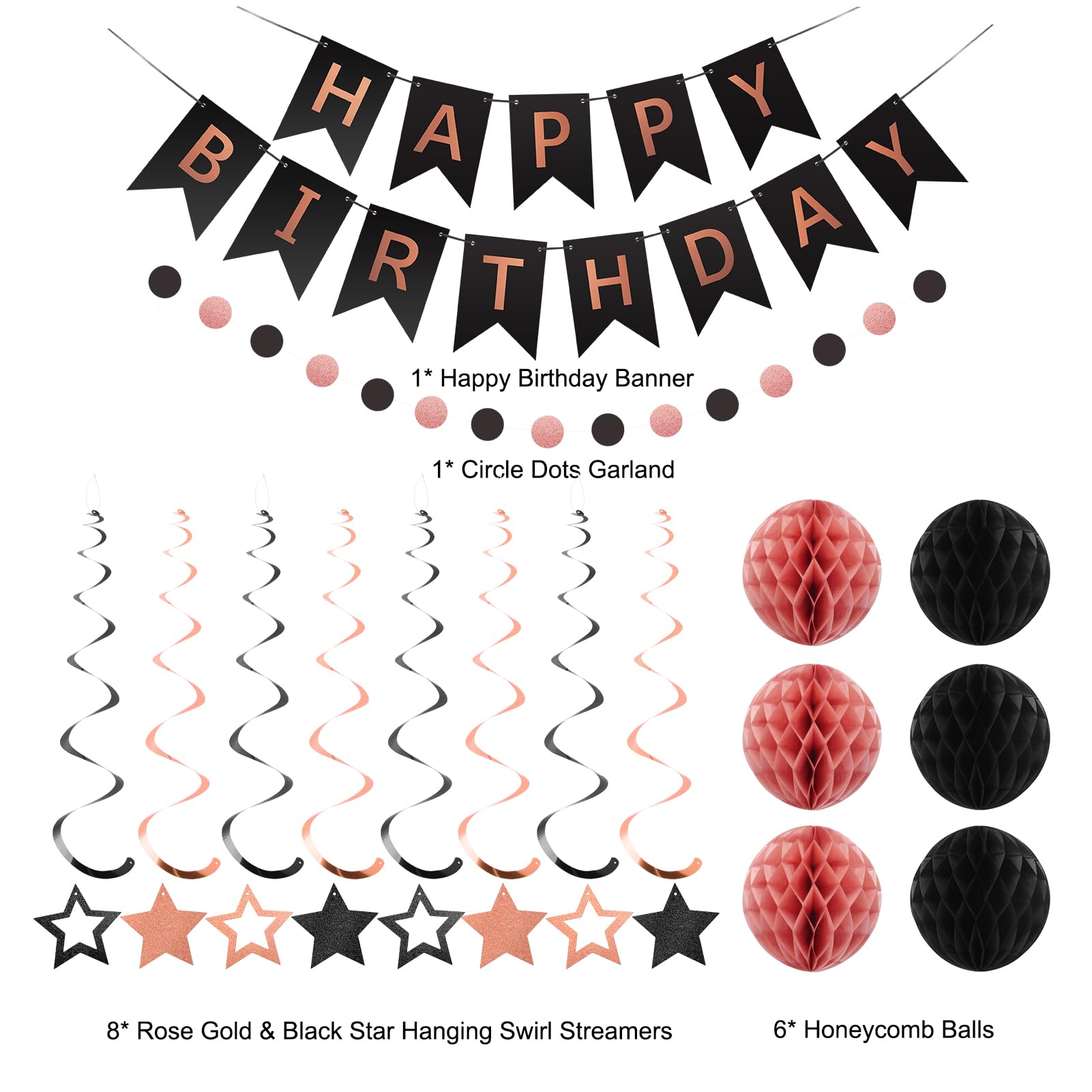 Package Including: With our Birthday Party Decorations package, you'll have everything you need to create the perfect party atmosphere. You can get 1pcs Happy Birthday Banner, 12pcs Honeycomb Balls, 16pcs Stars Swirls Streamers, and 1pcs Circle Dots Decorations. No need to worry about running around and finding individual items. It's convenient package.