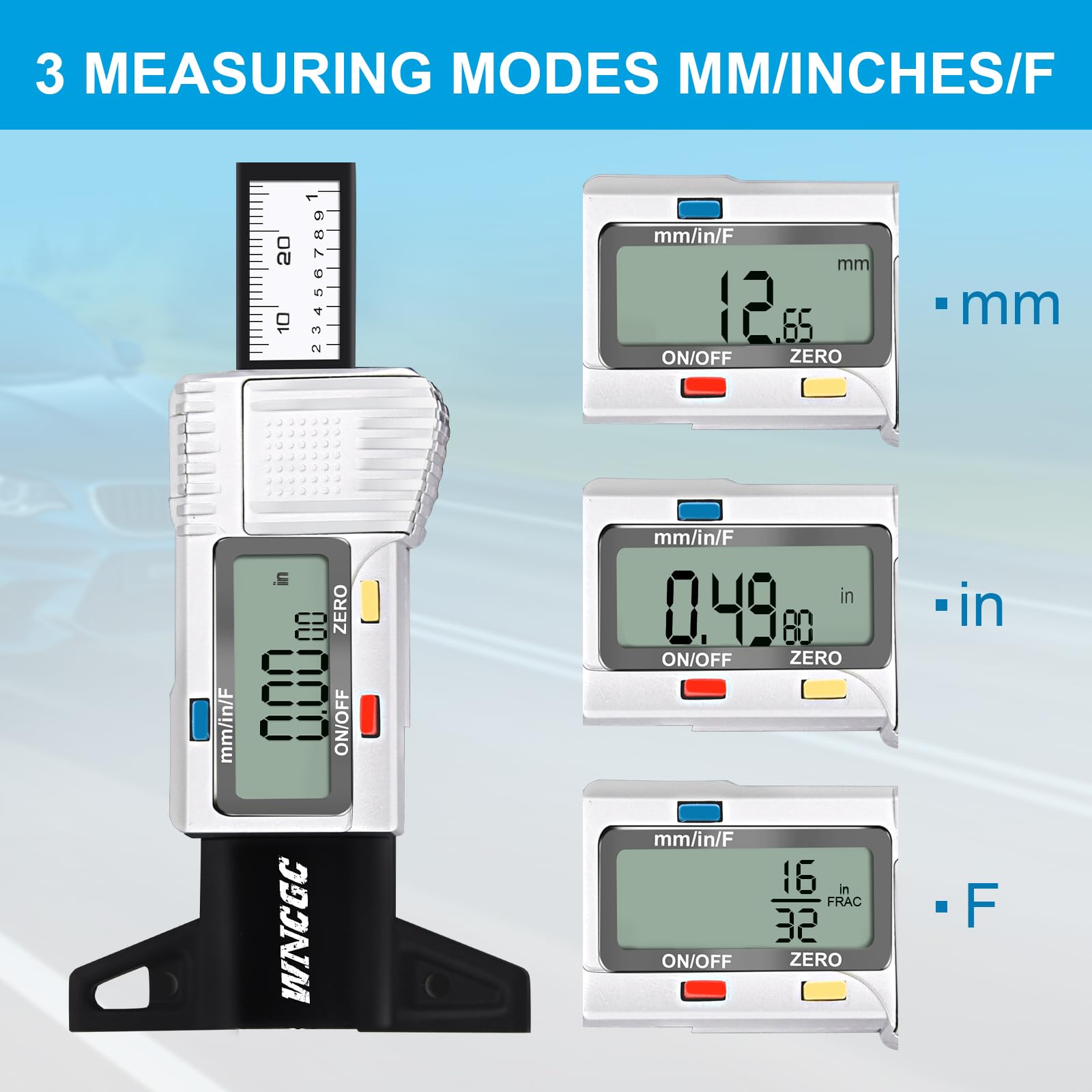 3 MODES Tire Depth Gauge --- Fractional Inch, Decimal Inch and Millimeter. Readable range - able to show tread depth from 0-25.4mm in metric or 0-1-inch in sae (32/32-inch).