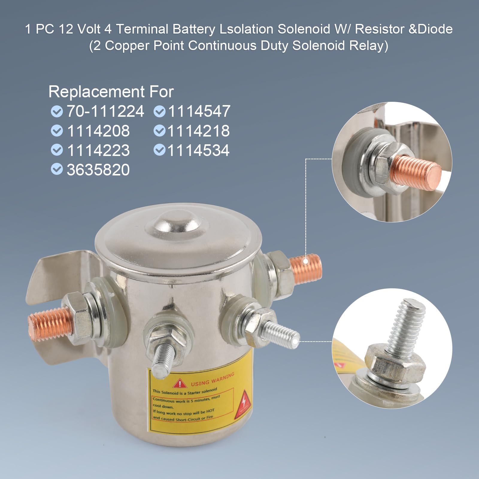 ✦ 【Replaces Parts Number】70-111224,3635820, 1114208, 1114218, 1114223, 1114534, 1114547. ✦【Package includes】: 1 PC of 12V 4 Terminal battery isolation solenoid W/ Resistor &diode.