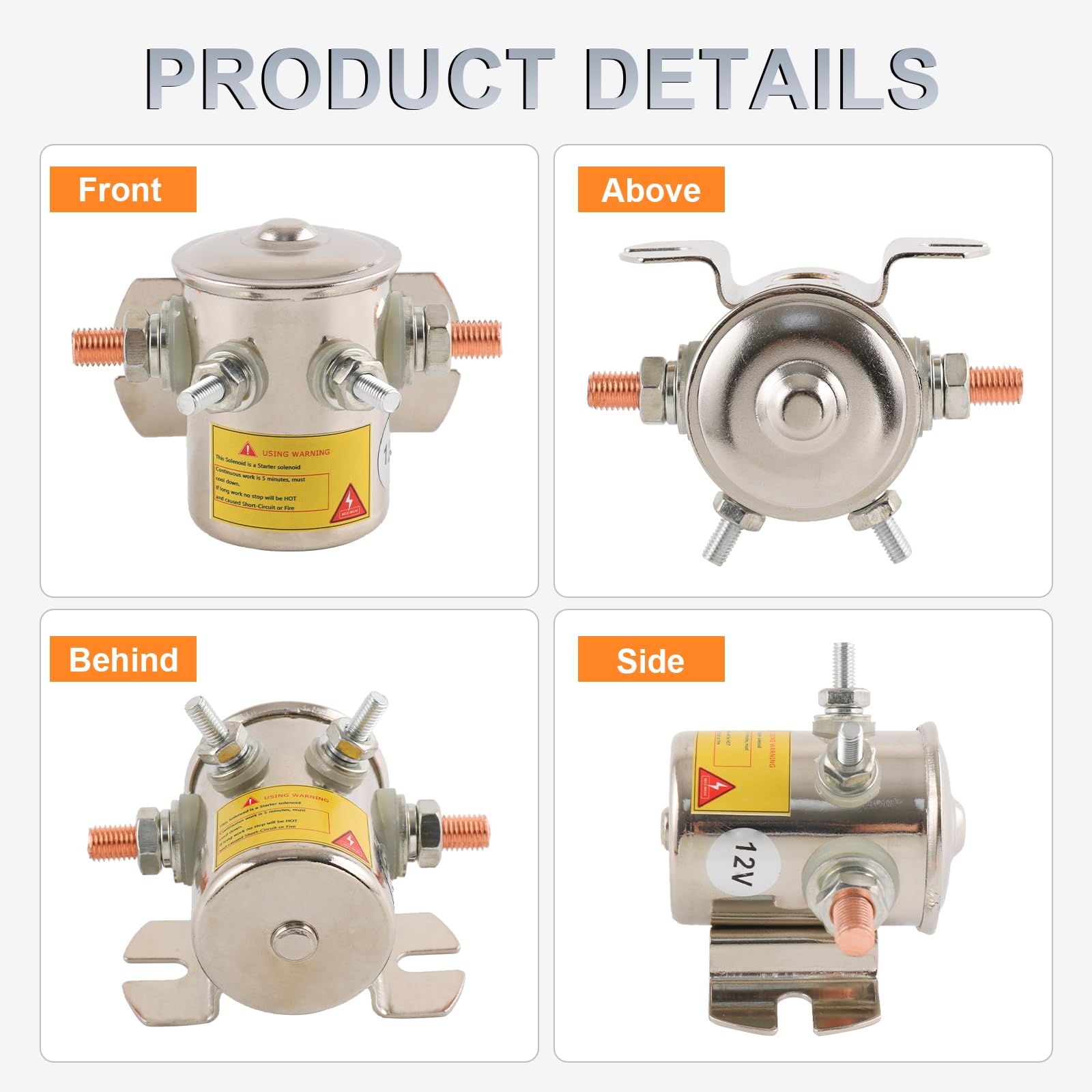✦ 【Materials】4 Terminal Max 300A 12 Volt With 2 Copper Point Continuous Duty Solenoid Relay ,The The electromagnetic relay adopts high-quality components, Coil Roll is using 180℃ copper wire, Cover is Nickel-Plating, Meet Environmental Plating Requirment. The Nickel-Plating outer layer and the inside of the canned coil, suitable for use in any environment