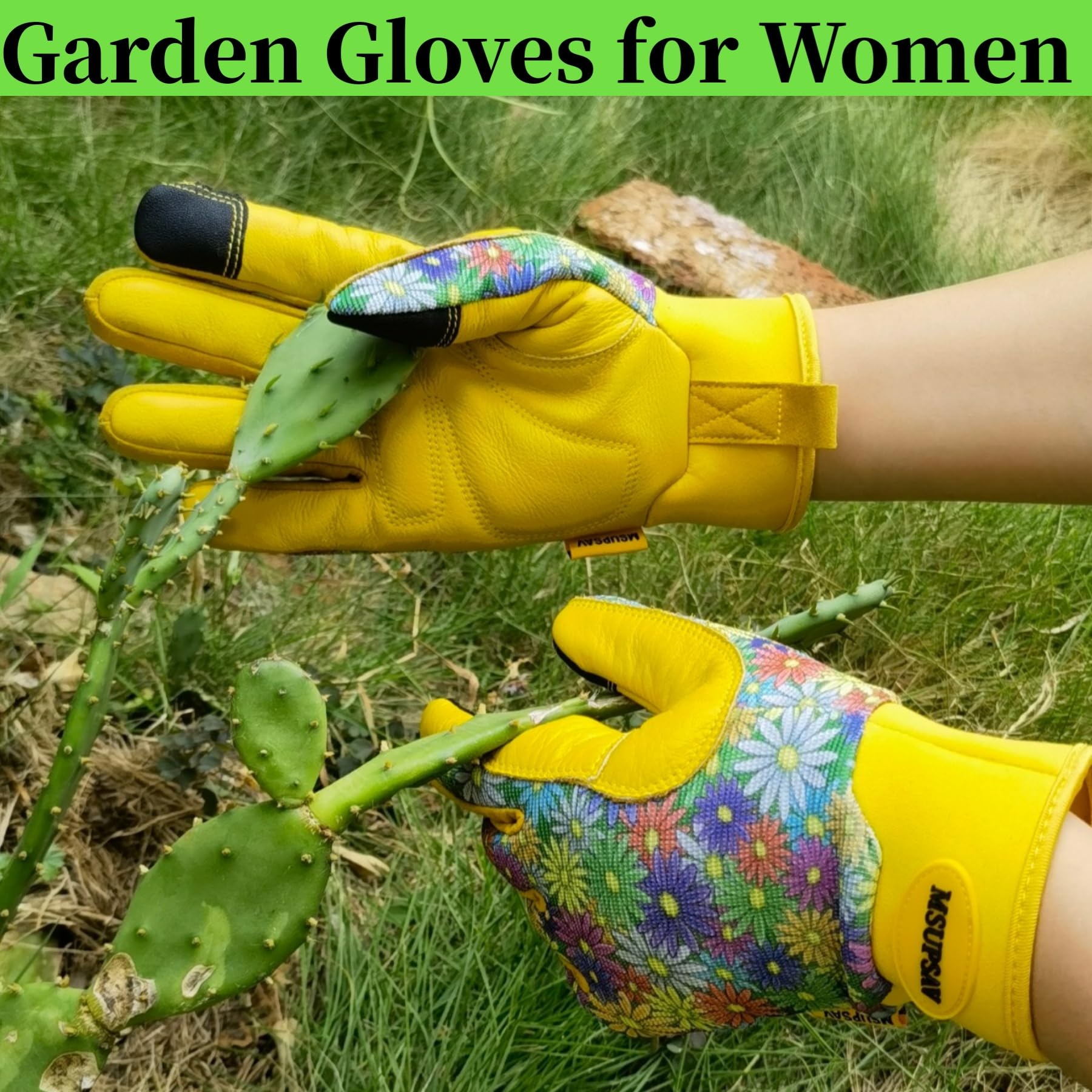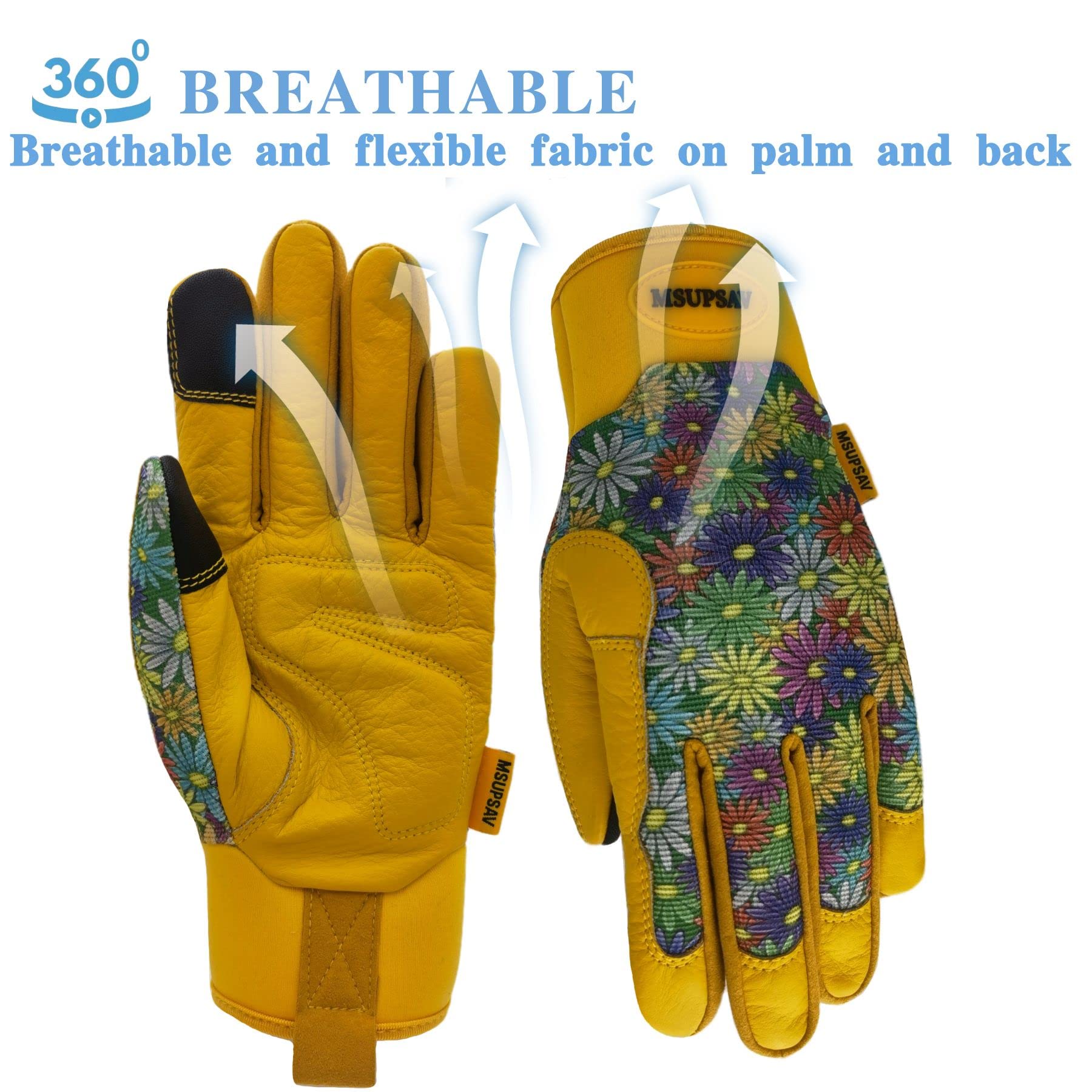【MSUPSAV GARDEN GLOVES FOR GARDENING】Stretchable double-layer spandex design back keep your hands flexible,breathable&comfortable on the job. Leather with foam padded palm and reinforced fingertips increase durability.Supportive adjustable with hook& loop strips closure cuff for snug secure fit.