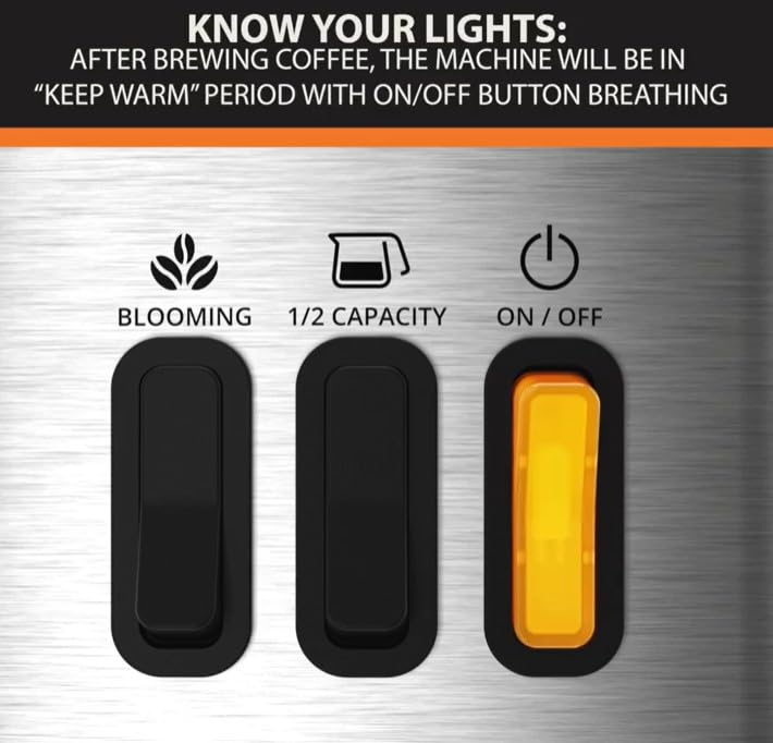 KEEP-WARM & DESCALING SIGNALS: A slow, soft breathing light on the ON/OFF button means Keep-Warm is active and your coffee stays hot for up to 2 hours. A fast, bright blinking light means itβs time to descale. Simply run the descaling cycle and rinse to clear the alert.