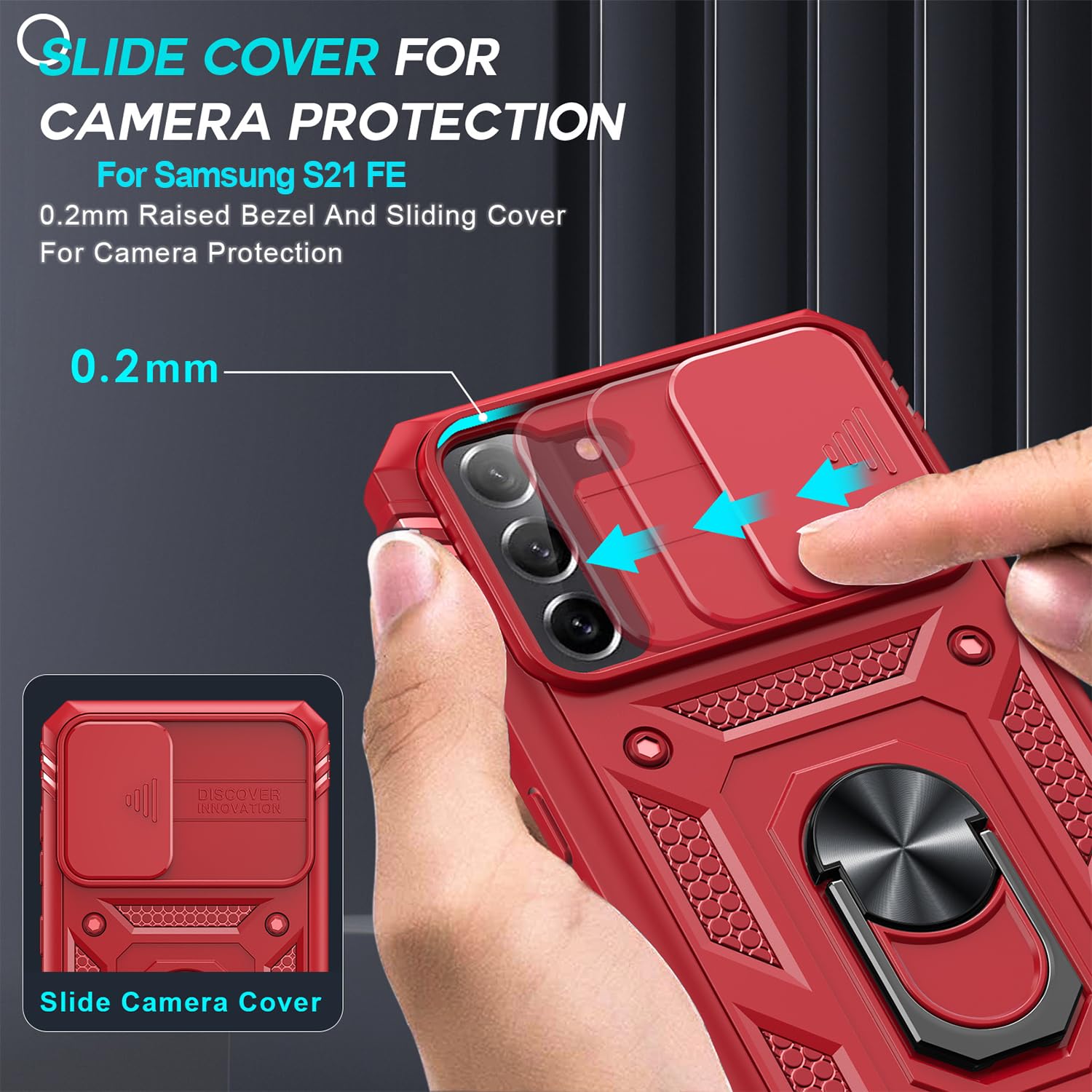 Slidable Camera Lens Cover: The phone case S21 FE Samsung upgraded anti-scratch sliding camera protector protects your phone's camera lens from scratches, bumps, scratches, knocks, bumps and any other mishaps, and prevents dust build-up while maintaining its original responsiveness